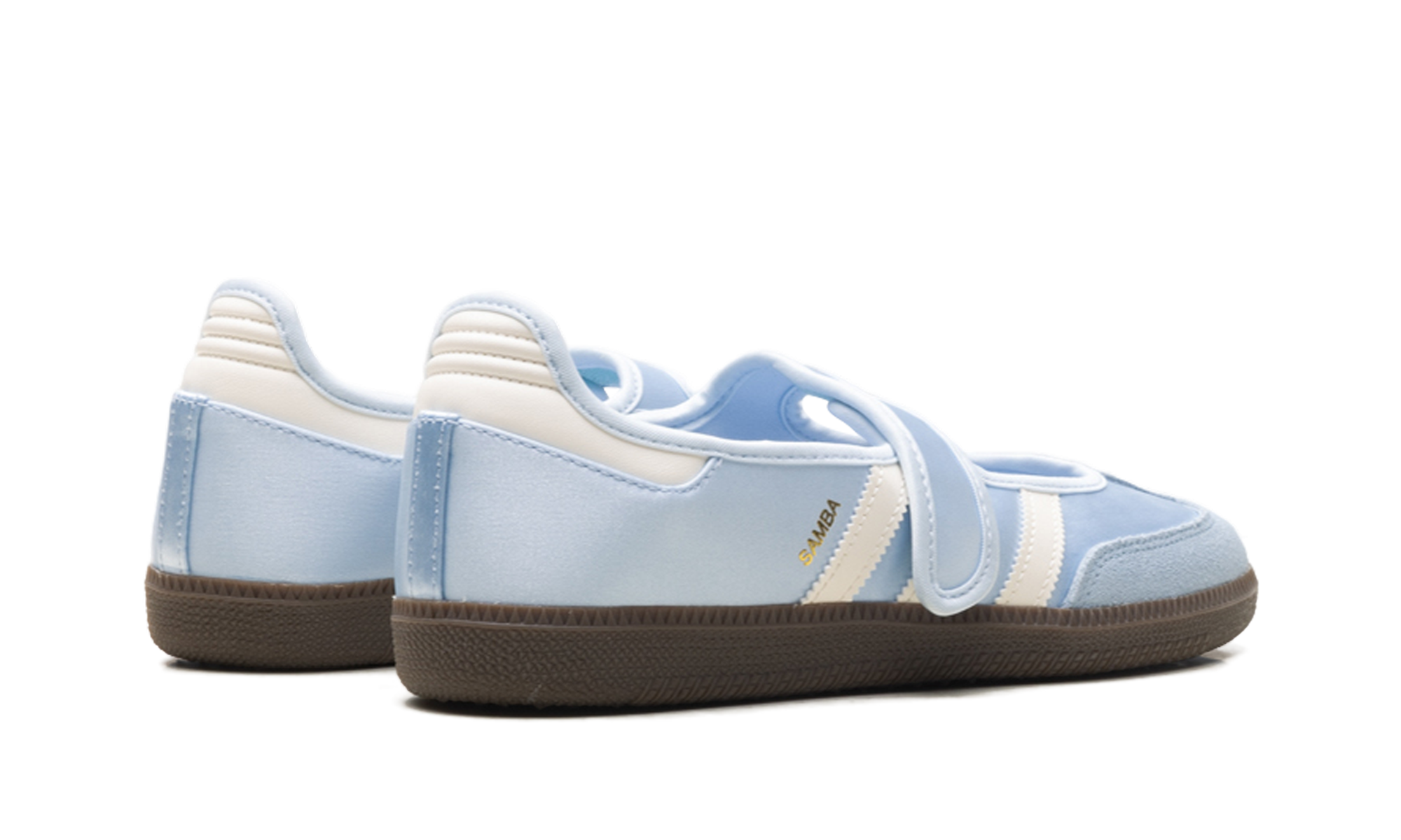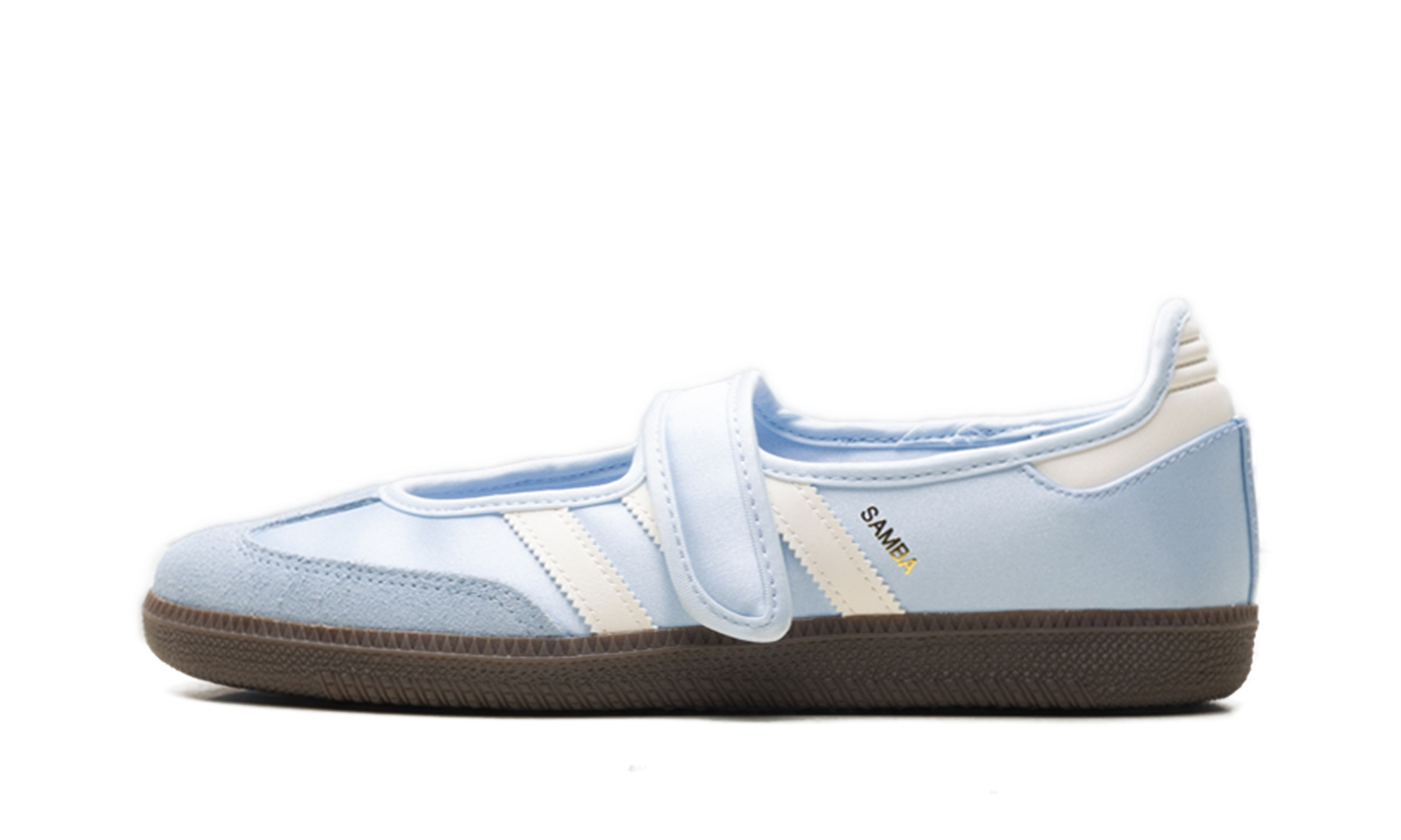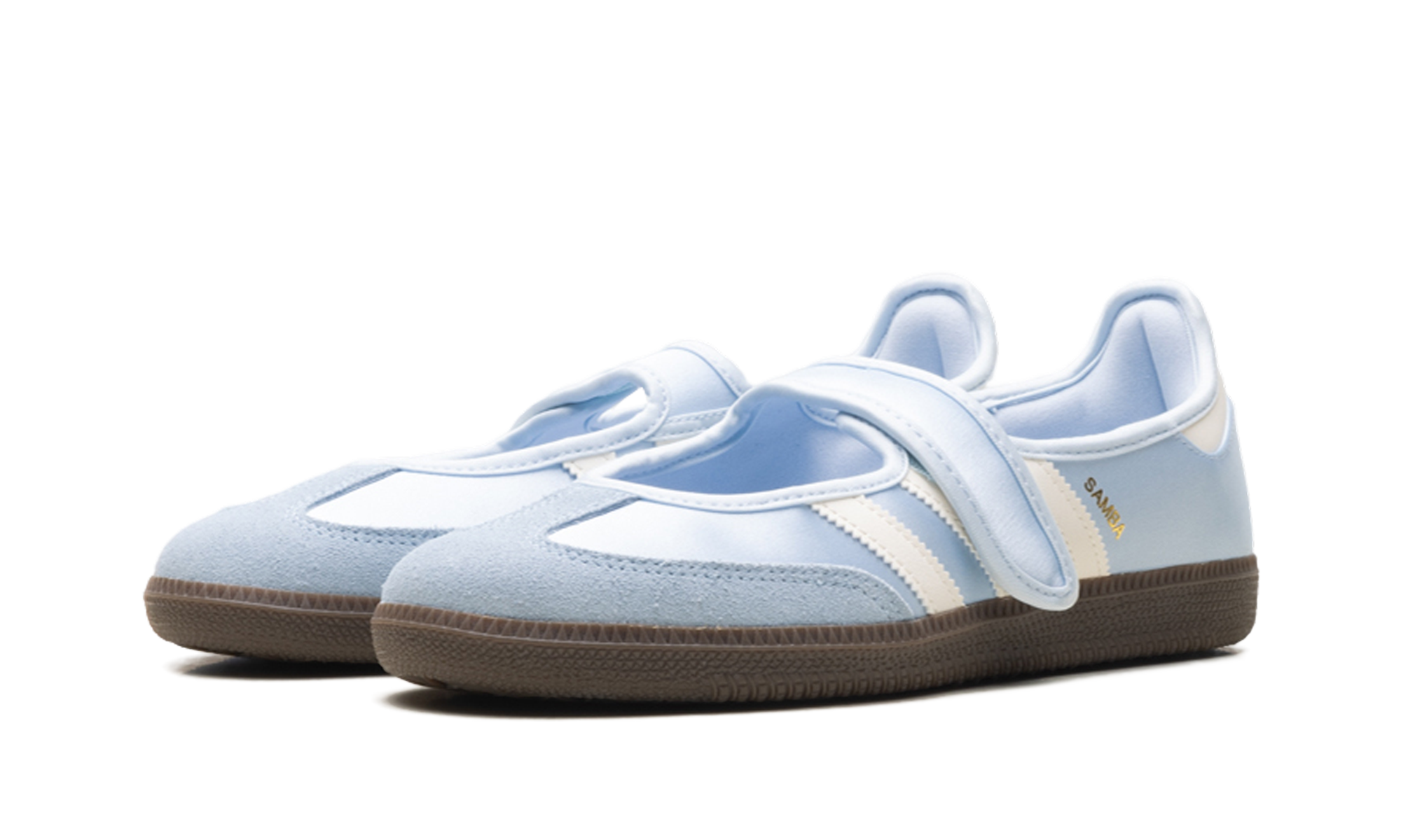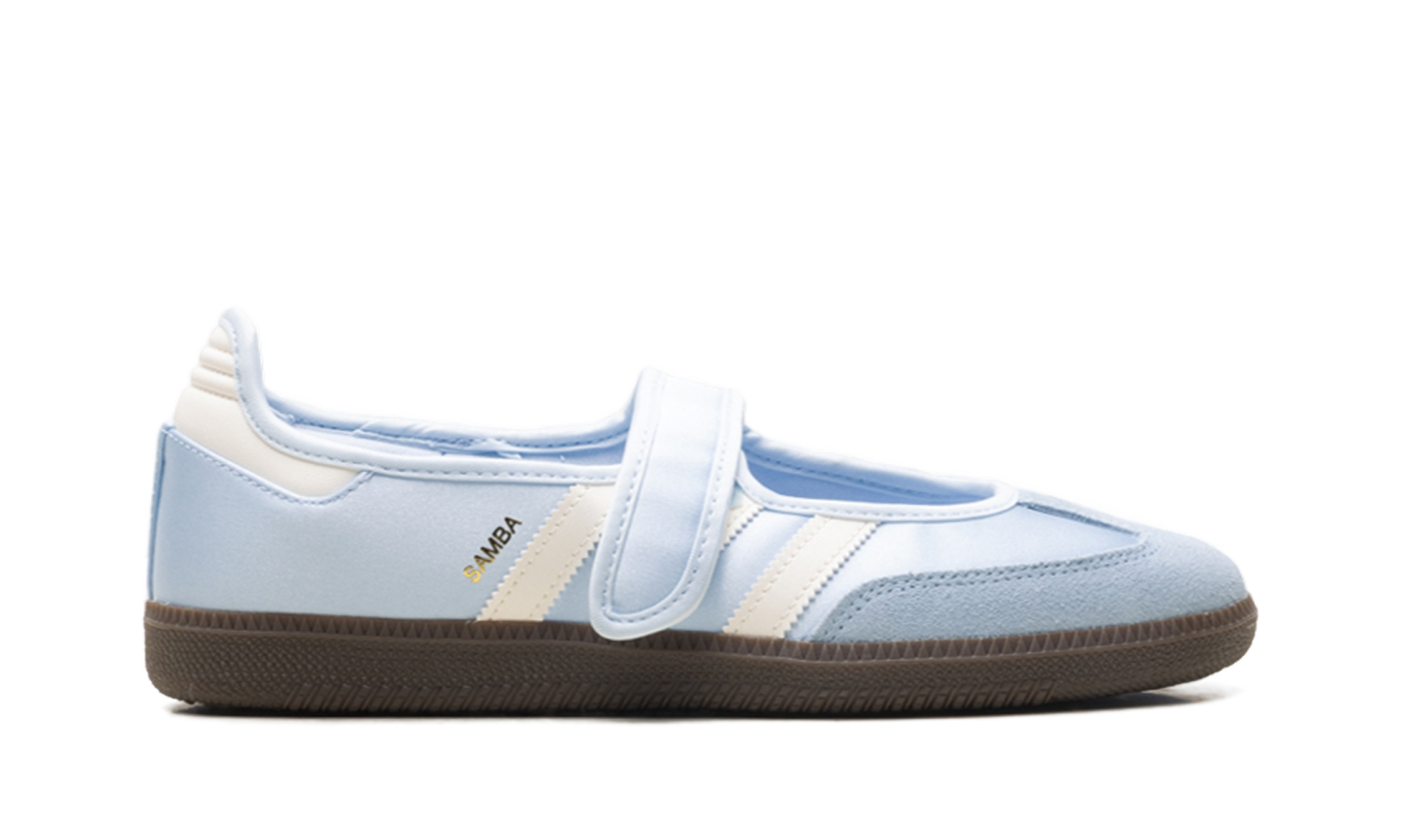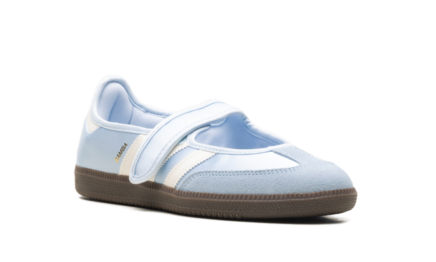 Illuminate your rotation with the ethereal, "Ballet-Core" energy of the Samba Jane "Crystal Sky," a silhouette that masterfully pairs iconic terrace DNA with a shimmering, high-fashion Mary Jane profile. This iteration features a premium satin-finish upper in a serene "Crystal Sky" blue, offering a pearlescent, liquid-silk sheen that radiates a sophisticated elegance. Reimagining the classic indoor soccer trainer with a graceful open-vamp construction and a secure Velcro bridge strap, it is distinguished by a tonal suede T-toe overlay for a rich textural landscape. The cool foundation is sharply defined by "Wonder White" serrated three-stripes and a matching heel tab, providing a clean, high-craft strike to the profile. Grounded by a dark "Gum 5" rubber cupsole and finished with shimmering gold "Samba" branding, these sneakers deliver a premier, "Cinderella-Core" anchor that transitions effortlessly from heritage sportswear to curated runway street style.