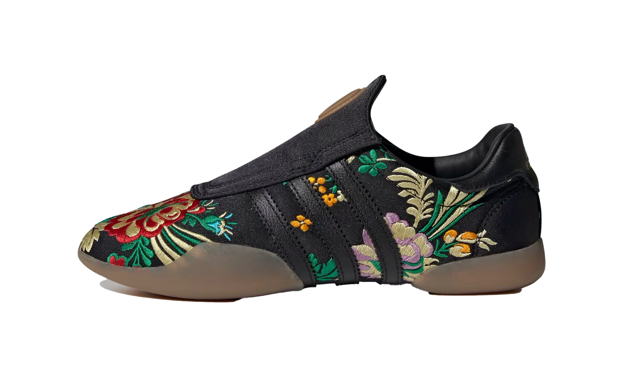 Step into elevated style with the adidas Taekwondo Mei "Black Floral Embroidered" women's sneaker! This chic, ballet-inspired flat offers a sophisticated twist on a classic martial arts silhouette from the early 2000s. Its sleek, black textile upper is beautifully embellished with refined floral embroidery, complemented by subtle Gold Metallic accents. The ultra-low-profile design, paired with a traditional gum brown rubber outsole, makes this a fashion-forward piece perfect for those who love the "balletcore" trend.