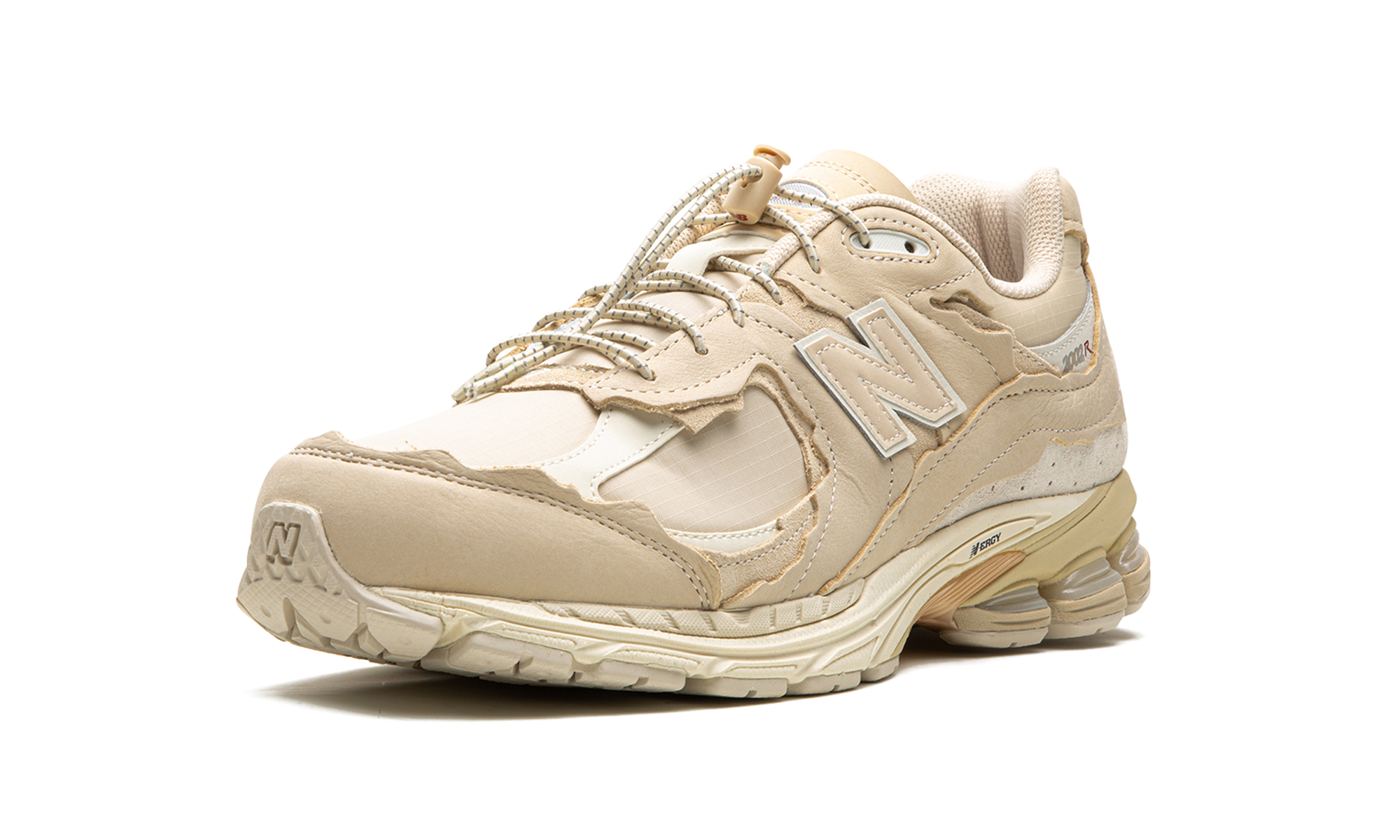 Discover the New Balance 2002R "Protection Pack - Sandstone," a unique casual sneaker with trail-inspired design elements. This alternate version of the 2002R features pre-distressed details, including a tan ripstop nylon base and "frayed" tan suede overlays for a worn-in aesthetic. Trail-style laces with a lace lock add to the rugged look. Experience comfort with the ABZORB cushioned midsole in this stylish and distinctive shoe.