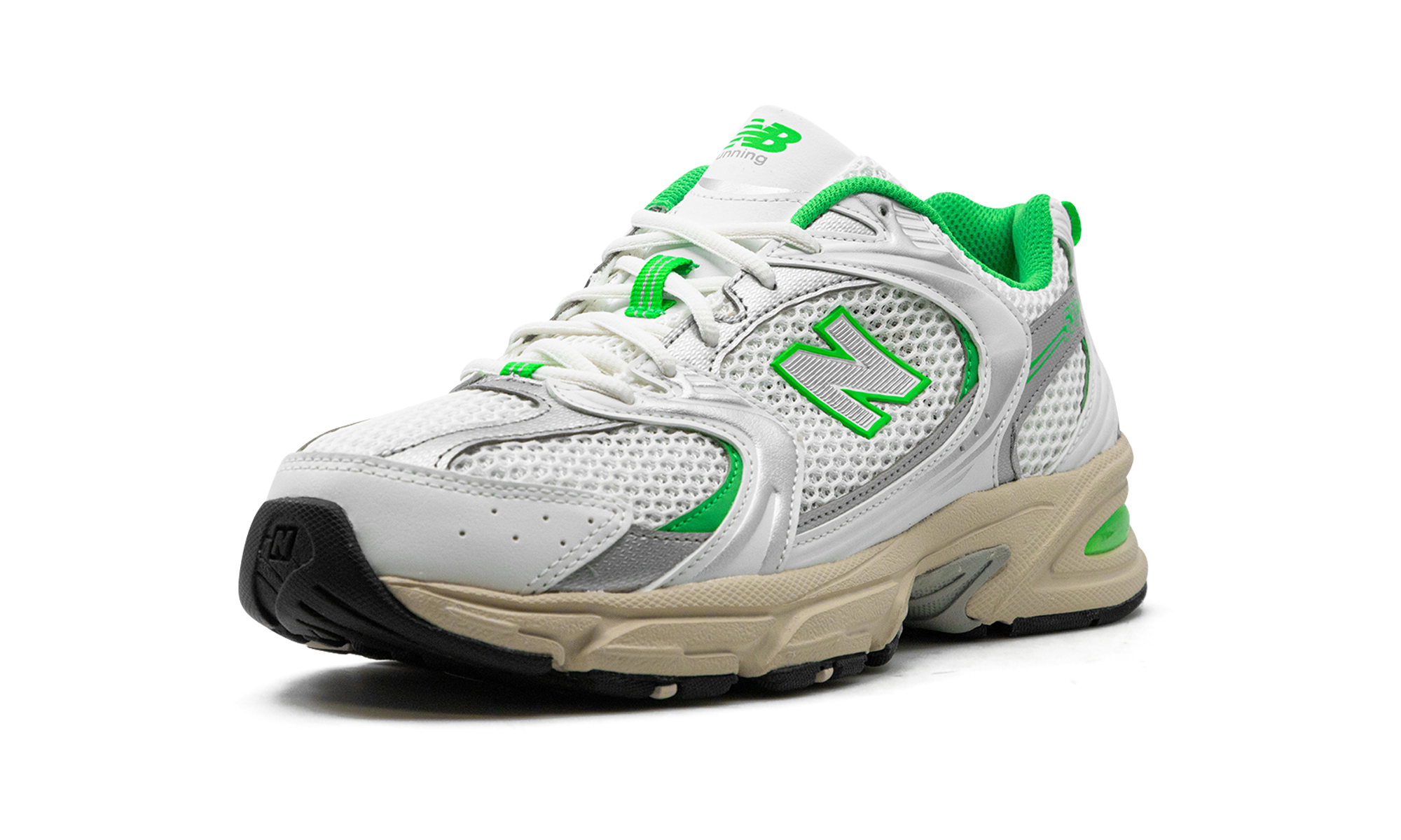 The New Balance 530 “White/Palm Leaf” is a colorway of the retro performance running and lifestyle shoe with aged details. Debuted in 1992, the New Balance 530 was originally a running shoe before transitioning into New Balance’s lifestyle category in the present day. The colorway at hand features a white open-mesh upper with metallic leather overlays accented in an eye-catching Palm Leaf hue. A white “N” with Palm Leaf-colored trim appears on the sides, while a “530” logo can be seen on the lateral side of the heel. Classic “NB” detailing is embroidered on the tongue. The shoe’s chunky midsole is given an aged look, and is equipped with New Balance’s signature ABZORB cushioning for all-day comfort.