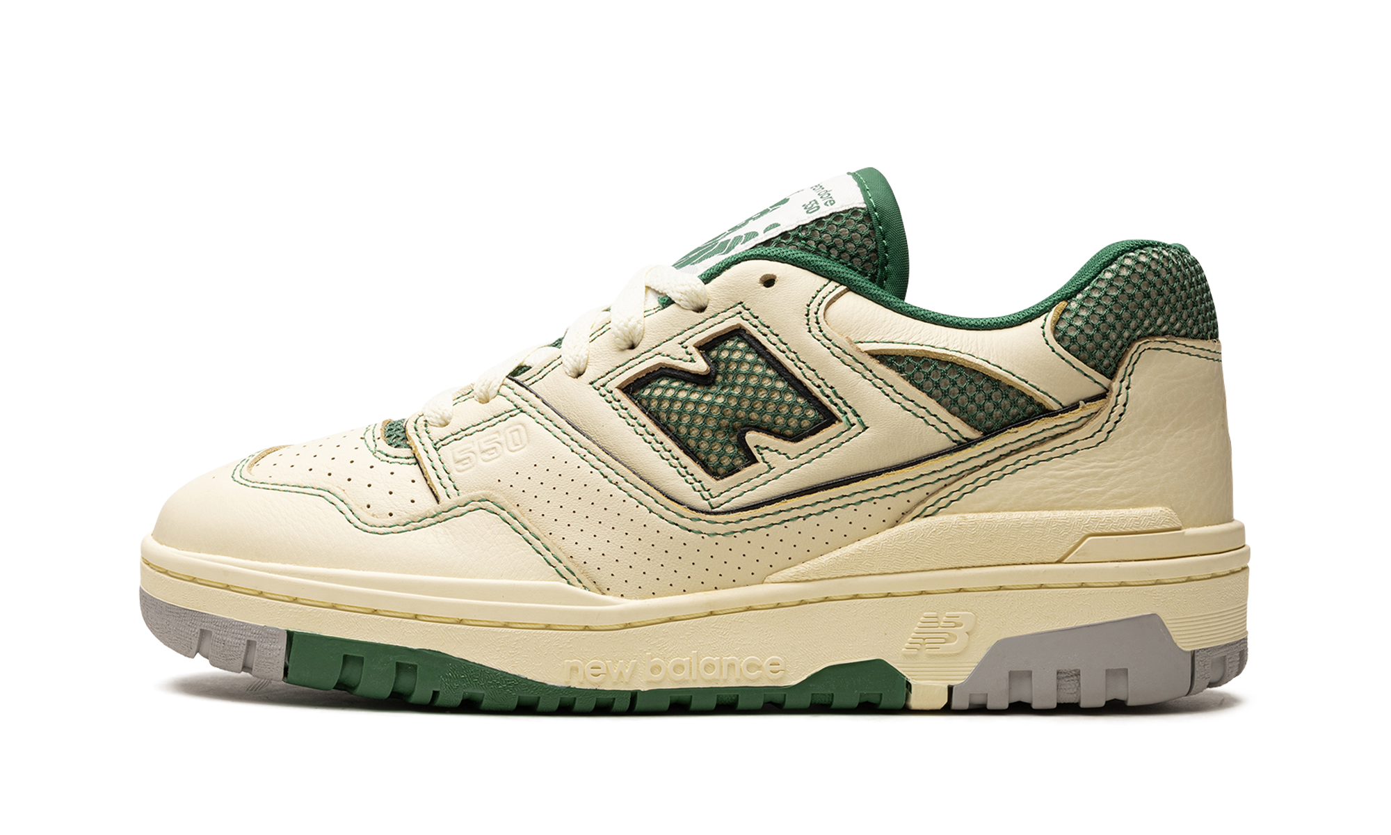 The Aimé Leon Dore x New Balance 550 "Masaryk Community Gym - Green" is a collaboration by Teddy Santis’s clothing brand on a colorway of the retro basketball shoe with green features. Aimé Leon Dore and New Balance draw inspiration from New York’s Masaryk Community Gym” on this version of the old school hoops shoe. The upper features a Dawn Glow (a yellowish-cream hue) leather construction with green mesh “N” branding outlined in black on the sides. “Aimé Leon Dore” branding can be seen on the tongue while co-branding appears on the heel. A cream midsole and a grey and green outsole complete the look.