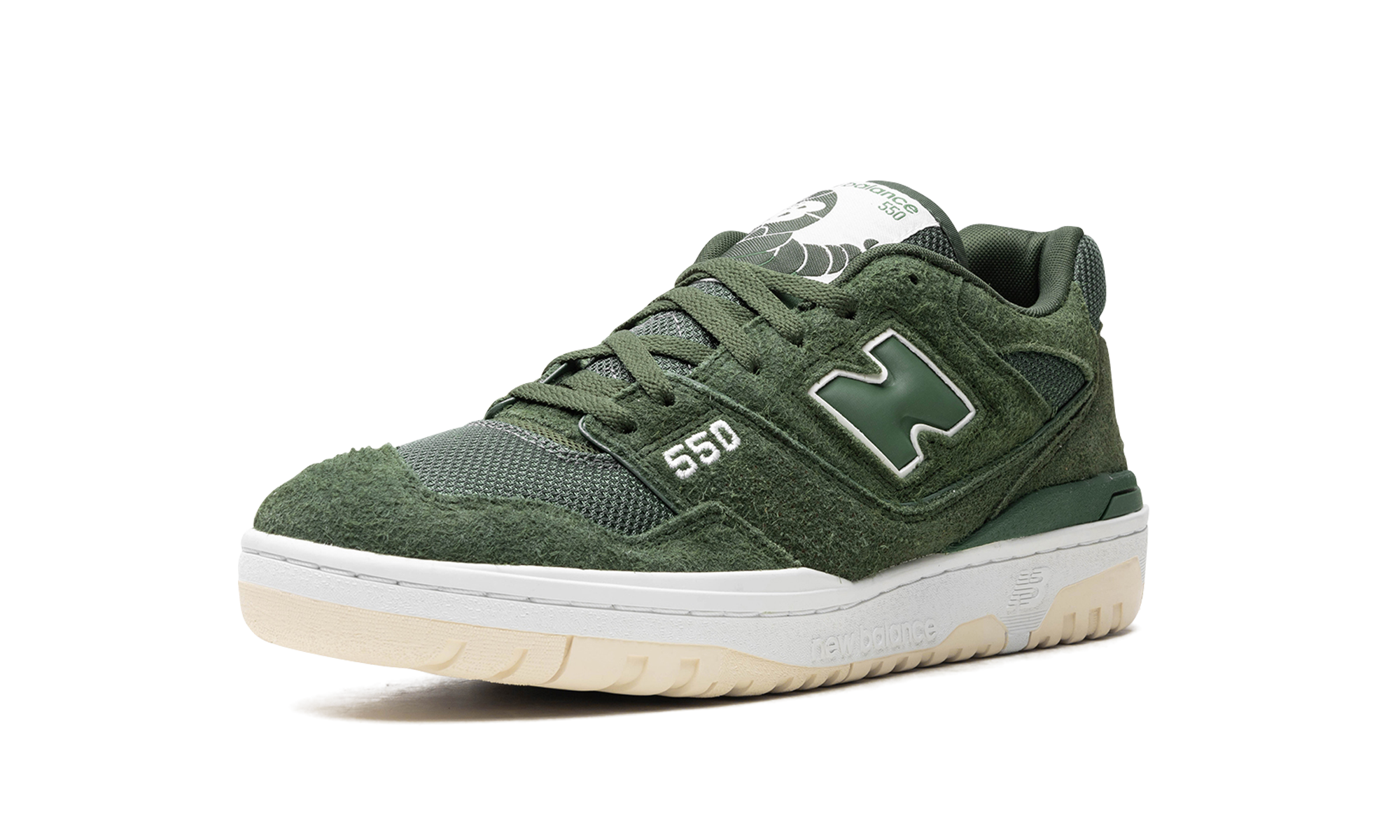 The New Balance 550 “Olive Suede” is a mostly monochromatic green colorway of the retro basketball shoe highlighted by a hairy suede construction. The 550 was first released back in the 1980s and was later brought back in collaboration with Aimé Leon Dore in 2020. Here, the premium colorway features an olive green mesh construction with tonal hairy suede overlays. Green “N” branding can be seen on either side of the shoe and “550” detailing is found on the forefoot. “NB” branding appears on the heel while New Balance 550 insignia appears on the tongue tag. Underfoot, a white midsole and cream rubber outsole round out the look. Release date: September 29, 2023