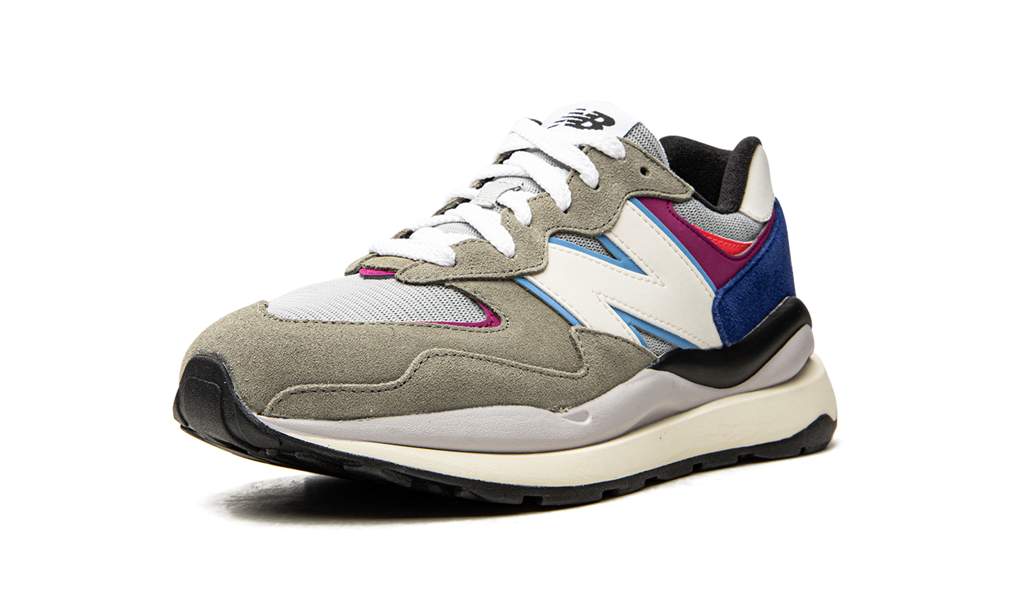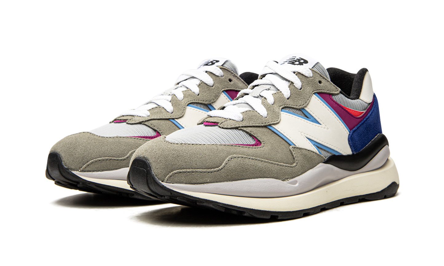 The New Balance 57/40 “Incubation Pack” is a grey-based colorway of the hybrid shoe by New Balance that gives a contemporary look to the New Balance 574. Based on the 574 model, the 57/40 debuted in 2020 and has several design elements that give the shoe a futuristic look that still honors the original 574 shoe. The “Incubation Pack” colorway is mostly grey in appearance, as it features a light grey mesh base and dark grey suede on the toe cap, forefoot, and eyelets. Light blue trim accents the oversized white leather “N” logo on the sides and magenta detailing is found on the overlay on the heel. Additional pops of color arrive in the form of a navy blue suede overlay on the heel and neon pink detailing on the collar. A chunky, retro-inspired wheat foam midsole gives the shoe a decidedly vintage, performance running shoe-style look.
