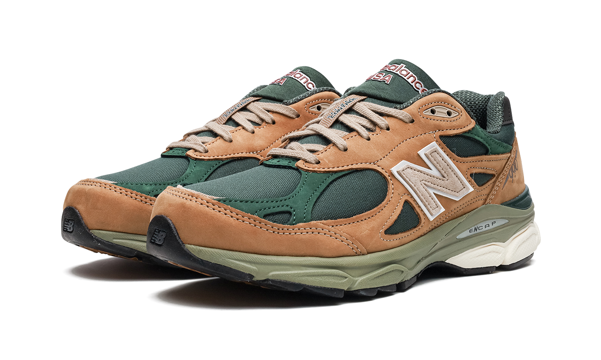 The New Balance 990 v3 Made in USA “Tan/Green” is a classic colorway of the popular lifestyle shoe by the Boston footwear company. From Teddy Santis and New Balance’s “Made in USA” collection, the New Balance 990 v3 Made in USA “Tan/Green” colorway features a decidedly “beef and broccoli” color scheme that’s inspired by classic heritage-style workwear boots. Here, the “Tan/Green” features a green textile base with tonal and brown nubuck overlays throughout. A light tan “N” logo is found on the sides and silver “990” detailing appears on the lateral side of the heel. “Made in USA” detailing is located on the tongue. Underfoot, the shoe rides on a comfortable, ENCAP cushioned midsole.