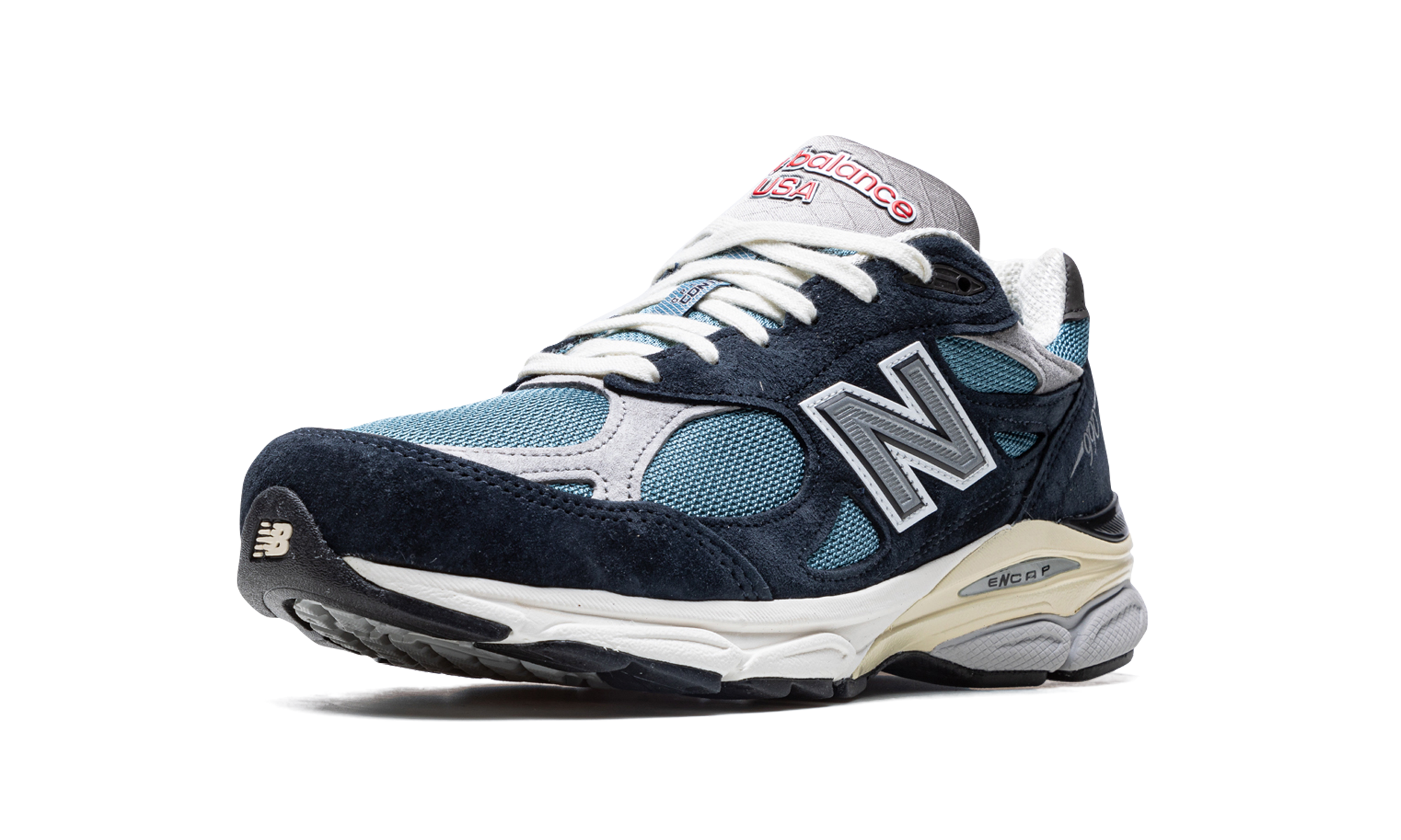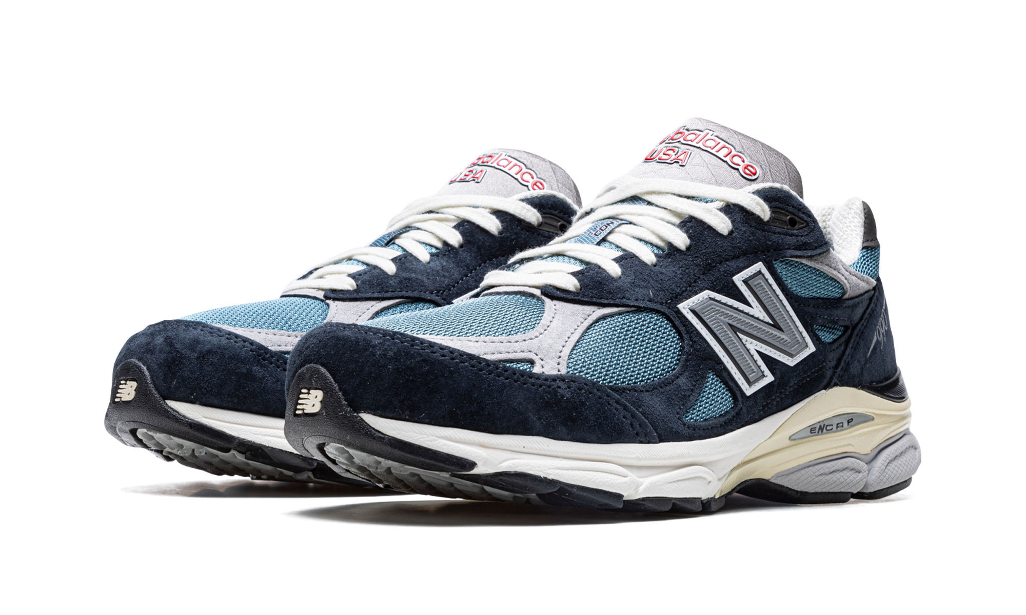 The New Balance 990 v3 “Navy/Castlerock” is a predominantly two-tone, dark-and-light-blue colorway of the premium lifestyle shoe. The New Balance 990 v3 is one of the most popular models from the Boston based footwear brand’s line of Made in the USA sneakers. The upper is complete with a Castlerock-colored mesh base with navy suede overlays. A contrasting grey “N” logo appears on either side of the shoe. Grey leather and suede overlays are found on the toe and collar, respectively. The shoe’s ENCAP cushioned midsole provides all-day comfort.