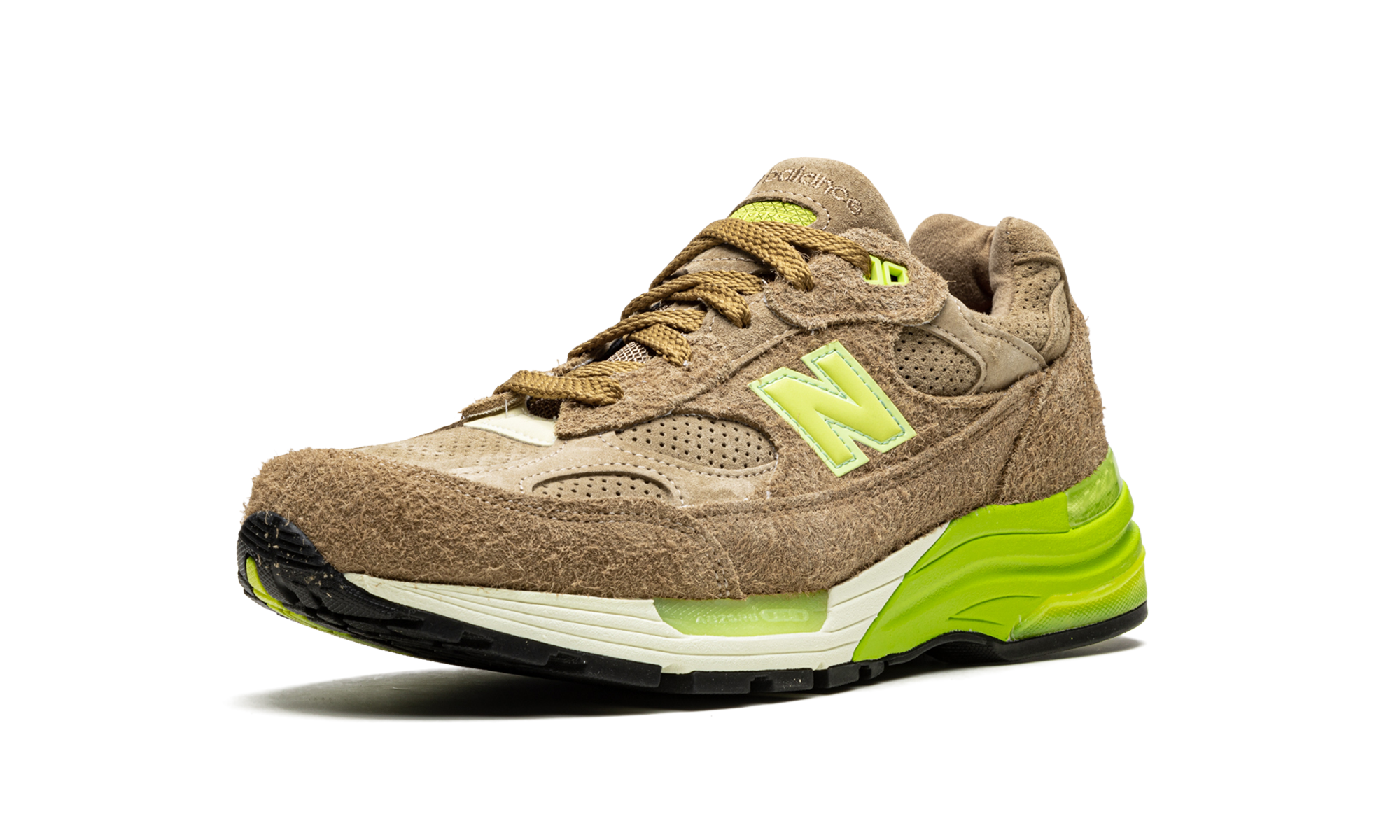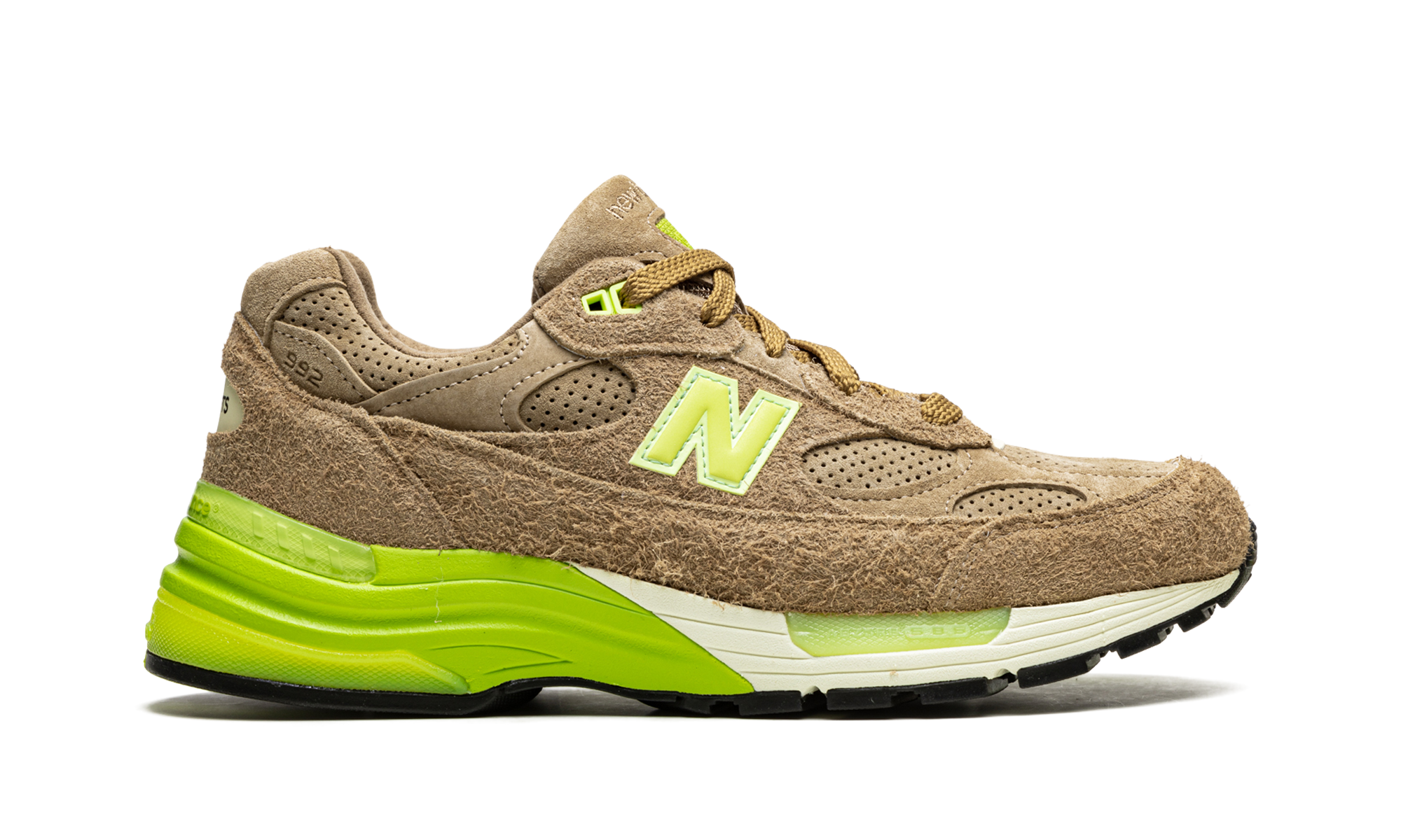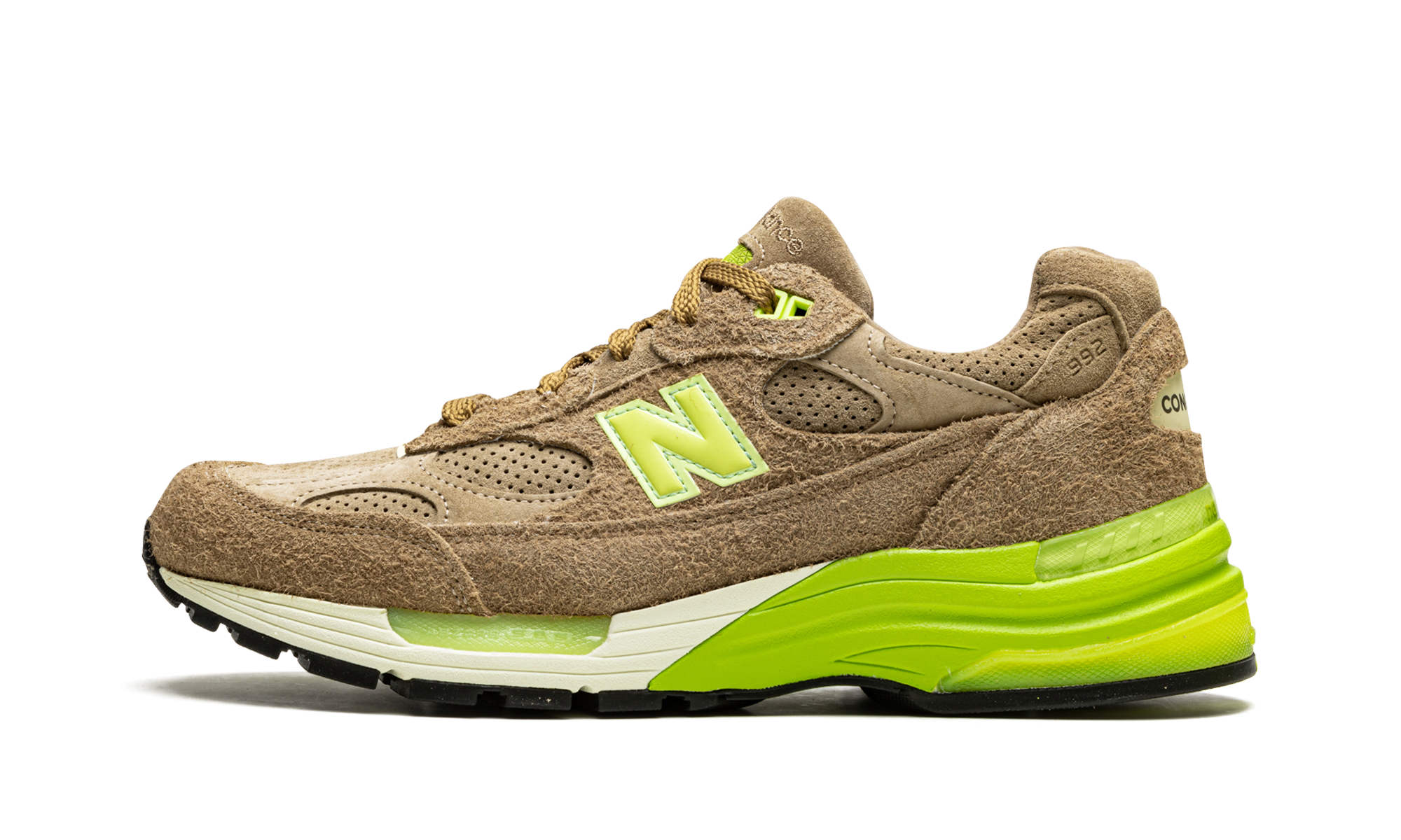 Celebrate sneaker culture with the Concepts x New Balance 992 "Low Hanging Fruit." This collaboration with the Boston boutique is inspired by the kiwi fruit's introduction to the West. Featuring a brown suede upper reminiscent of the kiwi's skin, lime accents, and a strawberry-printed insole nodding to 90s kiwi-strawberry drinks, this shoe is a unique tribute to sneaker history.