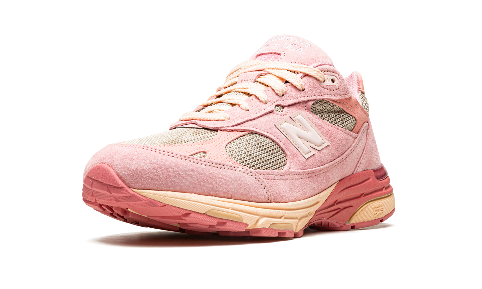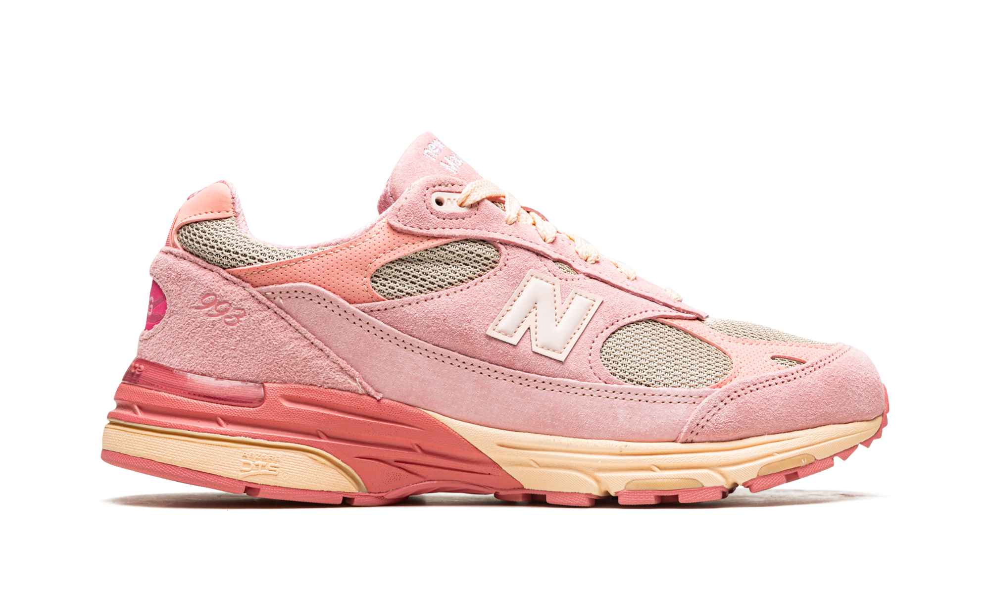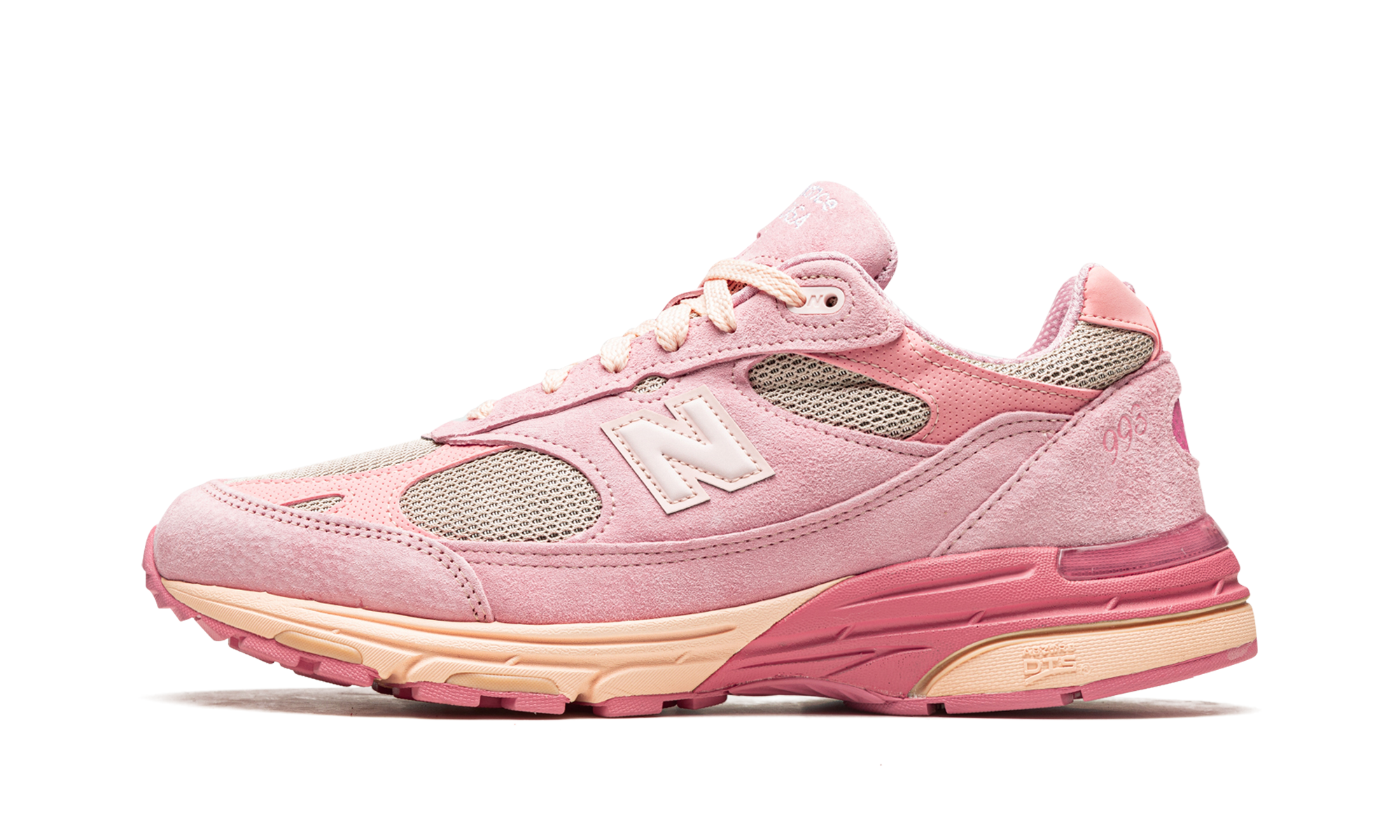 The Joe Freshgoods x New Balance 993 “Performance Art - Powder Pink” is one of three colorways of the lifestyle shoe by the Chicago based streetwear and sneaker designer that released in October 2022. Since 2020, Joe Freshgoods has been among the busiest and most respected collaborators in footwear, having worked with the Boston based sneaker company on numerous occasions, including here on the “Performance Art” pack. The shoe features Powder Pink-colored suede overlays on a grey mesh base. A tonal “N” logo appears on the sides and “JFG” branding is found on the heel. “Made in USA” detailing is embroidered on the blue suede tongue. New Balance’s ABZORB cushioning technology is embedded in the pink-and-cream midsole. Release date: October 21, 2022