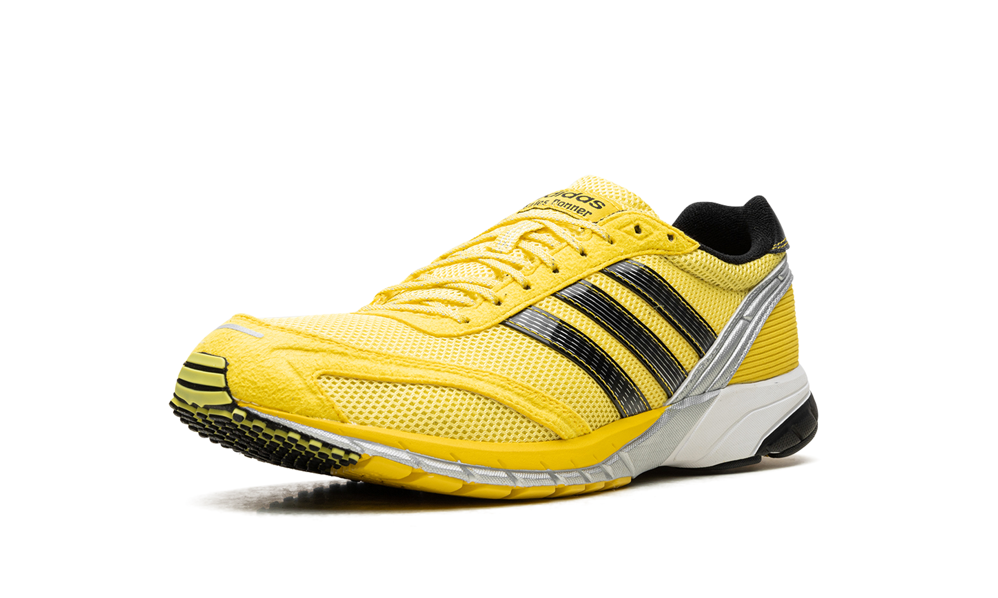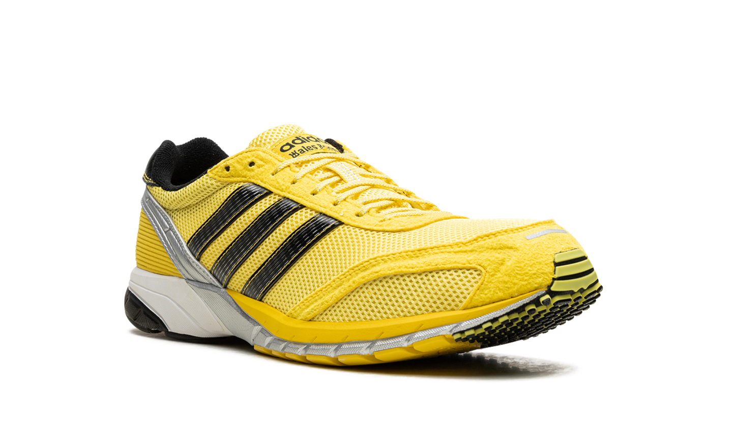 Get an exclusive piece of marathon history with the Adidas Adios Neftenga "Wales Bonner," the "World Record Prototype," in a bold "Light Yellow" colorway. This collaboration revives the unreleased 2008 racing prototype, famously worn by Haile Gebrselassie when he broke the world marathon record. It features a lightweight mesh upper with textured suede overlays and vibrant Core Black accents. The dual-branded design celebrates sporting elegance and is finished with a metallic heel trim and responsive adiPRENE cushioning.