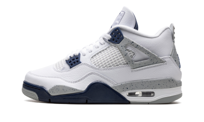 The Air Jordan 4 “Midnight Navy” is a colorway of Michael Jordan’s fourth signature shoe inspired by the model’s iconic “White Cement” style. The “Midnight Navy” replicates the color scheme of the Jordan 4 “White Cement,” but replaces the shoe’s red accents with navy. The upper is constructed from white leather, save for the tongue and mid-panel which feature tonal mesh detailing. Midnight Navy plastic lace holders are found on the throat and collar. The Jordan 4’s signature “Cement” detailing appears on the “Wings” tabs, on the mudguard, and on the Jumpman and “Air” branded heel counter. A visible Air unit in the heel completes the design. Release date: October 29, 2022 Midnight Navy