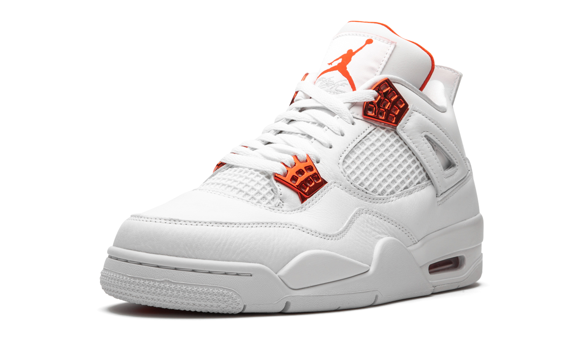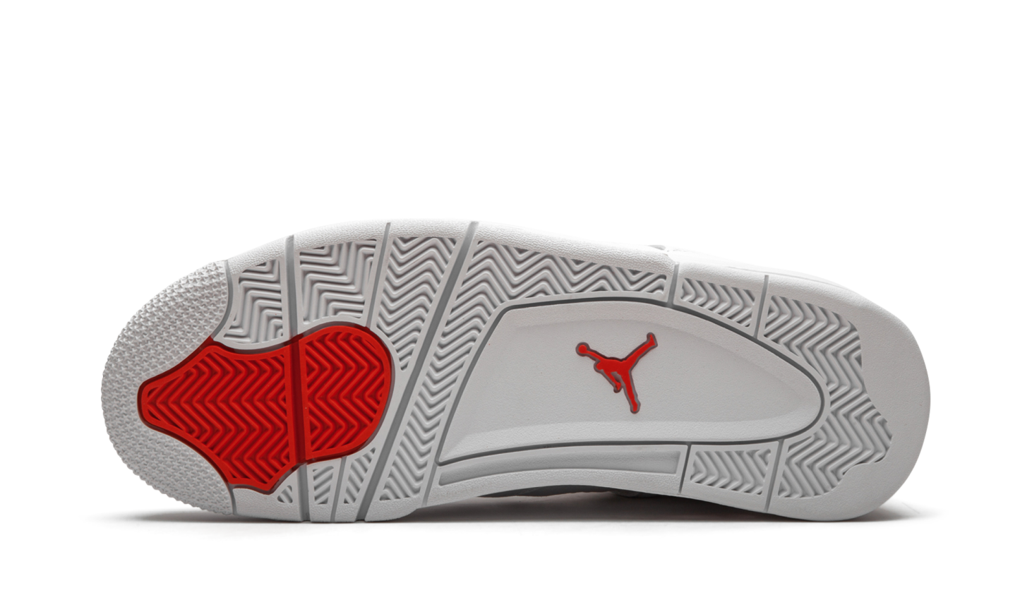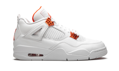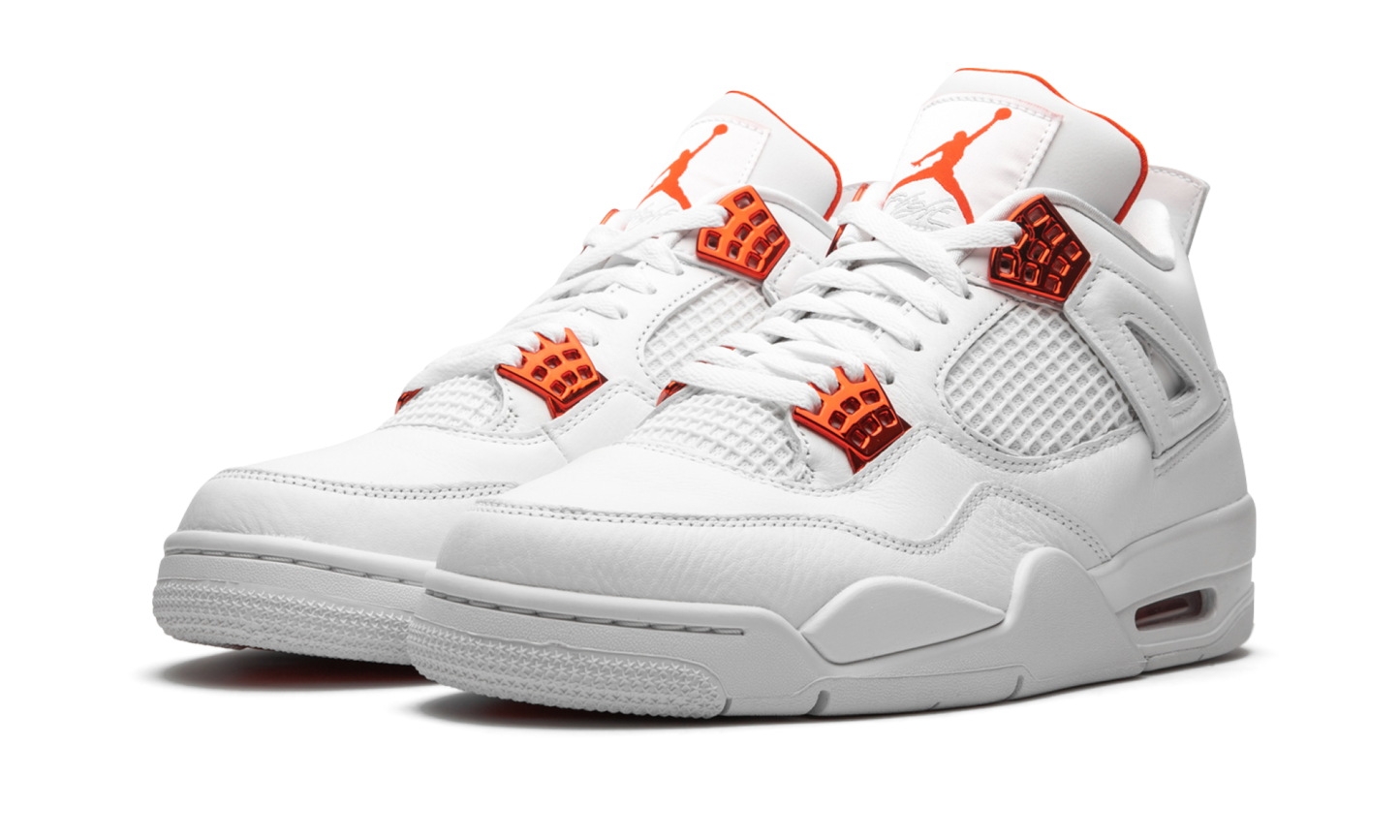 The Air Jordan 4 “Metallic Pack - Orange” is part of Jordan Brand’s 2020 collection of “Metallic” colorways inspired by an original design from the 1980s. One of several “Metallic Pack” Jordan 4s, this “Orange” design is reminiscent of the Air Jordan 1 of the same nickname from 1985, which was an original makeup of Michael Jordan’s first signature shoe. The two-toned appearance features a white leather upper with tonal netting on the mid-panel and throat. Metallic Orange hits on the lace eyelets and Jumpman detailing on the heel provide a stark contrast to the neutral base. Additional orange Jumpman branding can be found on the nylon tongue tab. The hue also appears on the inner lining of the tongue. The classic Air Jordan 4 appearance of this “Metallic Orange” design includes a small visible Air window in the heel. Release date: May 20, 2020. Metallic Pack - Orange