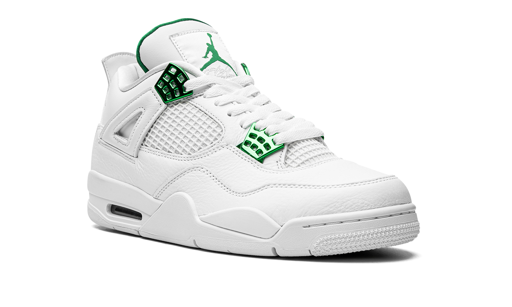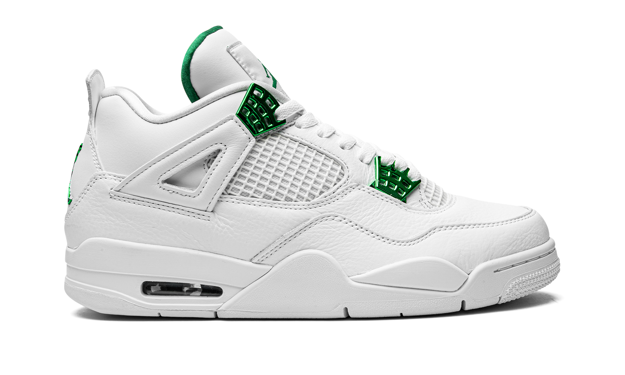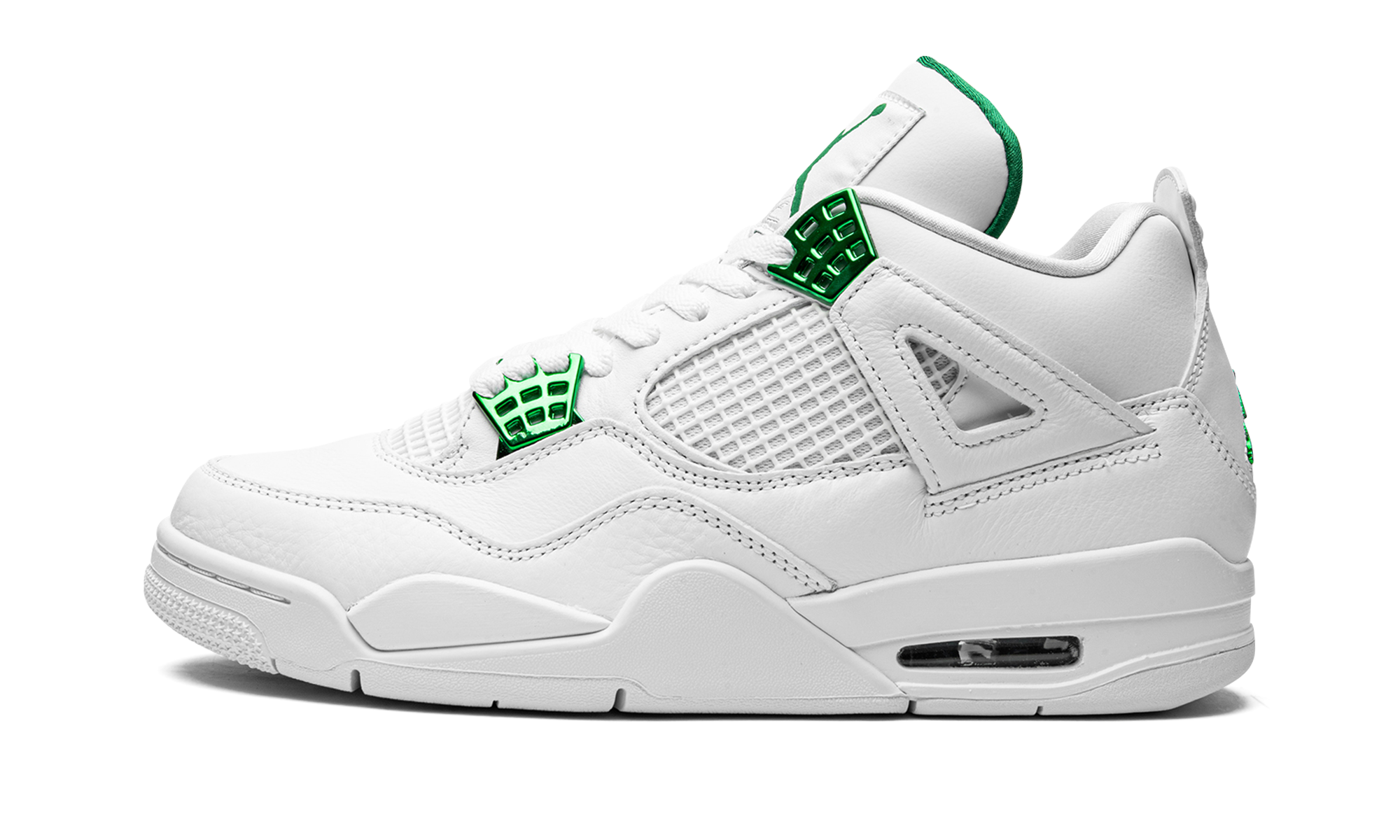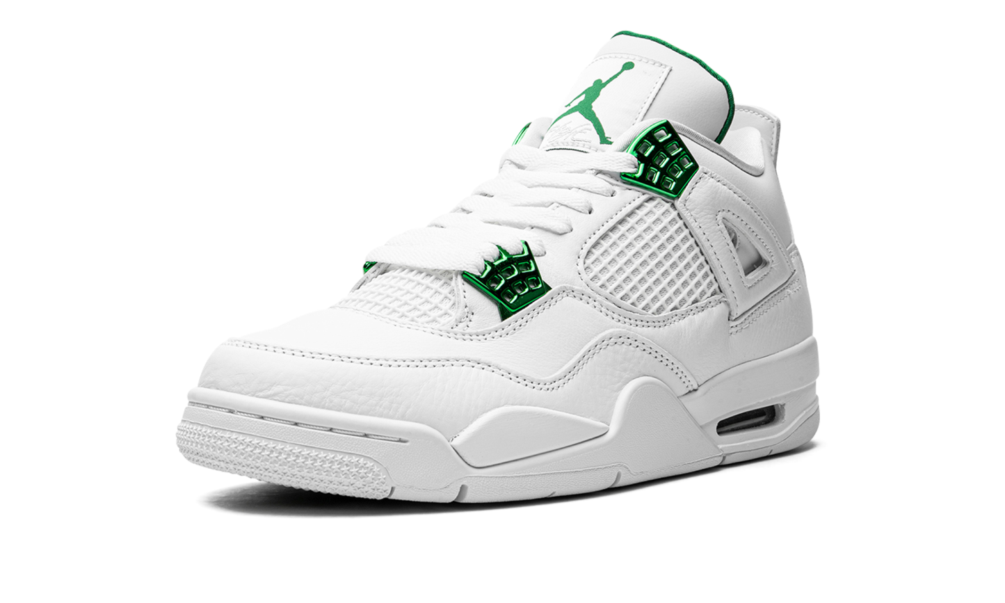 The Air Jordan 4 “Metallic Pack - Green” is one of several colorways that salute Jordan Brand’s storied history. The “Metallic Pack” of Air Jordan 4s from 2020 honor the Air Jordan 1 “Metallic” colorways, which were original makeups of Michael Jordan’s first signature shoe from 1985. Like the other designs in the Jordan 4 “Metallic Pack,” this “Green” variant features an appealing two-toned look with a white leather upper and tonal netting on the mid-panel and tongue. Contrasting metallic Pine Green hits on the lace eyelets and Jumpman insignia on the heel pop against the crisp white base. Green Jumpman branding can be found on the nylon tongue tab and inner lining of the tongue. Staying true to the design of the original Jordan 4 worn by Michael in the ‘80s, a visible Air window is located in the heel. The Air Jordan 4 “Metallic Pack - Green” was released on June 24, 2020. Metallic Pack - Pine Green
