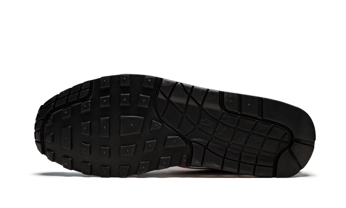 The Nike Air Max 1 "Blue Fury" is a unique edition of the iconic running shoe featuring "jelly" Swooshes with a gradient color treatment. The premium construction features an all-black upper in ripstop nylon with synthetic nubuck and reflective materials. The large "jewel" or "jelly" Swoosh has a fuchsia to white gradient, while the tongue tag has a shiny iridescent finish with a blue-green Nike logo. A turquoise midsole, black and white rubber outsole, and matching pink Air Max unit complete the popular colorway.