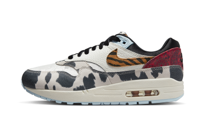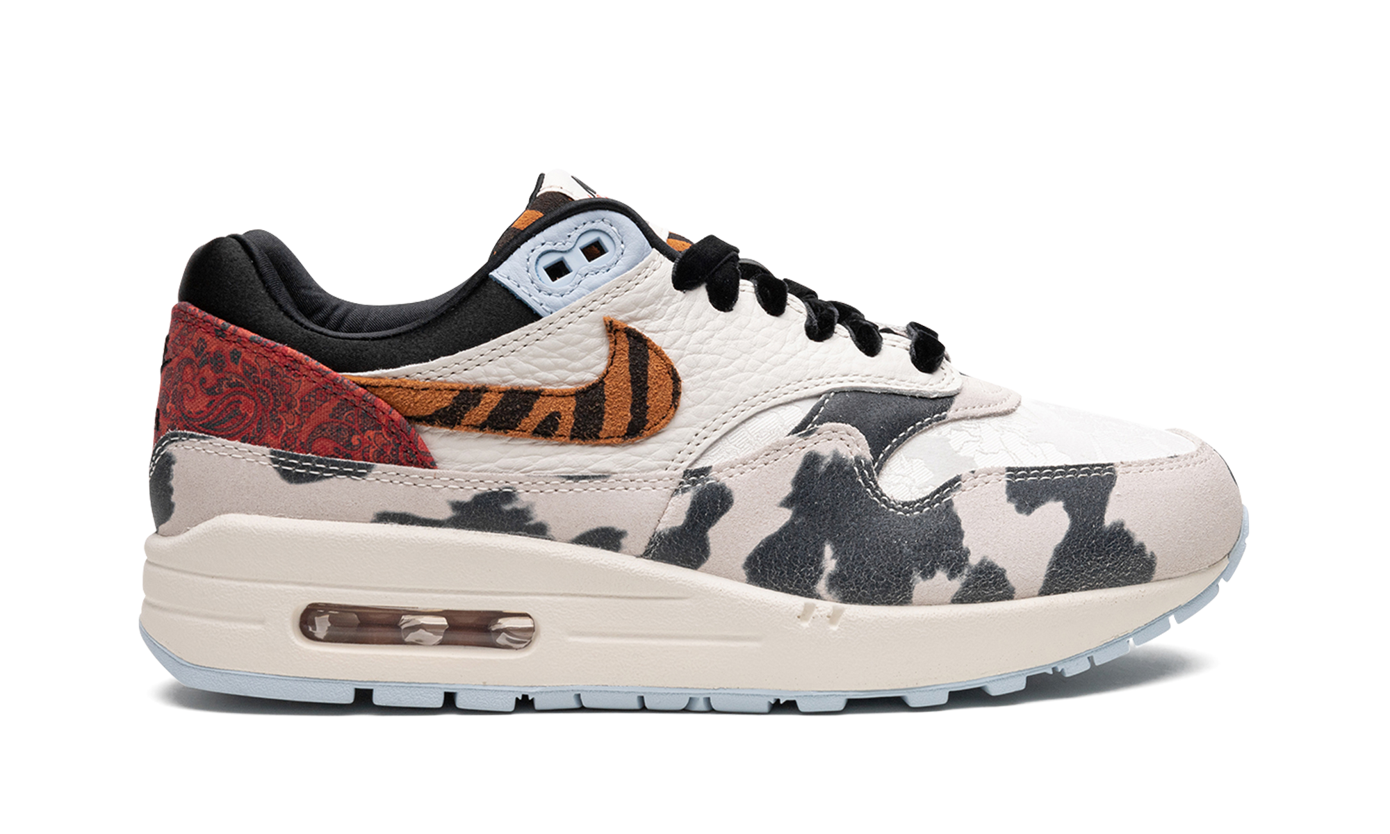 The Women’s Nike Air Max 1 ‘87 “Tiger Swoosh Cow Print” is a women’s-exclusive colorway of the retro performance running shoe that updates its classic design with unique animal-inspired patterns. One of the most creative Air Max 1s on the market, the “Tiger Swoosh Cow Print” features multiple animal patterns on its design, including a cow print textile on the mudguard and a red-and-black paisley print on the heel. A tiger stripe Swoosh appears on the sides. Velvet black laces appear on the top of the shoe. Underfoot, the shoe rides on a cream-colored foam midsole with a visible Air unit in the heel. Release date: March 15, 2023 Tiger Swoosh Cow Print