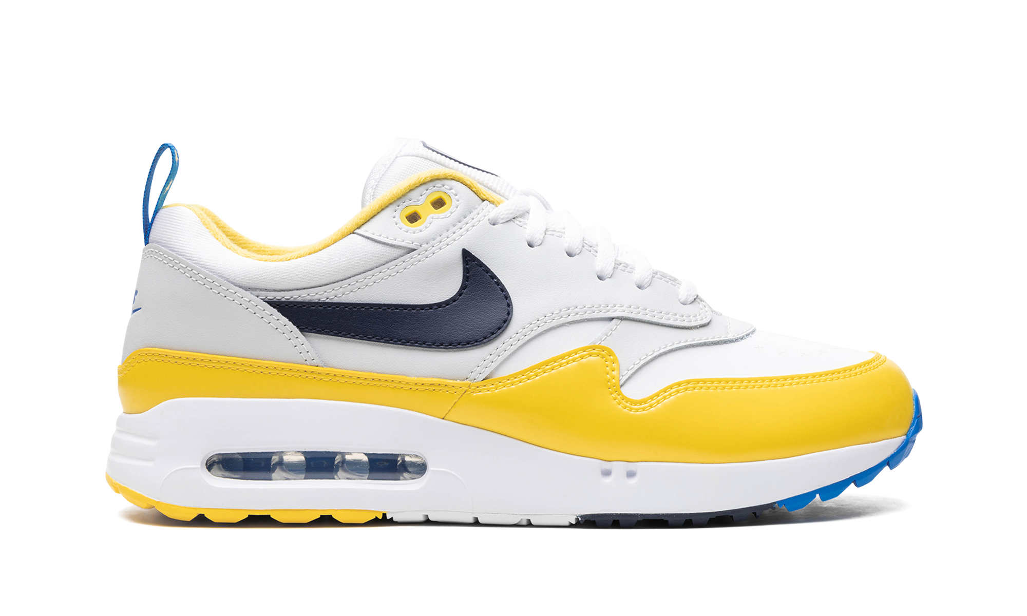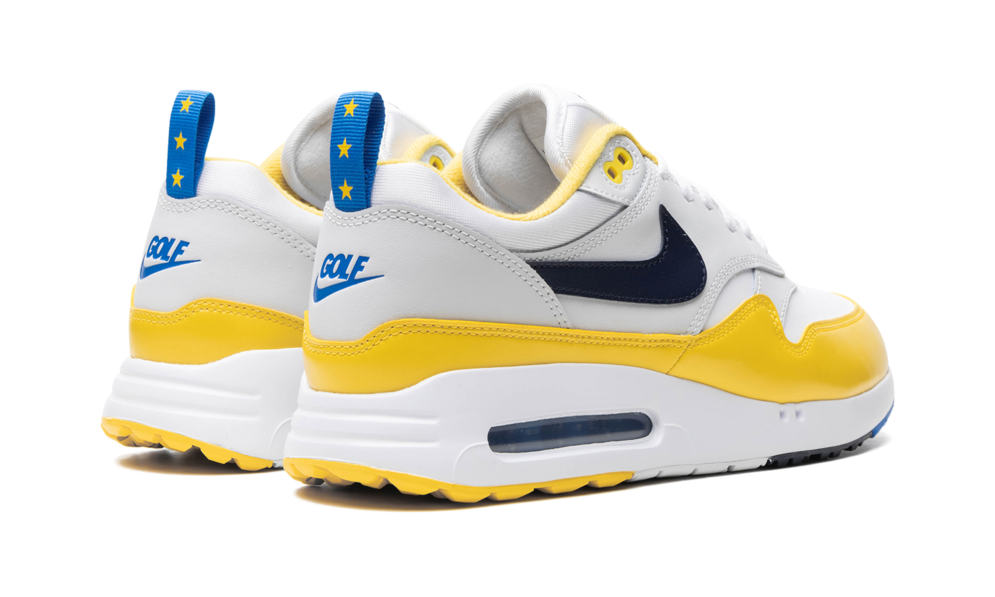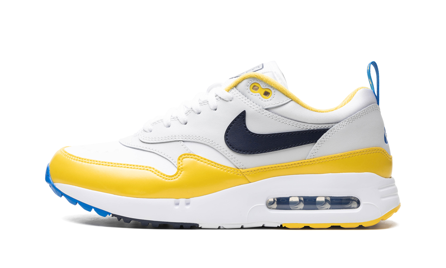 The Nike Air Max 1 '86 OG Golf "Solheim" is a colorway of the alternate golf version of the retro running shoe inspired by the European golf championship. From a collection inspired by the USA’s Ryder’s Cup and Europe’s Solheim Cup, the Air Max 1 ‘86 OG Golf offers something for golf and sneaker fans alike. Here, the “Solheim” version features a white leather base with grey leather overlays. An Obsidian-colored leather Swoosh appears on the sides. “Golf” detailing can be found on the heel while “Nike” branding is seen on the tongue. The blue nylon pull tabs on the heel are contrasted with a yellow star motif. A shiny yellow mudguard completes the look. Release date: September 28, 2023 Ryder Cup