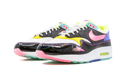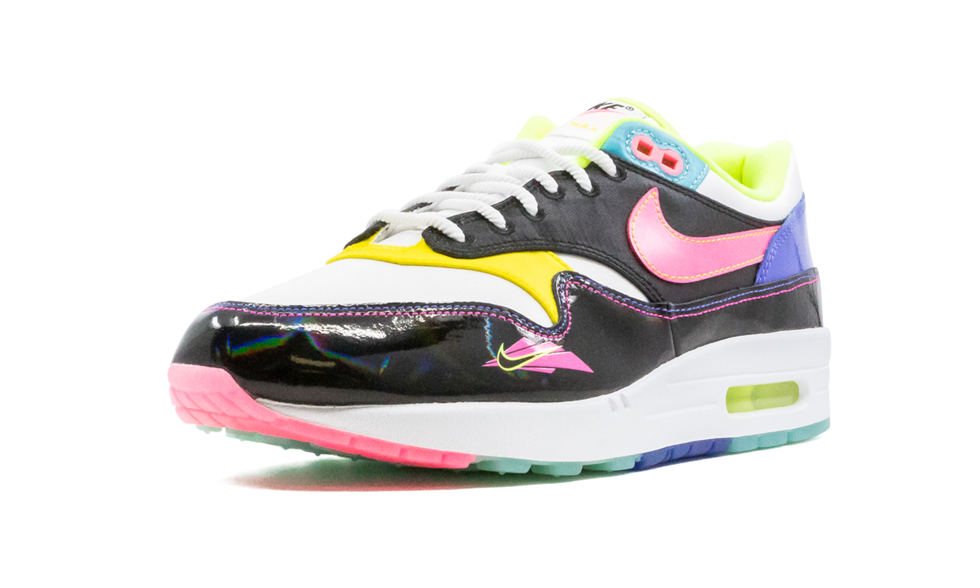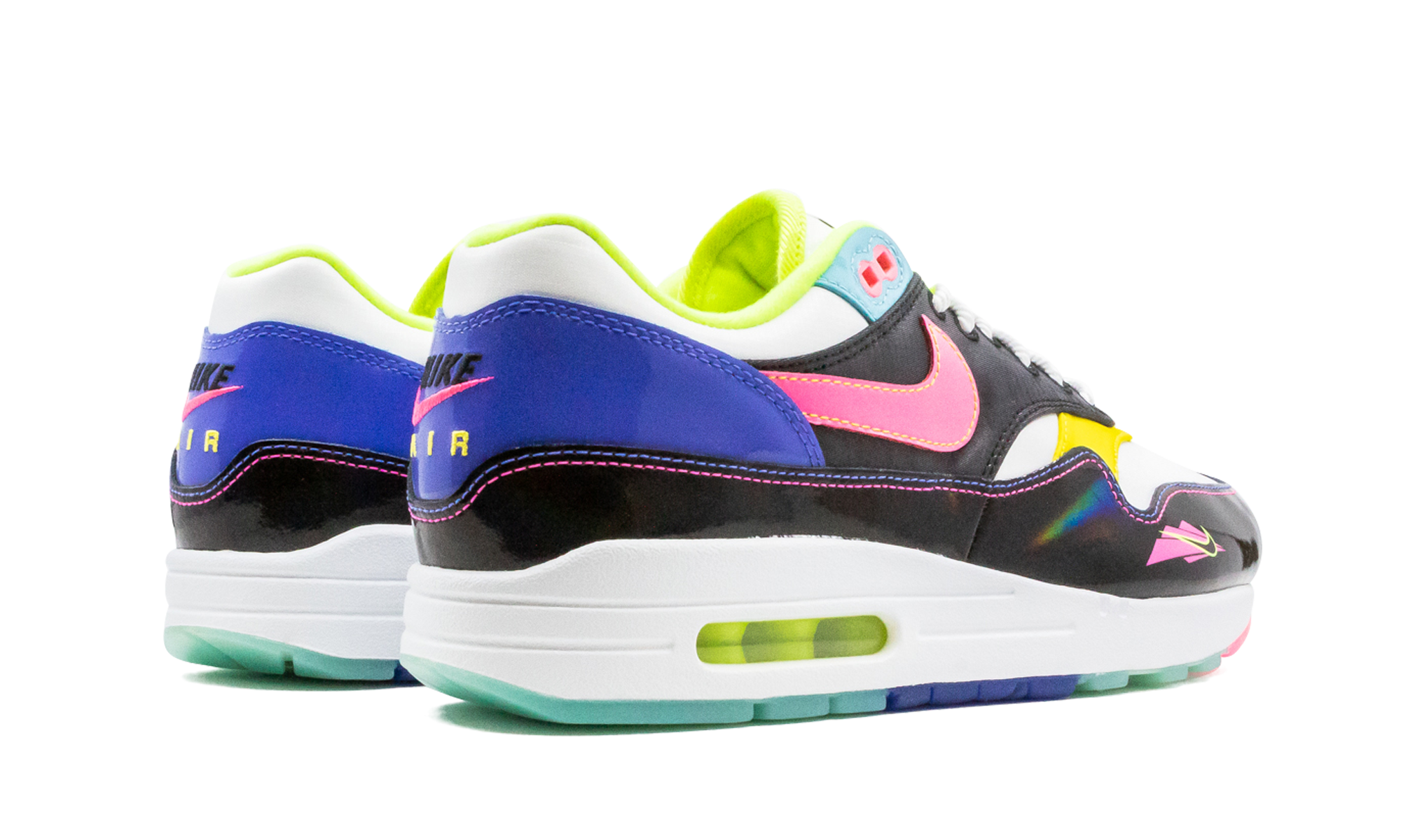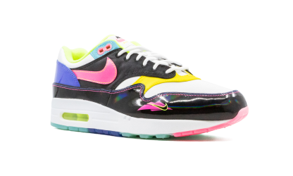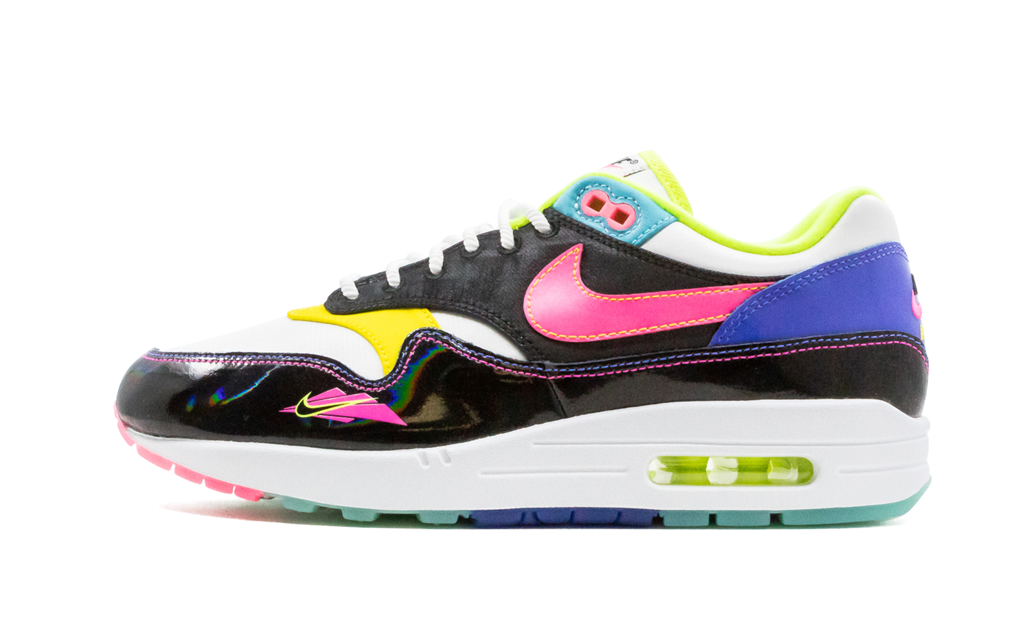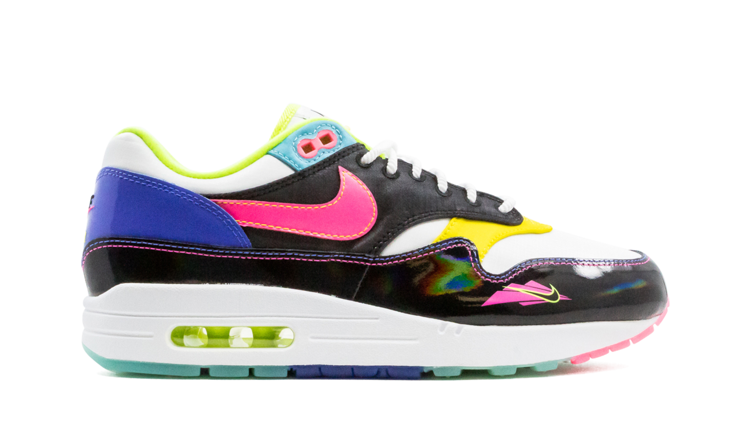 The Nike Air Max 1 "Hyper Pink" is a highly saturated colorway of the classic sneaker, inspired by ‘90s water sports. White and black serve as the base before color bursts all over the shoe's details. We're talking the whole lot: yellow, teal, purple, pink, lime green, and blue. A glossy black mudguard adds even more dimension with an iridescent shine, and note the unique pink and yellow Nike logo graphic on the lateral forefoot. The jet ski-inspired Air Max 1 is bottomed out with semi-translucent outsole in pink, teal and blue rubber. Hyper Pink