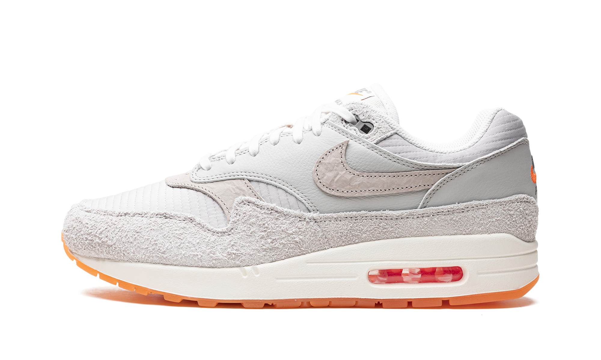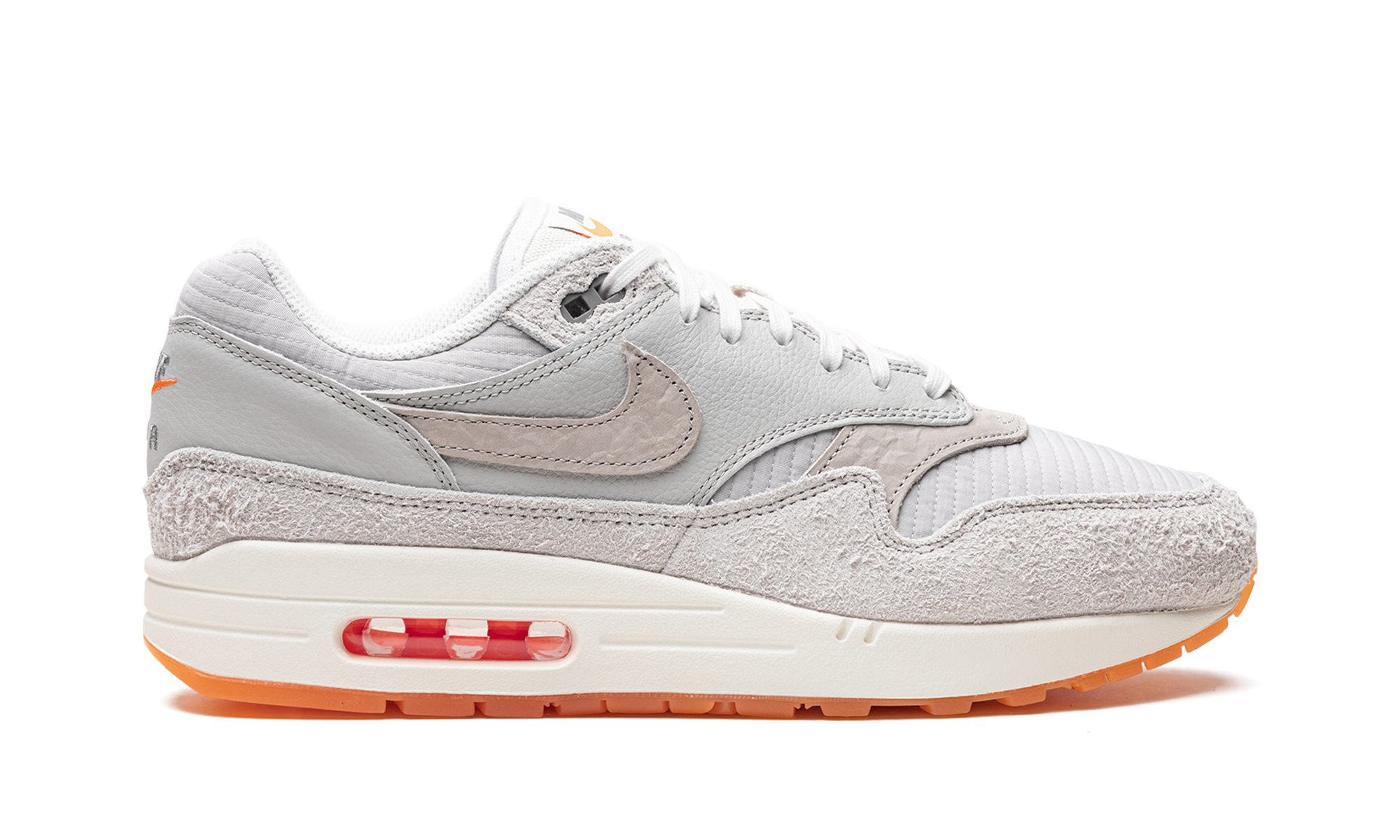 The Nike Air Max 1 “Light Iron Ore/Total Orange” is a colorway of the retro running shoe with a premium blend of materials and textures. It features a Light Iron Ore quilted textile base with tonal leather overlays on the forefoot, mid-panel, and heel. A lightly contrasting shade of tan leather is utilized for the side Swooshes and toe detailing, while bright orange adds a pop of color on the Nike logos, Air Max unit, and translucent rubber outsole. A heel-to-toe Swoosh logo is found underneath the clear outsole. Light Iron Ore / Total Orange