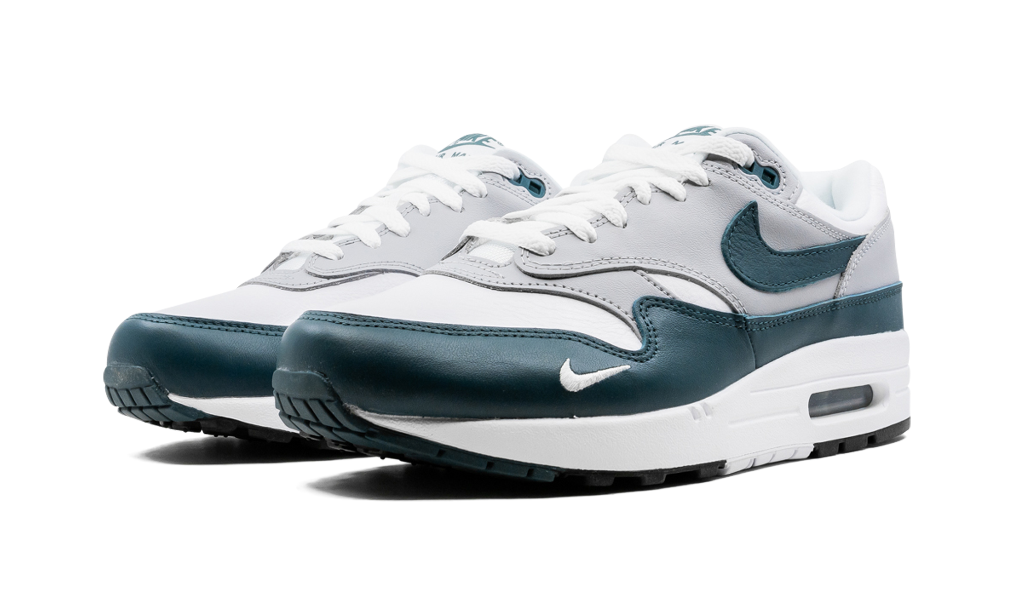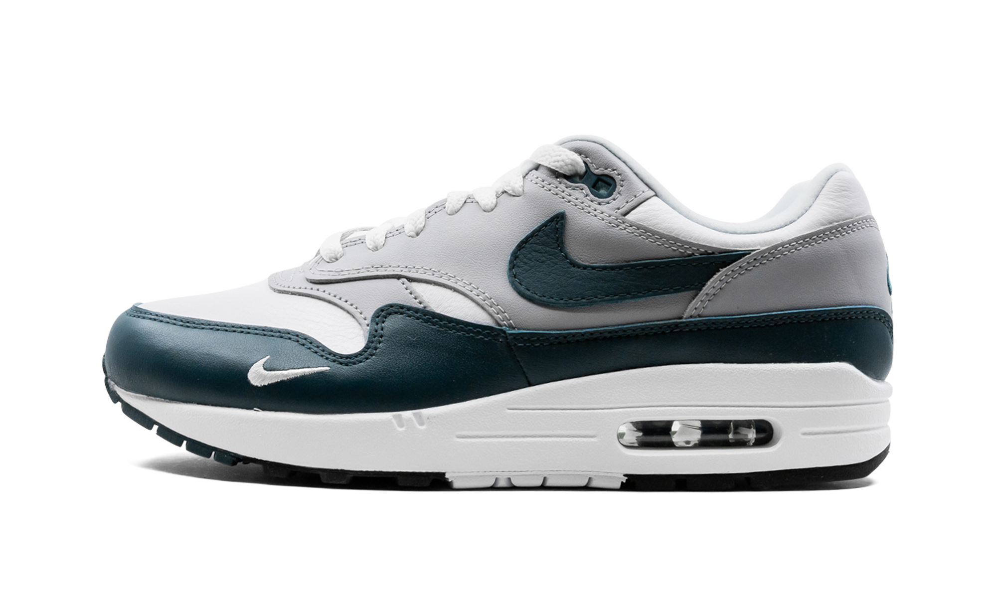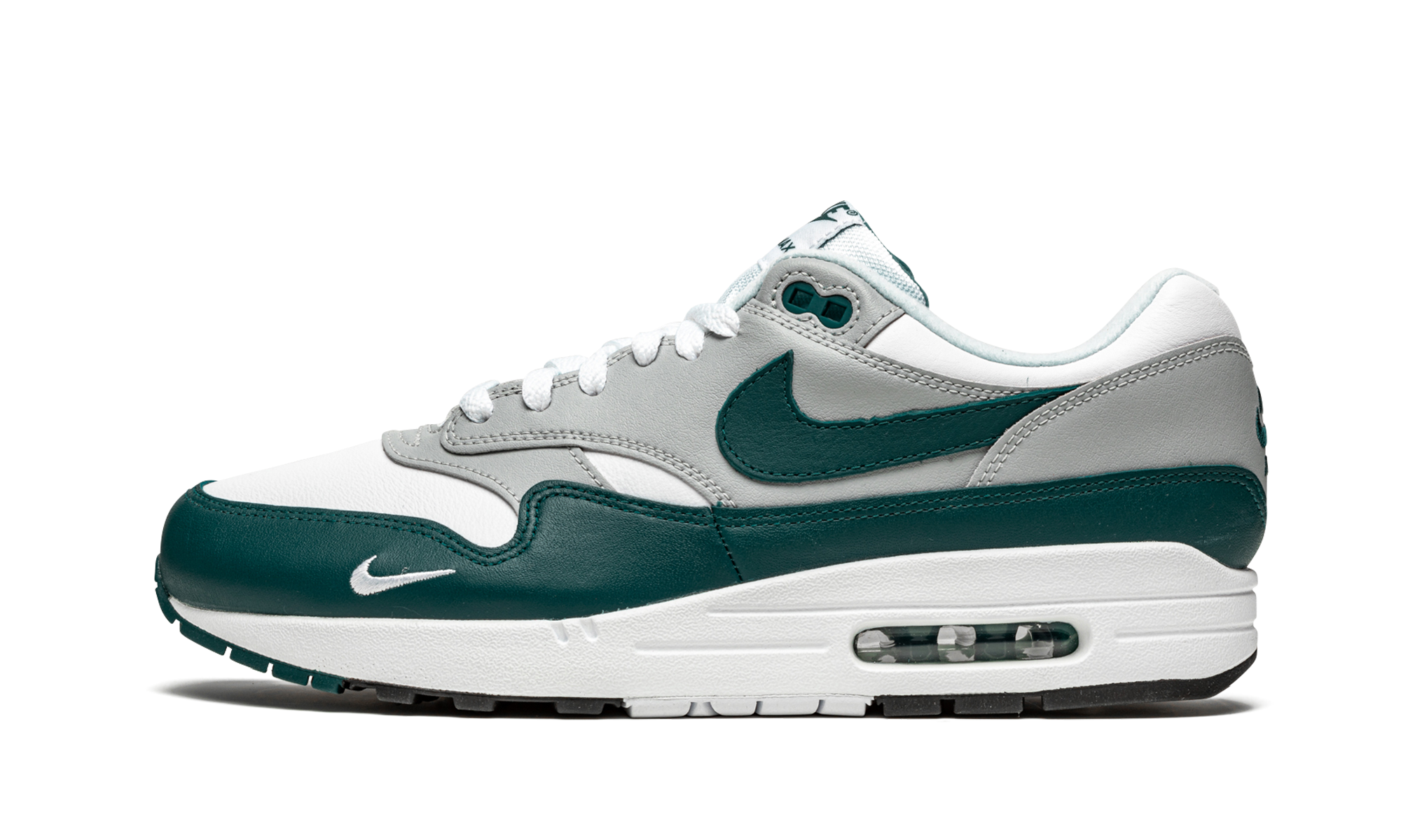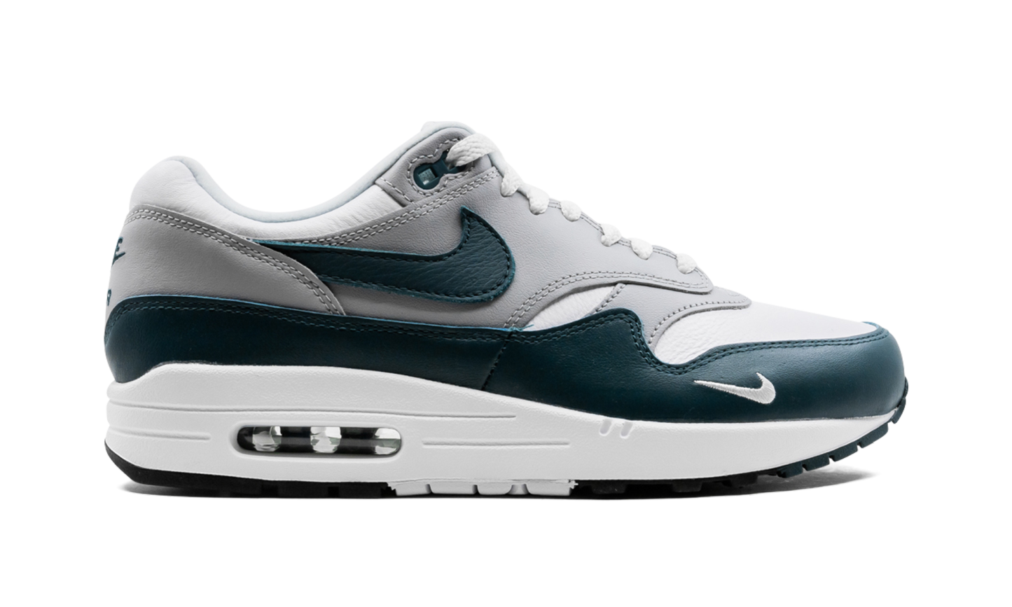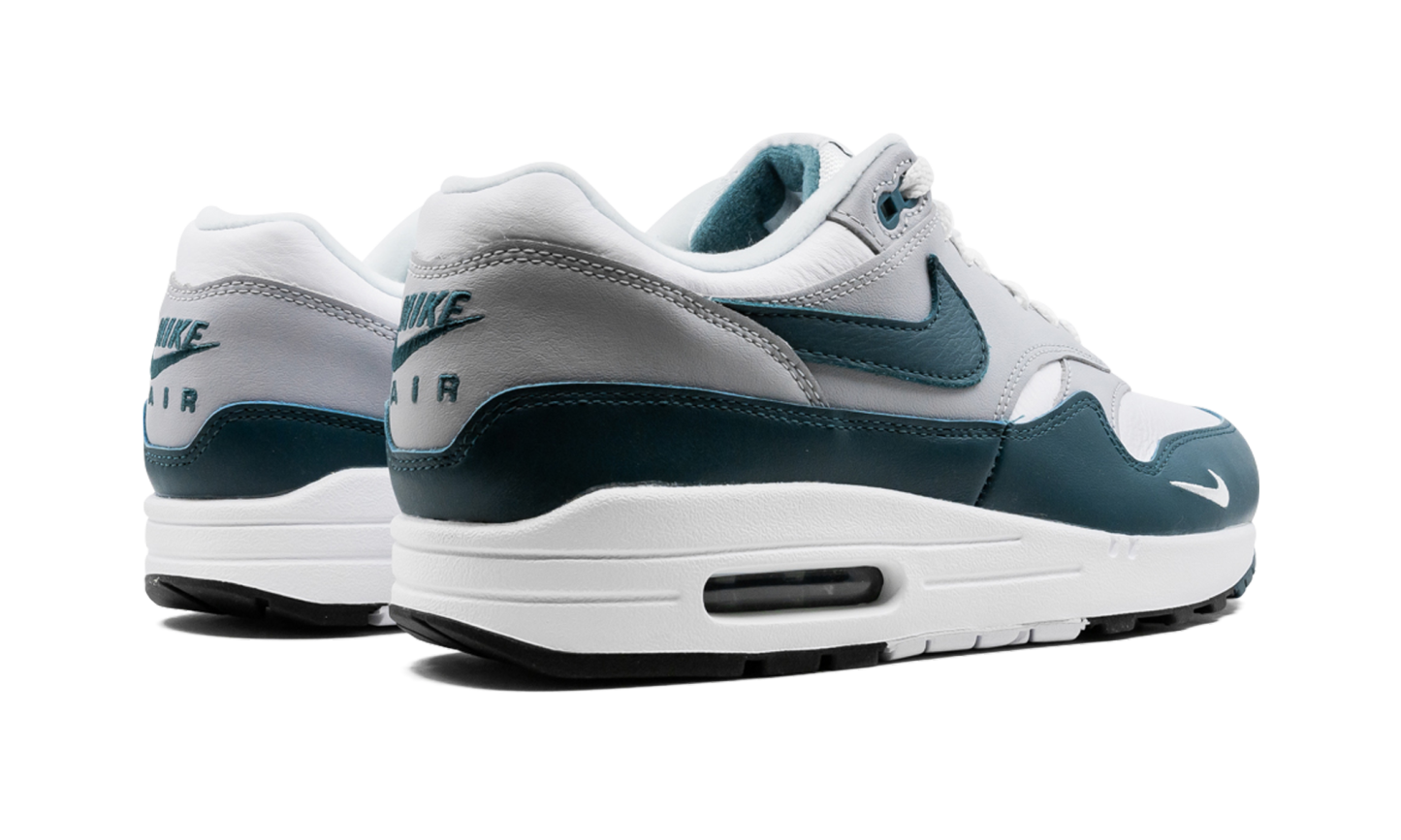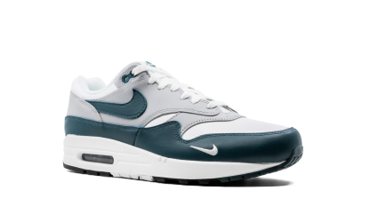 The Nike Air Max 1 LV8 “Dark Teal Green” is a premium version of the retro running shoe that trades the model’s original mesh and suede construction for a leather composition. An April 2021 release by Nike, the “Dark Teal Green” is arranged in a tri-color design similar to the original color block of classic Air Max 1s. Moreover, the “Dark Teal Green” succeeds the release of another Air Max 1 LV8 (or “Elevate''), January 2021’s “Obsidian” colorway. White tumbled leather appears on the toe, forefoot, and collar. Grey leather contrasts the design on the forefoot, mid-panel, and heel. A Dark Teal Green leather Swoosh resides on both sides of the shoe. The same green detailing appears on the buttery leather mudguard. A “Nike Air” logo is stitched onto the heel and a clear Air bubble can be found in the heel of the white midsole. Release date: April 15, 2021 Dark Teal Green