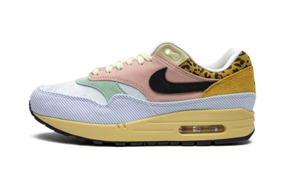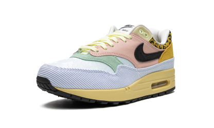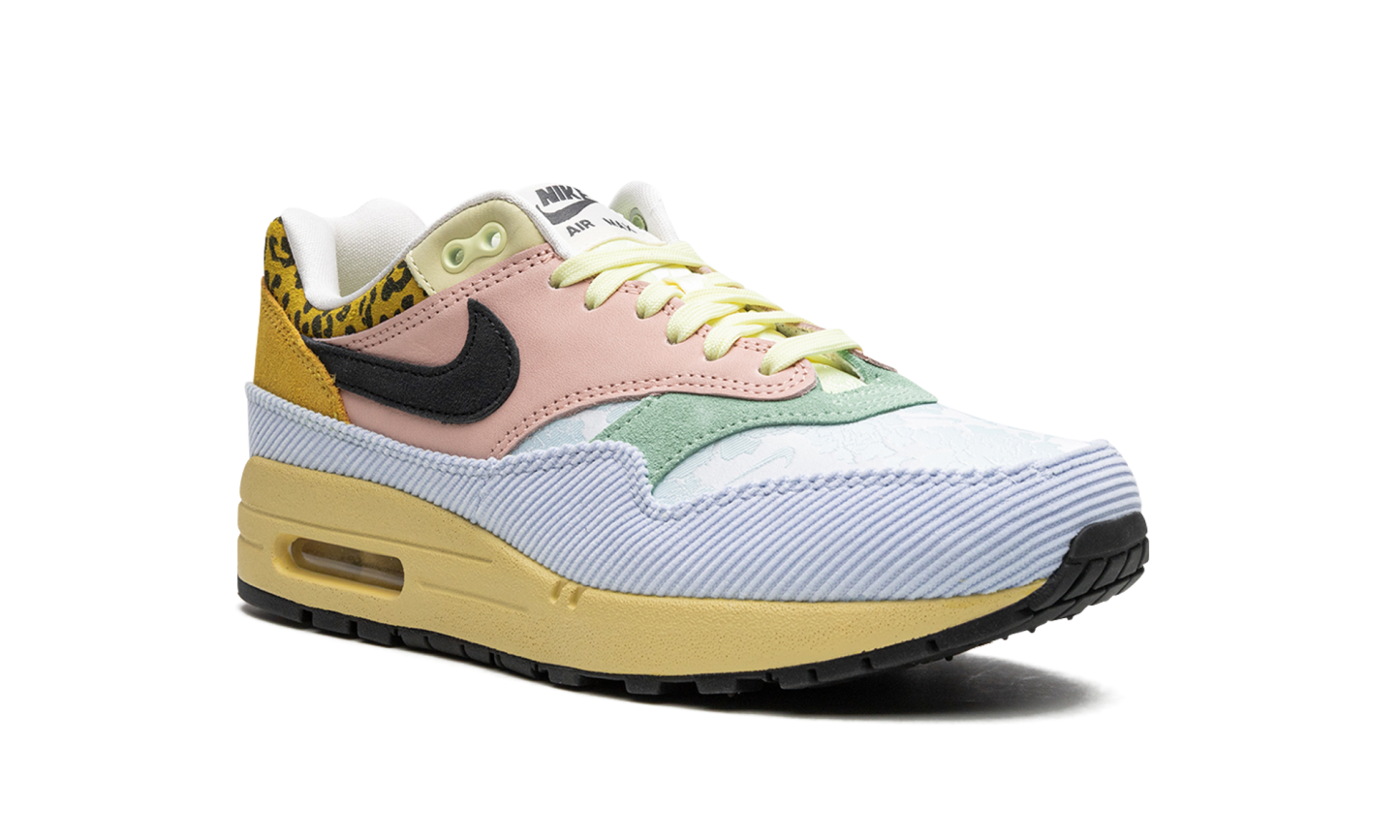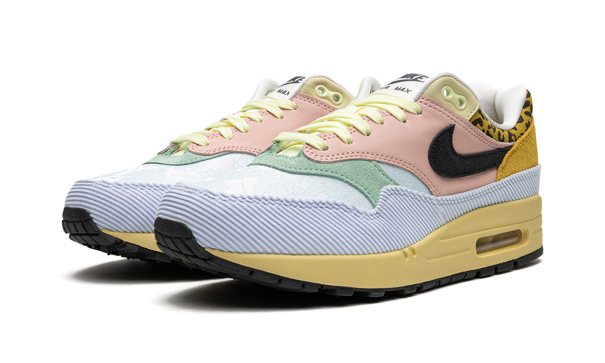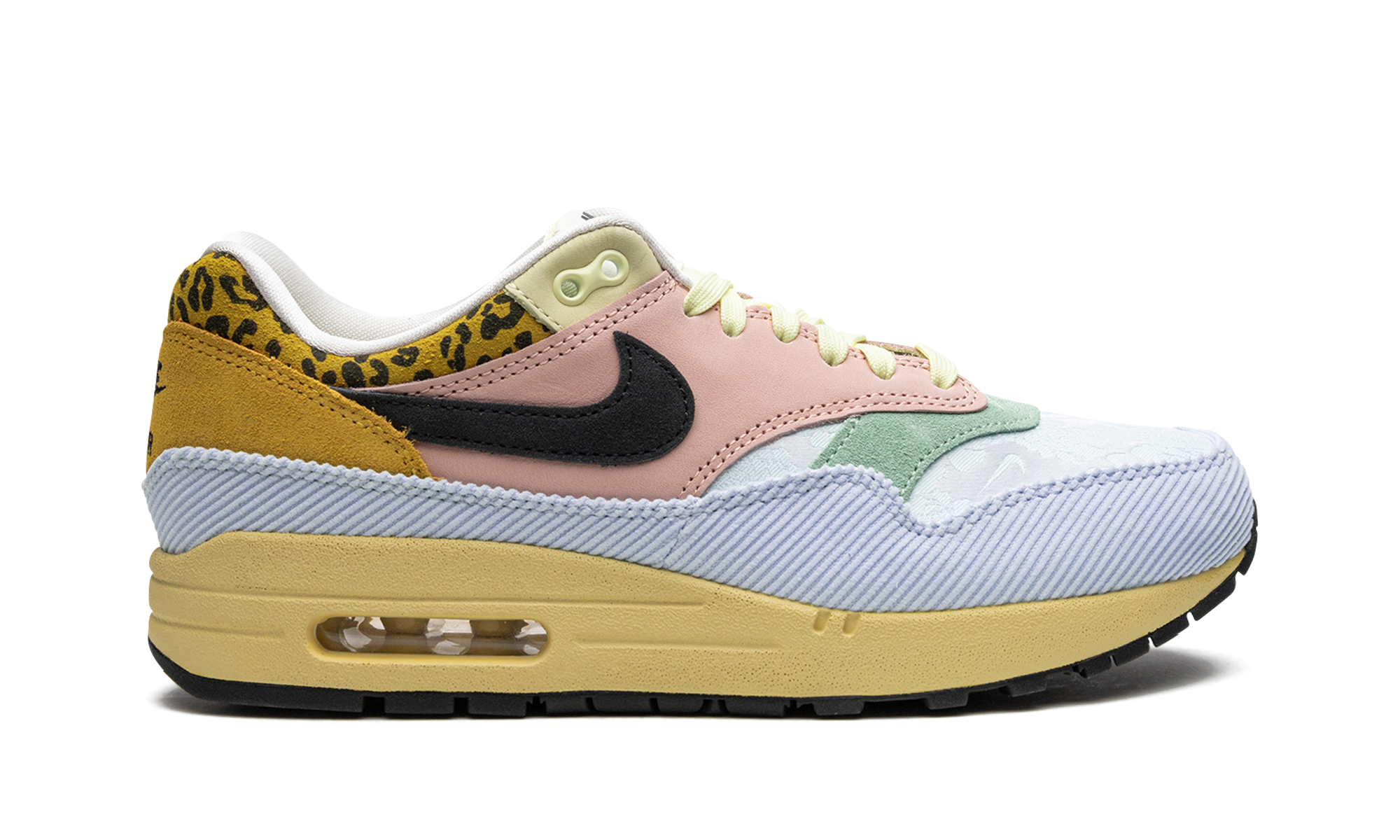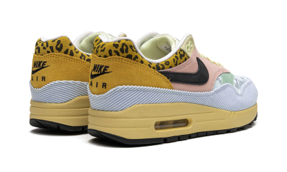 The Women’s Nike Air Max 1 ‘87 “Great Indoors - Corduroy” is a women’s-exclusive colorway of the iconic retro running shoe with a mismatched design. The “Great Indoors - Corduroy” features a mismatched appearance in a mix of pastel hues. Shades of blue, yellow, green, and pink are found throughout the design. Leopard print appears on the collar. A black Swoosh is found on the sides. Classic “Nike Air” detailing is located on the heel and “Nike” and Swoosh logos dot the tongue. A yellow midsole with an oversized Air cushioning unit completes the look. Great Indoors Corduroy