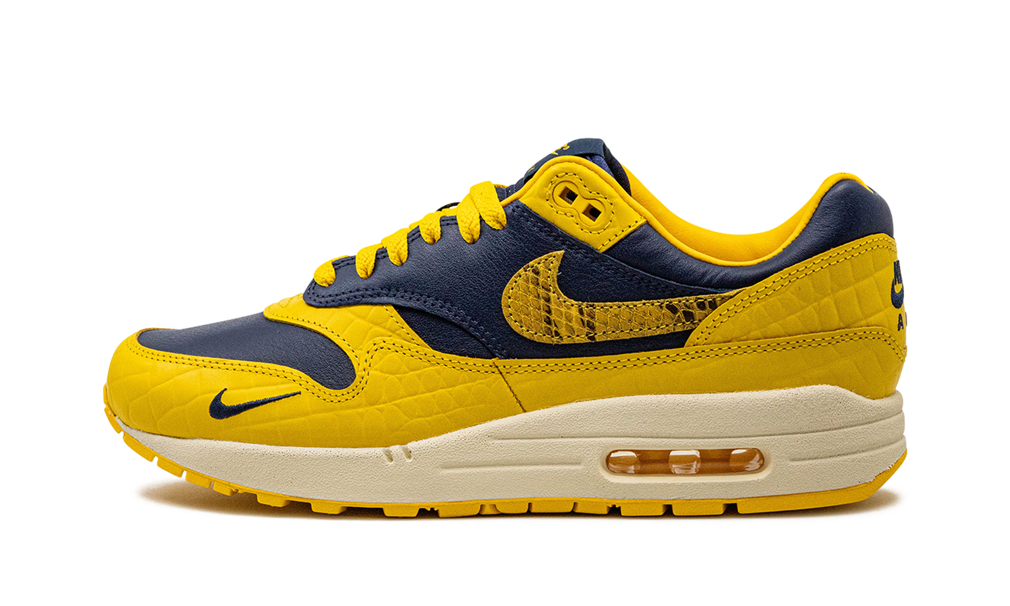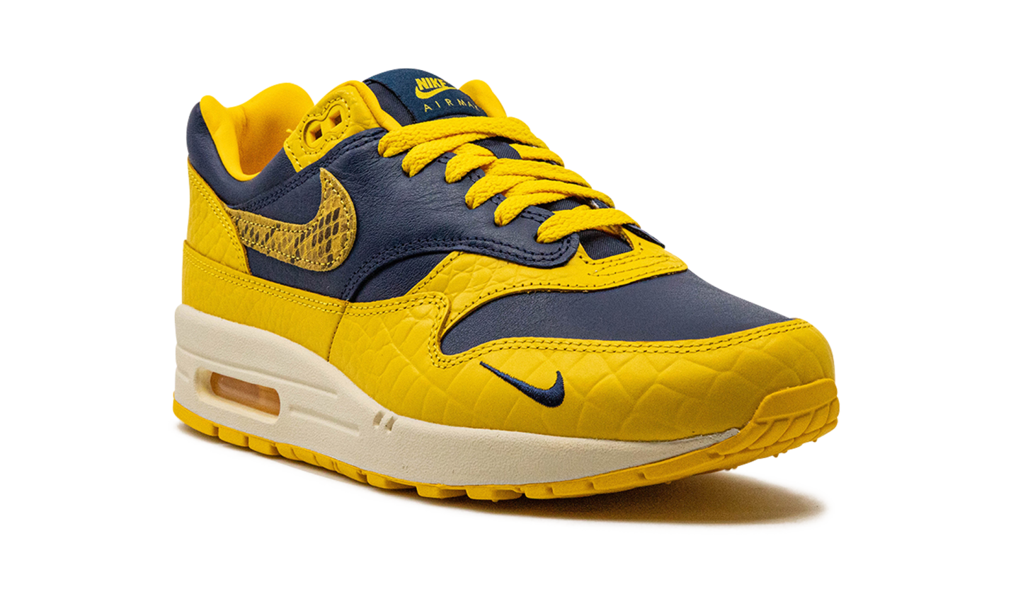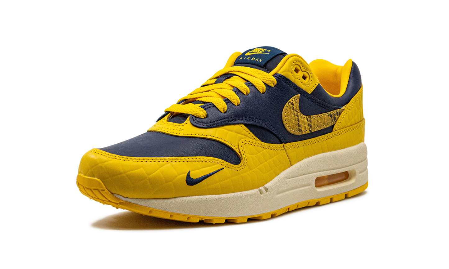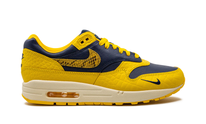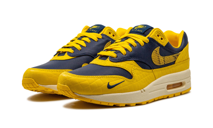 The Women’s Nike Air Max 1 Co.Jp “Michigan Snakeskin” is a women’s-exclusive colorway of the retro running shoe included in Nike’s bringback of the “Concept Japan” collection. The bold “Michigan Snakeskin” colorway features a Midnight Navy leather base with Varsity Maize textured pebbled leather overlays. Yellow reptilian-designed Swooshes appear on the side. Classic “Nike Air Max 1” branding is printed on the tongue and a small navy Swoosh is embroidered on the forefoot. Additional “Nike Air” insignia is embroidered on the heel. Release date: June 21, 2023 Co.jp Head to Head