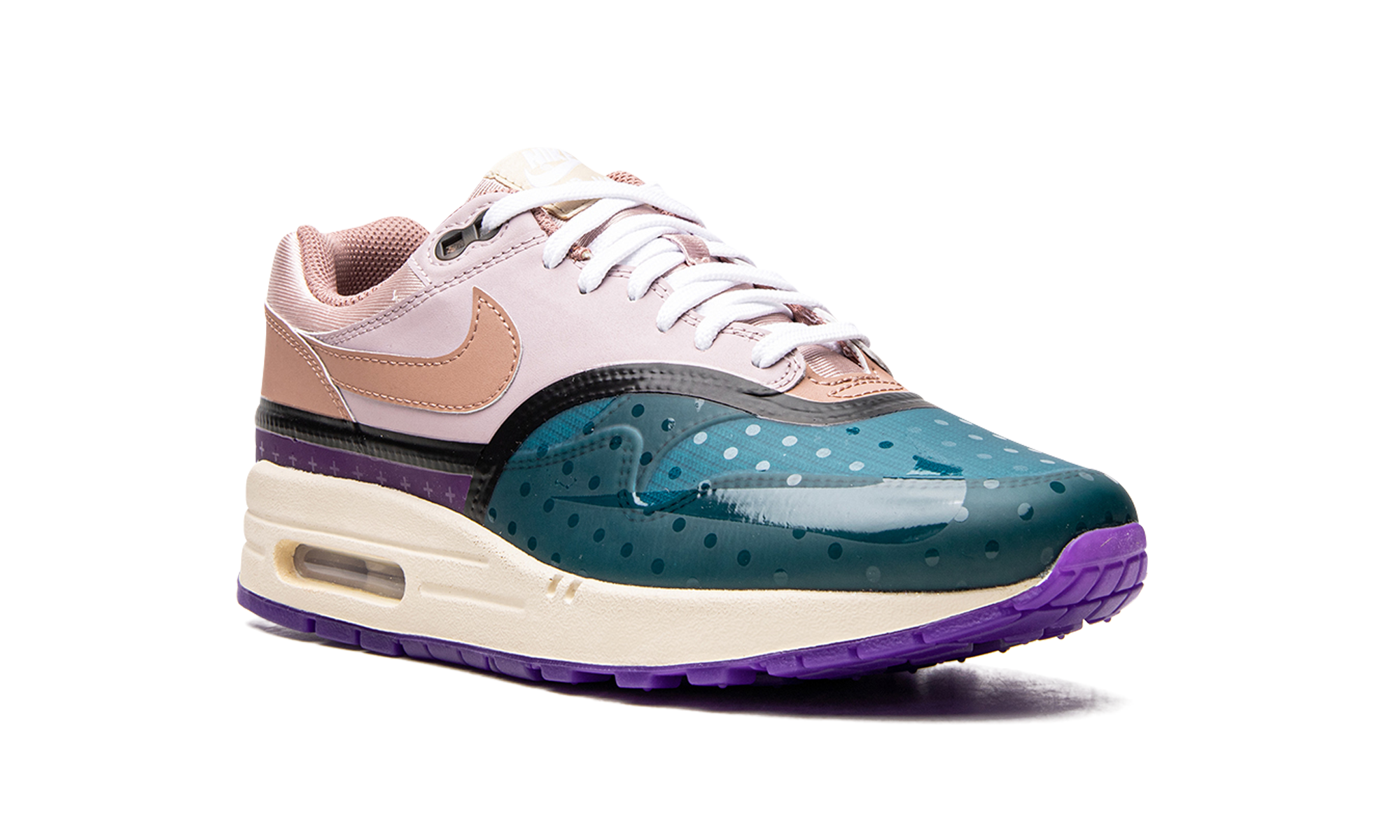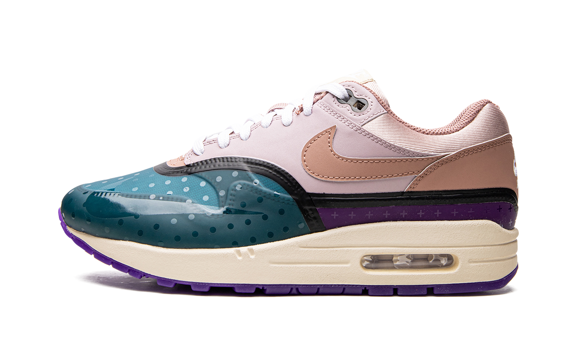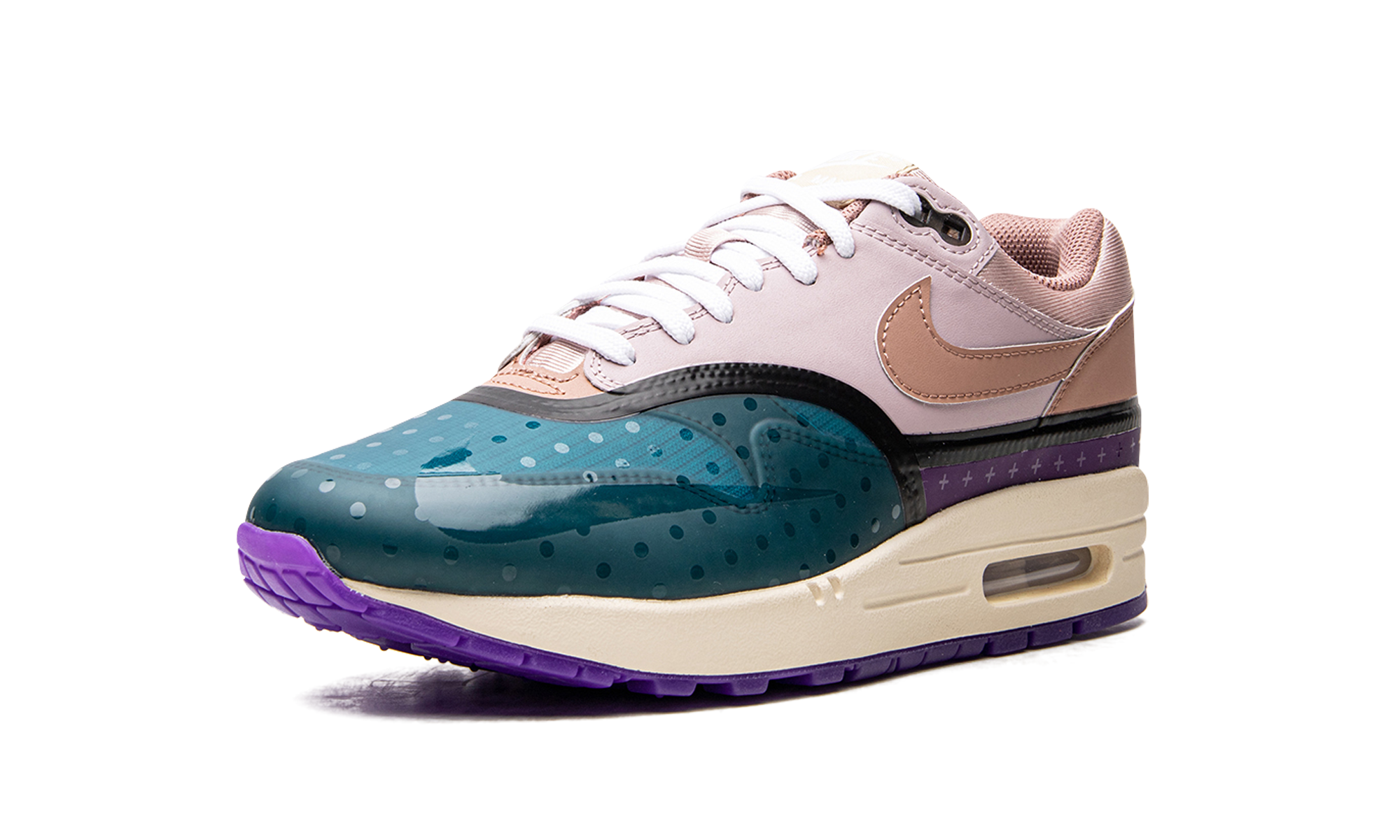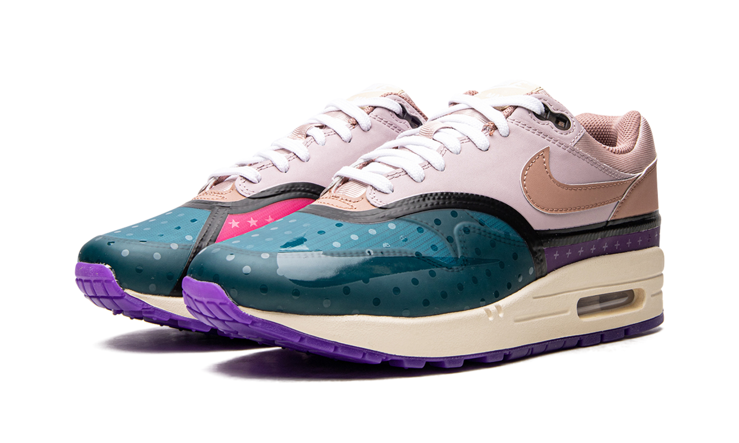 The Women’s Nike Air Max 1 “Mini Symbols” emerges in a premium, multi-color ensemble covered in miniature symbols. This sneaker features an arrangement of leather, synthetic Hyperfuse and mesh materials coming together throughout the upper in a refreshing layout. Shades of teal, purple, pink and blue for the Hyperfuse panels feature glossy patterns of dots, stars and other symbols for a unique look. An off-white midsole and translucent purple rubber outsole complete this intriguing take on the classic running shoe. Plum Fog Fossil Rose