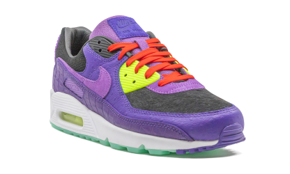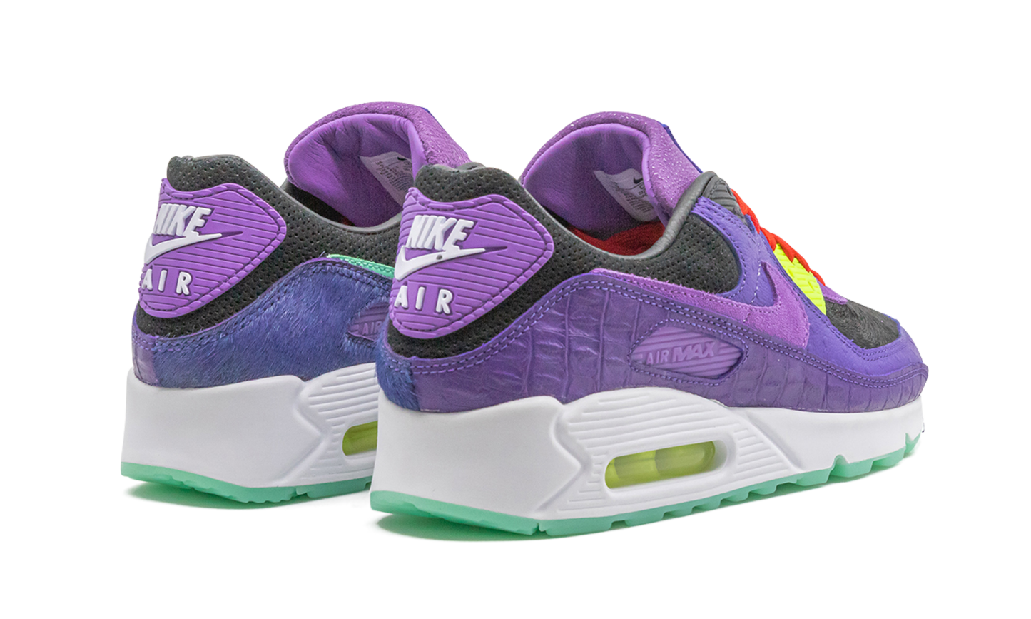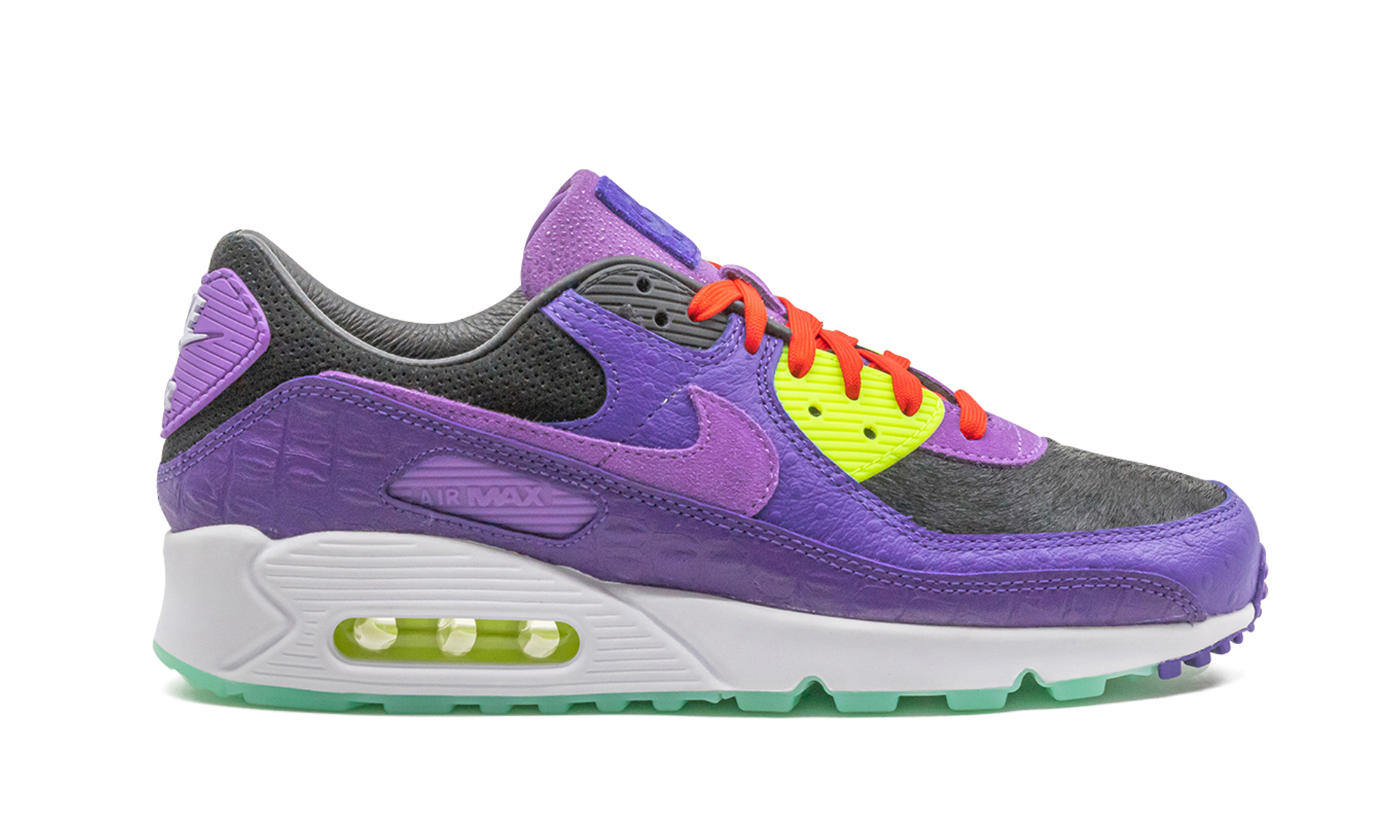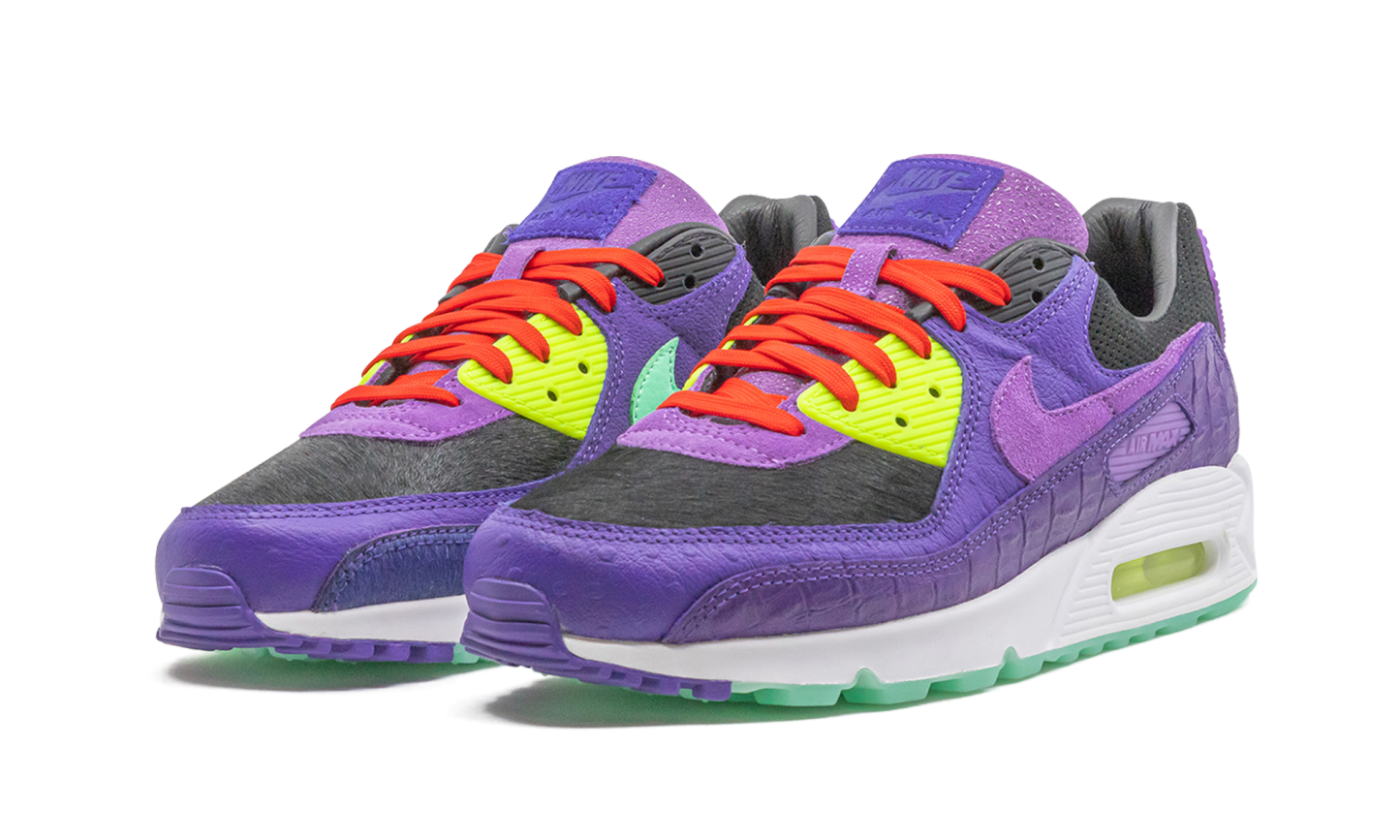 The Nike Air Max 90 “Animal Pack - Violet Blend” features a stunning mixture of exotic faux animal prints for a radically new and exciting colorway for the venerable performance runner. Nike’s Air Max 90 is undoubtedly one of the most successful silhouettes in the brand’s history. While designs of the Air Max 90 tend to feature casual colorways that underscore the model’s performance-based traits, this “Violet Blend” makeup veers in the direction of the lifestyle footwear space. The upper features black pony hair on the toe and deep purple croc-textured leather on the mudguard. A lighter shade of purple ostrich leather appears on the overlay located on the mid-panel. Tonal suede Swoosh detailing can be found on either side. Neon Green lace holds, bold red laces, and a dark purple “Nike Air Max” branded tongue tab sewn onto the purple synthetic tongue add to the unique look of this low-top shoe. To finish off the design, Nike places classic “Nike Air” branding on the back of the silhouette and opts for a white midsole and mint green outsole. Release date: August 9, 2020. Animal Pack - Violet Blend