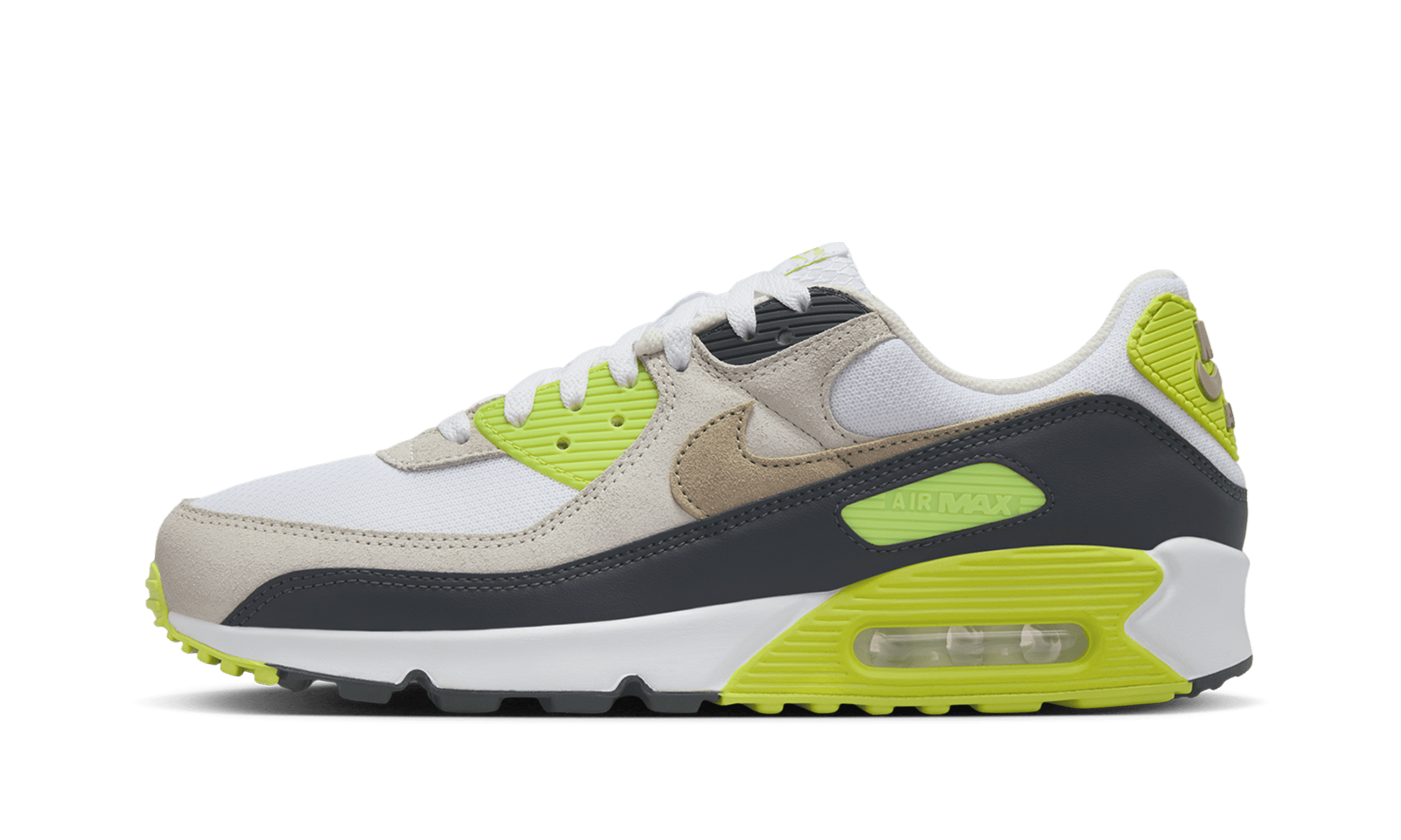 The Nike Air Max 90 is a cultural icon, celebrating the intersection of art, music, and sneaker design from the 1990s. The "White Cyber" edition revamps the iconic runner with a mix of neutral tones and a vibrant, digitally inspired neon accent. Cyber