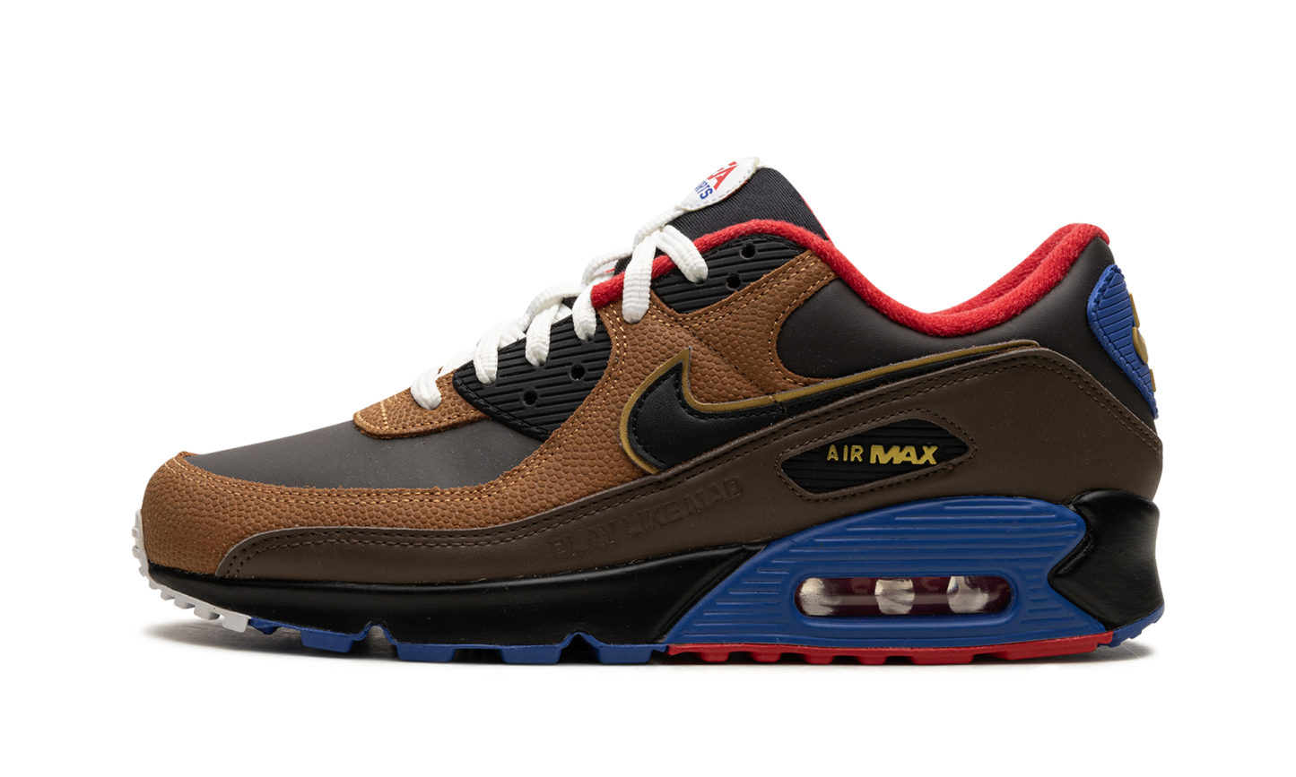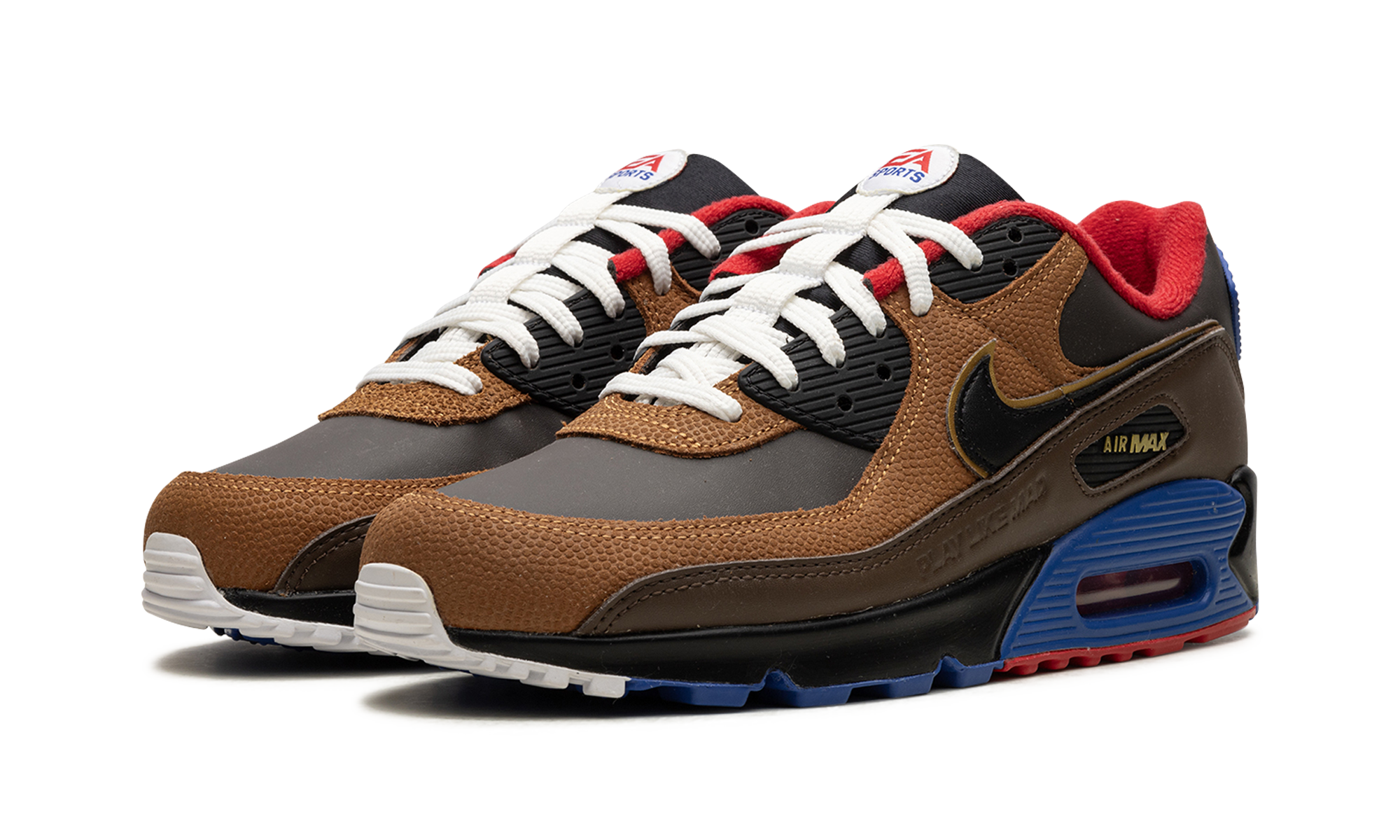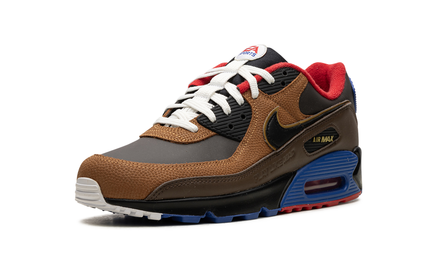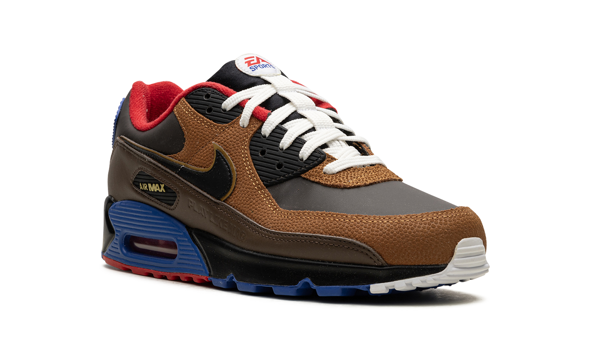 The EA Sports x Nike Air Max 90 "Play Like Mad" is a collaboration by the video game franchise and Nike on a colorway of the retro running shoe inspired Madden NFL 2024. This special team-up between EA Sports and Nike gives the Air Max 90 a football-inspired look with a brown textured leather upper that mimics the dimples of a pigskin football. A dark brown leather base balances out the look. “Play Like Mad,” Madden NFL’s slogan, is debossed on the brown leather mudguard. Classic “Air Max” branding is featured on the lateral side of the heel and on the back of the shoe in gold lettering. The royal blue and red accents found throughout the shoe are a nod to the NFL logo and the Buffalo Bills, the team quarterbacked by Josh Allen, who is the cover athlete on Madden NFL 2024. Release date: August 25, 2023 EA Sports - Play Like Mad