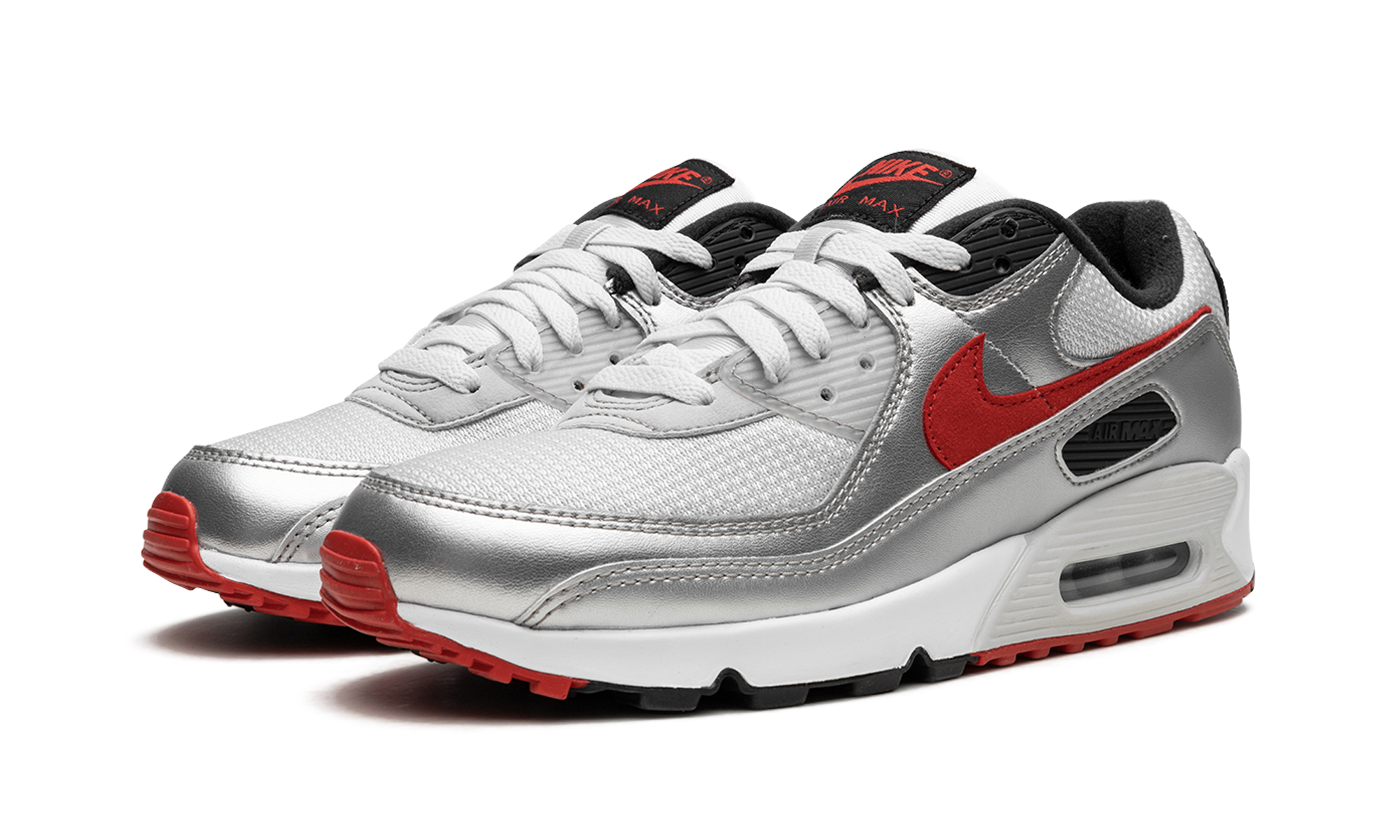 The Nike Air Max 90 “Icons - Silver Bullet” is a colorway of the retro running shoe inspired by the equally iconic Nike Air Max 97 of the same nickname. Celebrating its Air Max legacy, Nike dresses the Air Max 90 in a colorway reminiscent of the Air Max 97’s “Silver Bullet” release from 1997. The sneaker has a white mesh base contrasted with Silver Metallic leather overlays. A fiery red Swoosh appears on the sides. Black “Air Max” branding is found within a branding window on the lateral side of the heel. Classic “Nike Air” detailing appears on the heel and on the tongue tag. A clear Air bubble in the heel of the white foam midsole completes the look. Release date: April 13, 2023 Icons - Silver Bullet