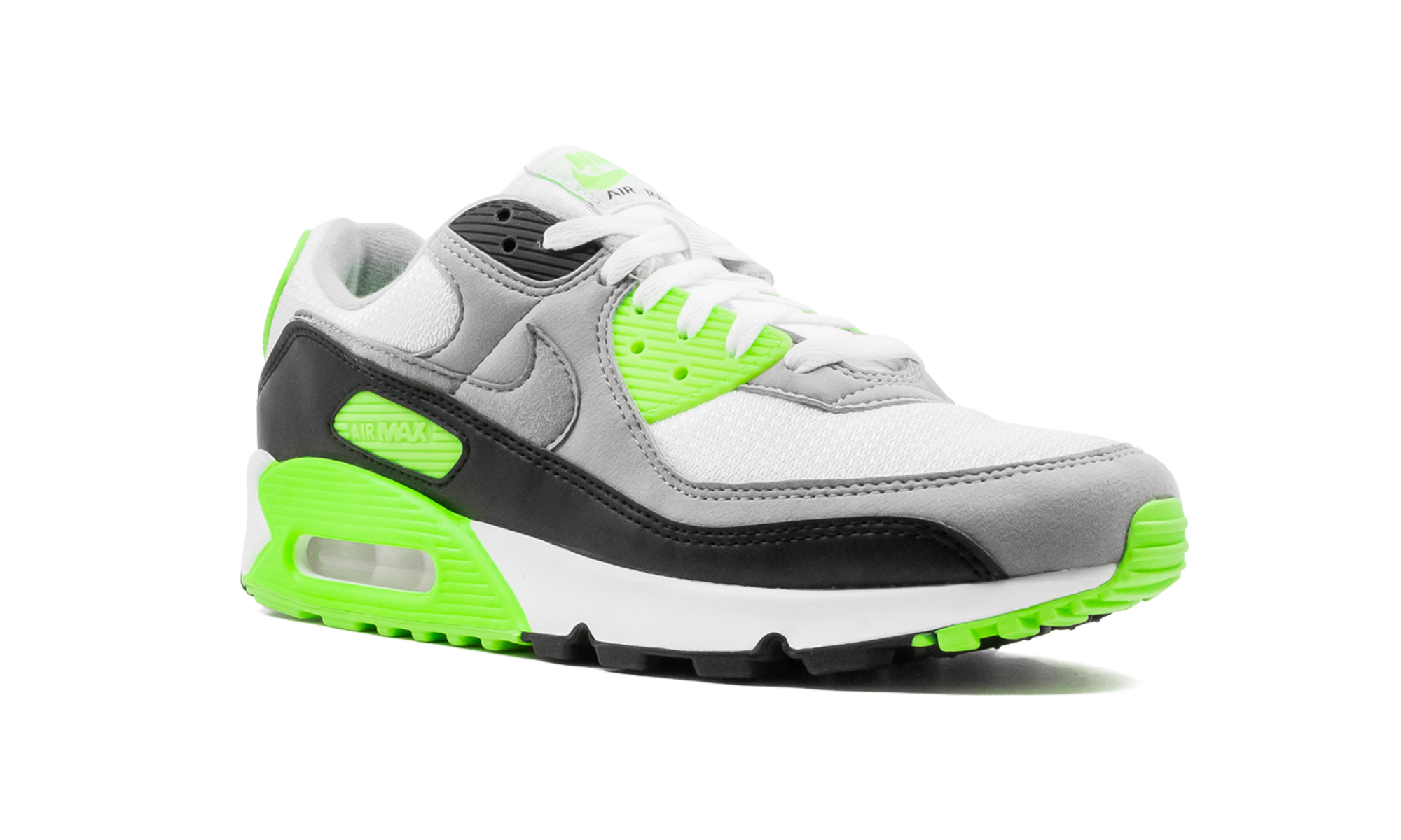 The Nike Air Max 90 “Lime” is an OG-inspired colorway and construction for the iconic retro runner. The eye-catching upper contains mesh and synthetic materials in white and black with neon green accents. Nike branding appears on the tongue of the model, complemented by the Nike Swoosh, Air Max logo along the side, and Nike Air emblem on the heel. The white midsole contains a translucent Air Max unit surrounded by lime accenting, adding a superior layer of support and cushion for long-lasting wear and durability. Lime