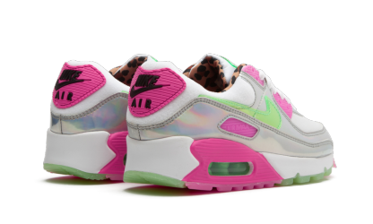 The Nike Air Max 90 LX “Iridescent Leopard” is a women's exclusive style that honored the iconic silhouette's 30th birthday in 2020. Starting with white and pink on the upper, this style plays up the Air Max 90's fun side. Nike makes the celebratory style pop with iridescent materials and a touch of animal print, creating a bold look. Replacing the traditional Nike branding is a playful daisy motif on the tongue patch and insole graphic. Staying true to its roots, the Nike sneaker uses its original waffle sole, along with stitched overlays and classic TPU accents. Iridescent Leopard