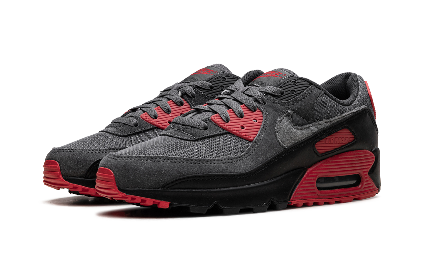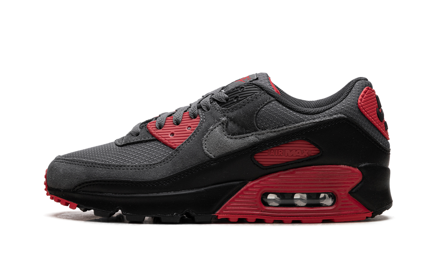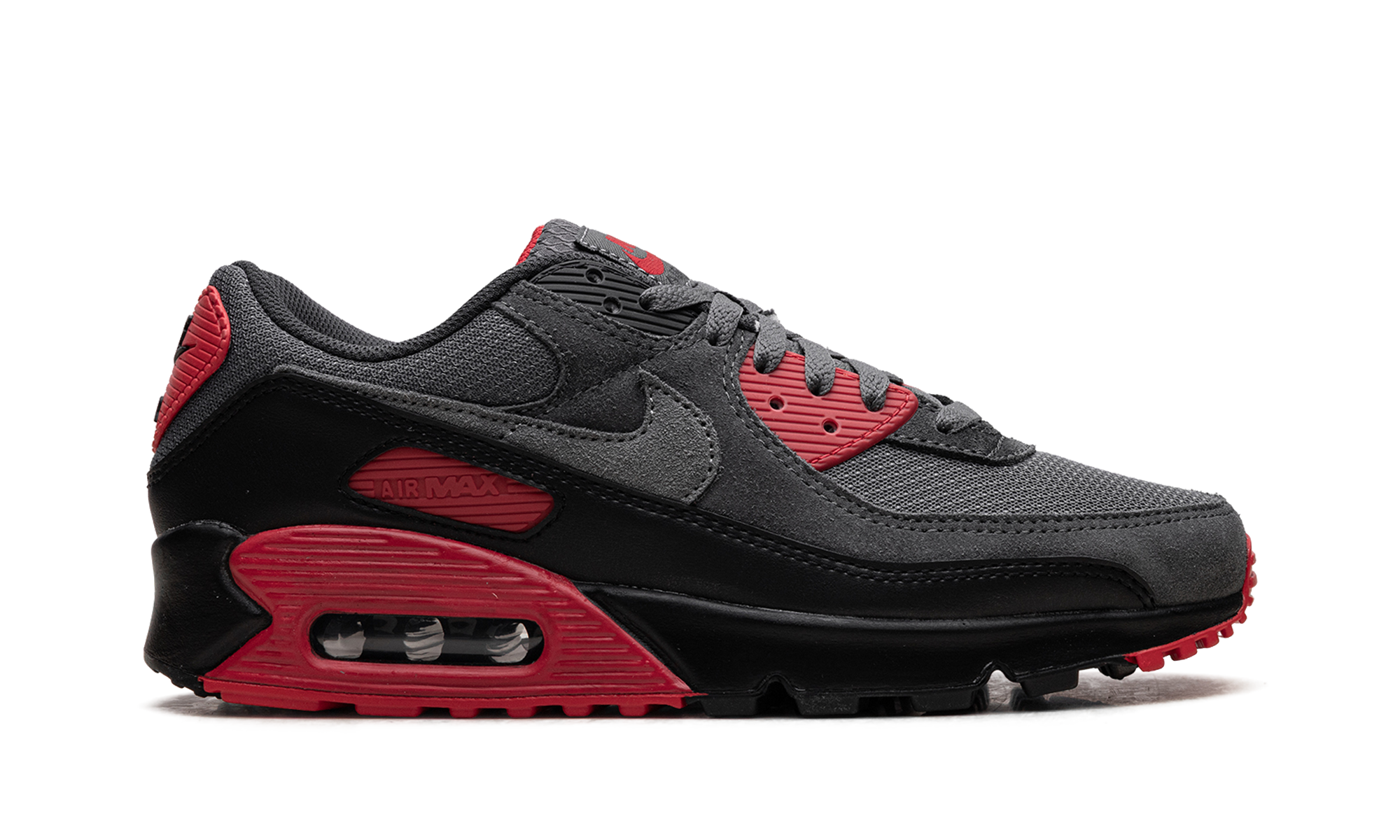 The Nike Air Max 90 is a celebrated icon, and this Black/Iron Grey/Fire Red (DM0029 007) colorway brings a bold, modern edge to its classic '90s running heritage. It combines deep, smoky neutrals with explosive pops of red for a look that's both stealthy and striking. Smoke Grey Fire Red
