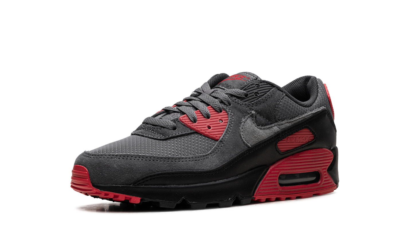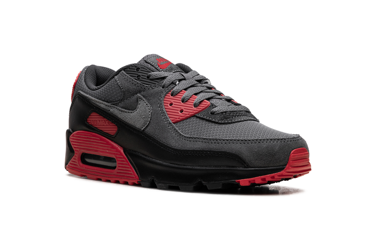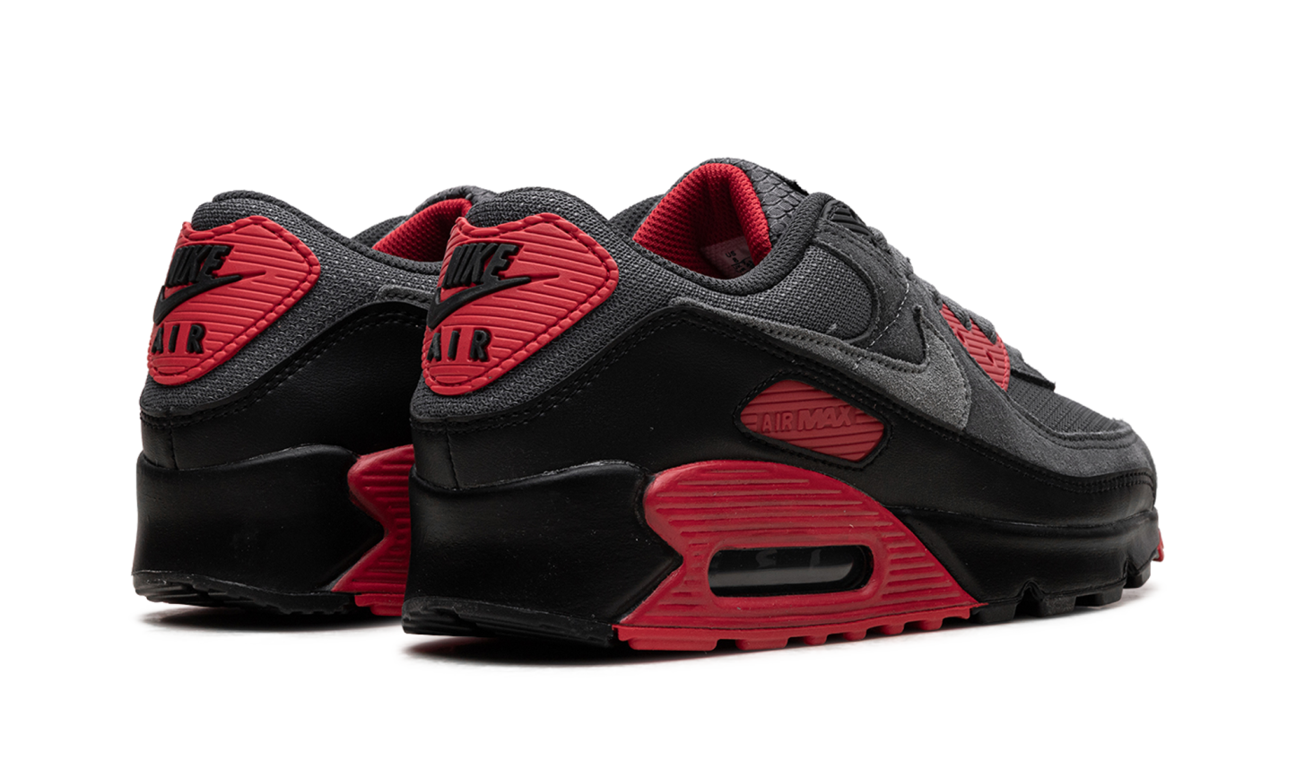 The Nike Air Max 90 is a celebrated icon, and this Black/Iron Grey/Fire Red (DM0029 007) colorway brings a bold, modern edge to its classic '90s running heritage. It combines deep, smoky neutrals with explosive pops of red for a look that's both stealthy and striking. Smoke Grey Fire Red