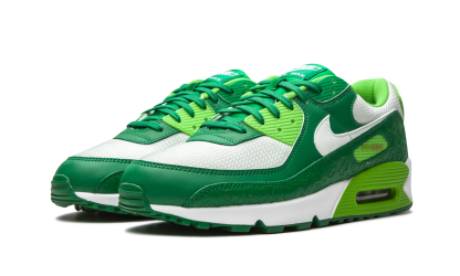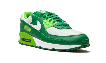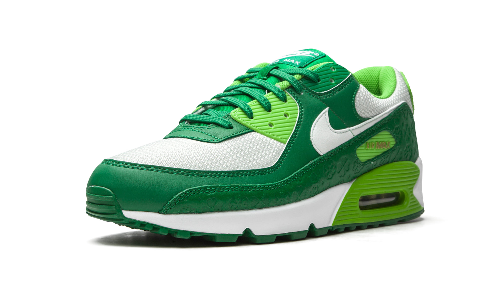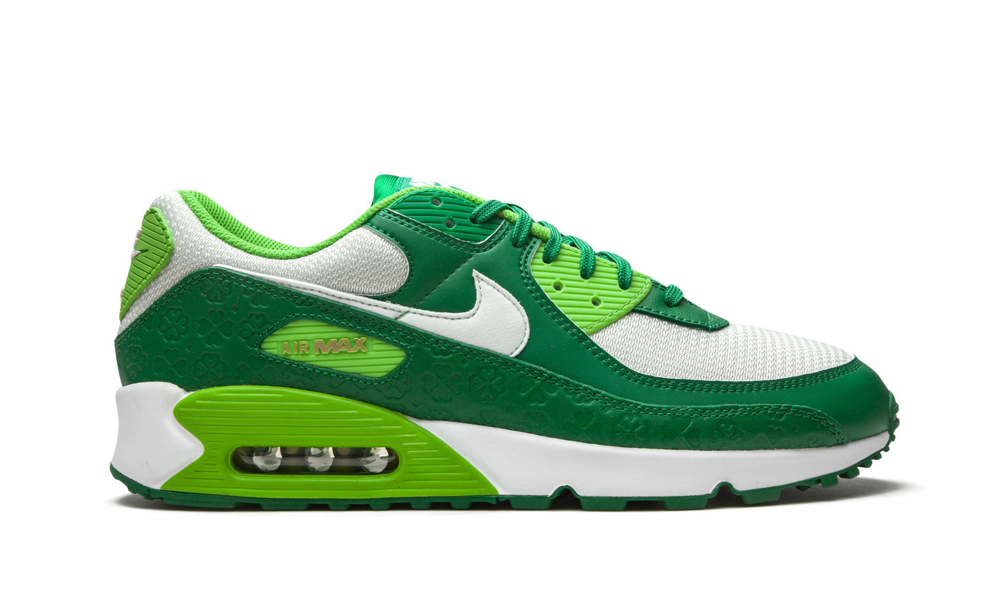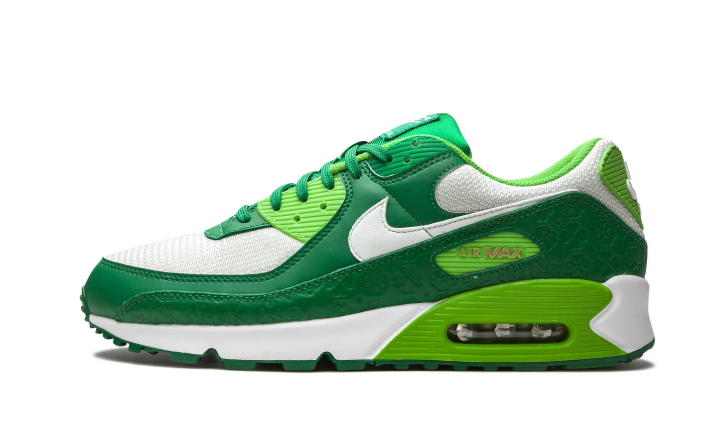 The Nike Air Max 90 “St. Patrick’s Day” is a special colorway of the retro performance running shoe dedicated to the cultural celebration. A March 2021 release by Nike, the “St. Patrick’s Day” features a “Luck of the Irish” theme with embossed four-leaf clovers on the model’s green leather mudguard. White mesh detailing on the toe, collar, and heel balances the look of the green leather overlays on the mid-panel, forefoot, and heel. A lime green “Air Max” branding window is located on the lateral side of the shoe and a white leather Swoosh can be found on the mid-panel. Classic “Nike Air” detailing graces the heel and a green nylon tongue with a white “Nike Air” branding patch continue the “St. Patrick’s Day” theme in earnest. Green eyelets and a green panel around the visible Air cushioning unit in the heel of the white midsole put the finishing touches on this festive look for the Air Max 90. Release date: March 12, 2021. St Patrick's 2021