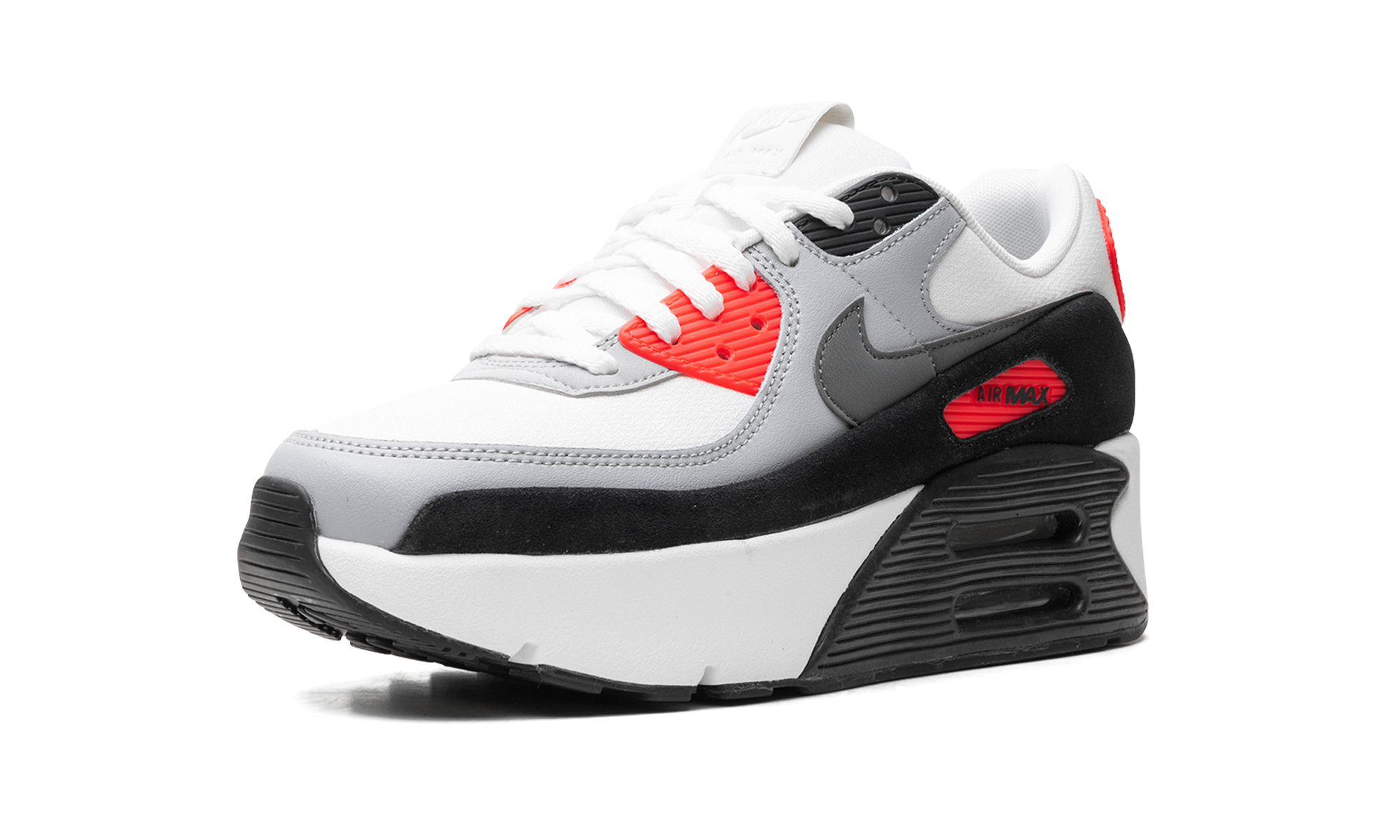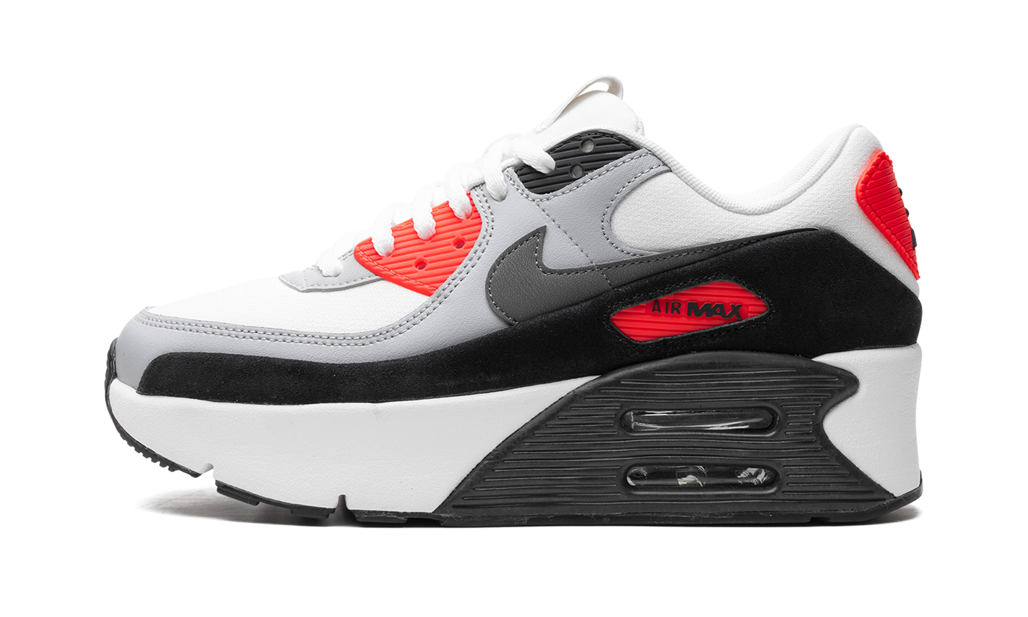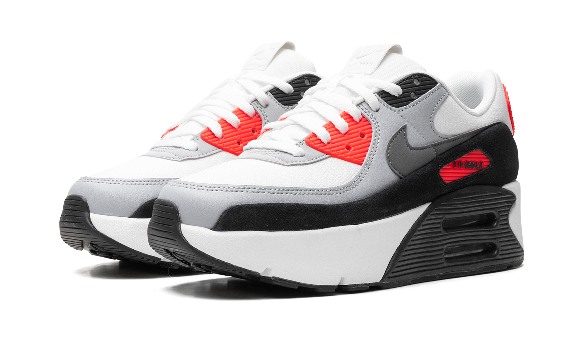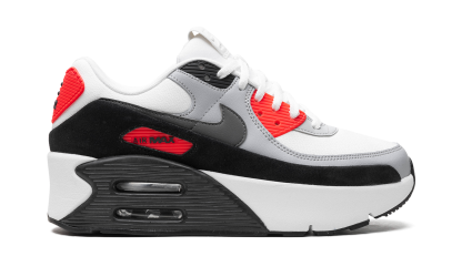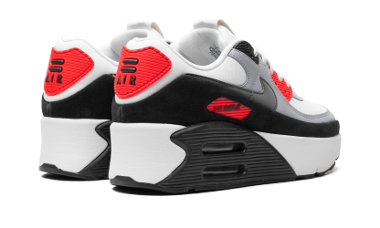 The Women’s Nike Air Max 90 Double Stacked "Infrared" is a women’s-exclusive colorway of the retro running shoe with a platform-style sole. The Nike Air Max 90 Double Stacked updates the Air Max 90’s classic design with double-stacked Air units in the heel of the midsole, giving the classic shoe a contemporary look. On the “Infrared” colorway, the shoe features a white textile base and a grey synthetic nubuck mid-panel overlay. An Infrared colored “Air Max” branding window appears on the lateral side of the black leather mudguard, while a smokey Swoosh logo can be seen on both sides of the shoe. A modified “Air” logo appears on the Infrared-colored heel counter, while a debossed “Nike Air” logo can be found on the tongue. As mentioned above, the shoe has stacked Air cushioning units in the heel of the midsole that add a boost in height to the wearer. Infrared