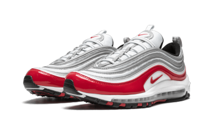 The Nike Air Max 97 pays respect to the original Air Max 1 as it borrows the distinctive red color for the mudguard. This Air Max 97 starts with a white base and overlays reflective silver piping for the classic Nike runner's wavy lines. A red mudguard dressed in patent leather gives the Air Max 97 some dressed-up flair. The Nike Air Max 97 is finished with a white midsole, a clear full-length Air unit, and a red and black sole.
