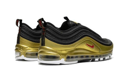 This colorway of the Nike Air Max 97 first released in November 2018. It is inspired by the OG "Metallic Gold" color scheme. The upper is composed of black mesh with reflective black overlays. Metallic gold hits inspired by the 1997 OG are used on the mudguard, tongue, and midsole. Red branding on the side panel, tongue, and heel tab are also pulled from the original design. Black / Metalic Gold
