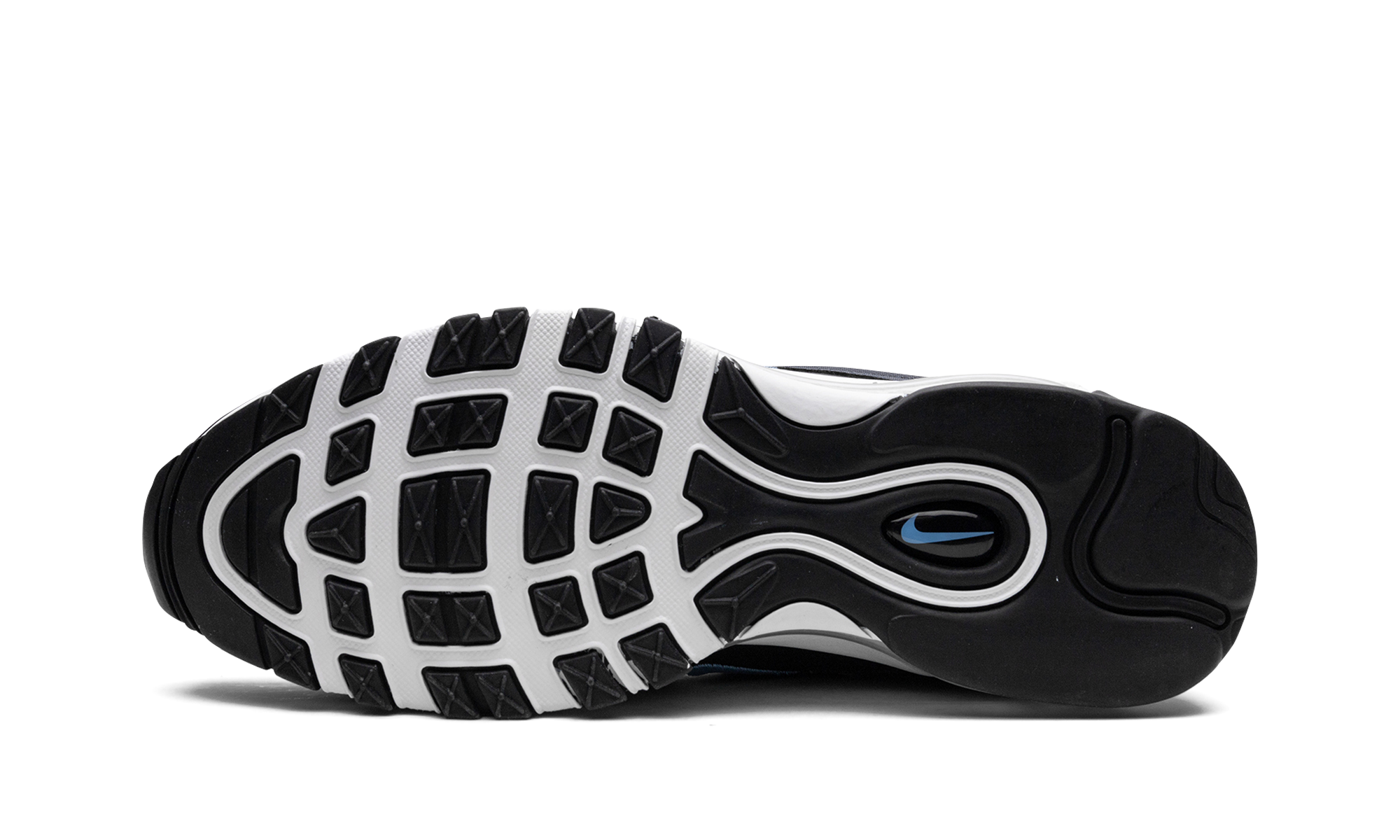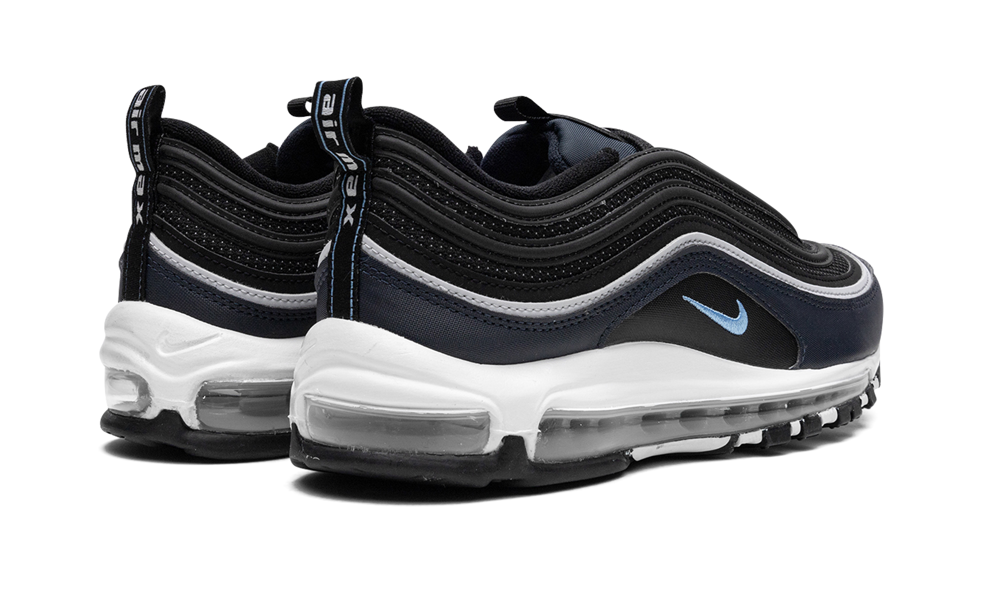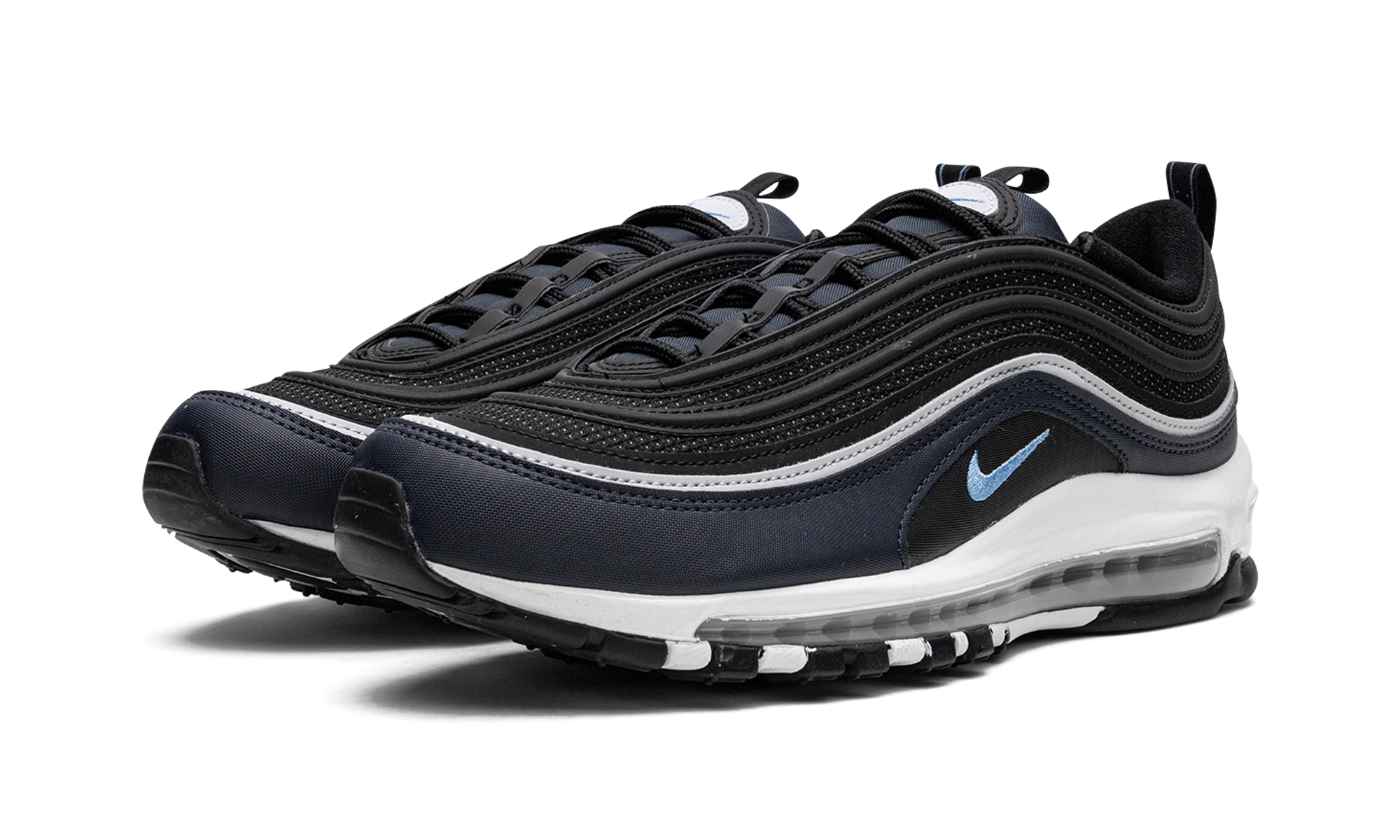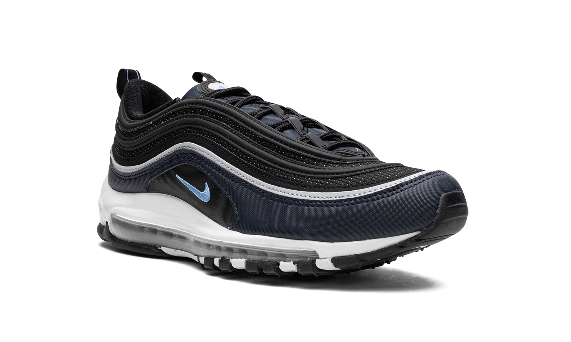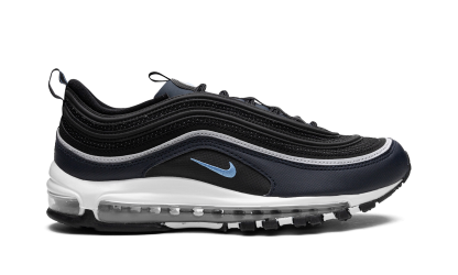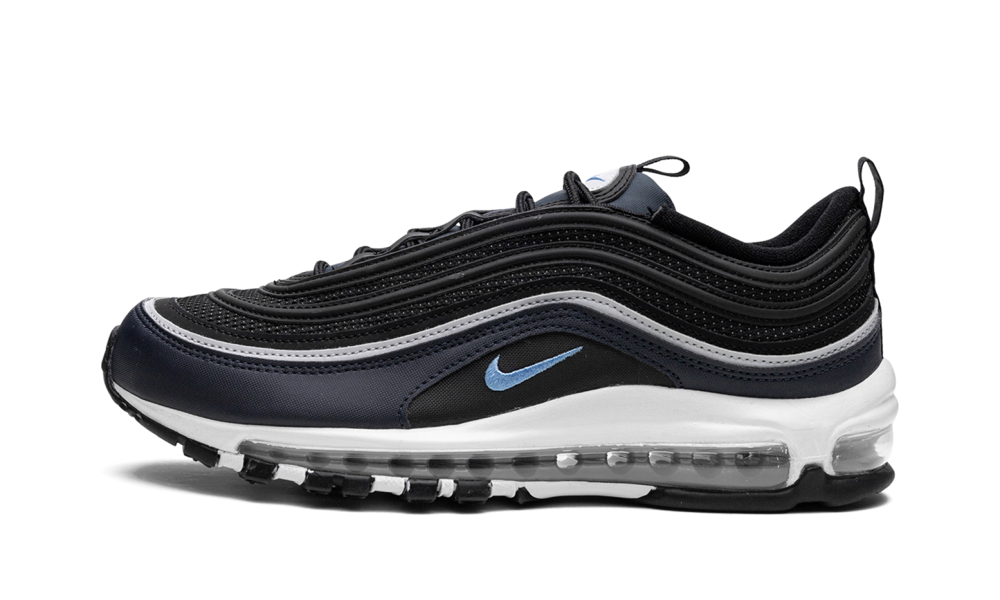 The Nike Air Max 97 “Dark Obsidian” is a colorway of the retro performance running sneaker with dark blue accents. A Spring 2023 release, the “Dark Obsidian” features a black mesh base with Dark Obsidian, or dark navy, on the mudguard. The Air Max 97’s wavy overlays appear in a gradient color scheme that goes from grey to black to blue. A University Blue Swoosh is embroidered on either side. The white foam midsole features a full-length visible Max Air cushioning unit. Dark Obsidian