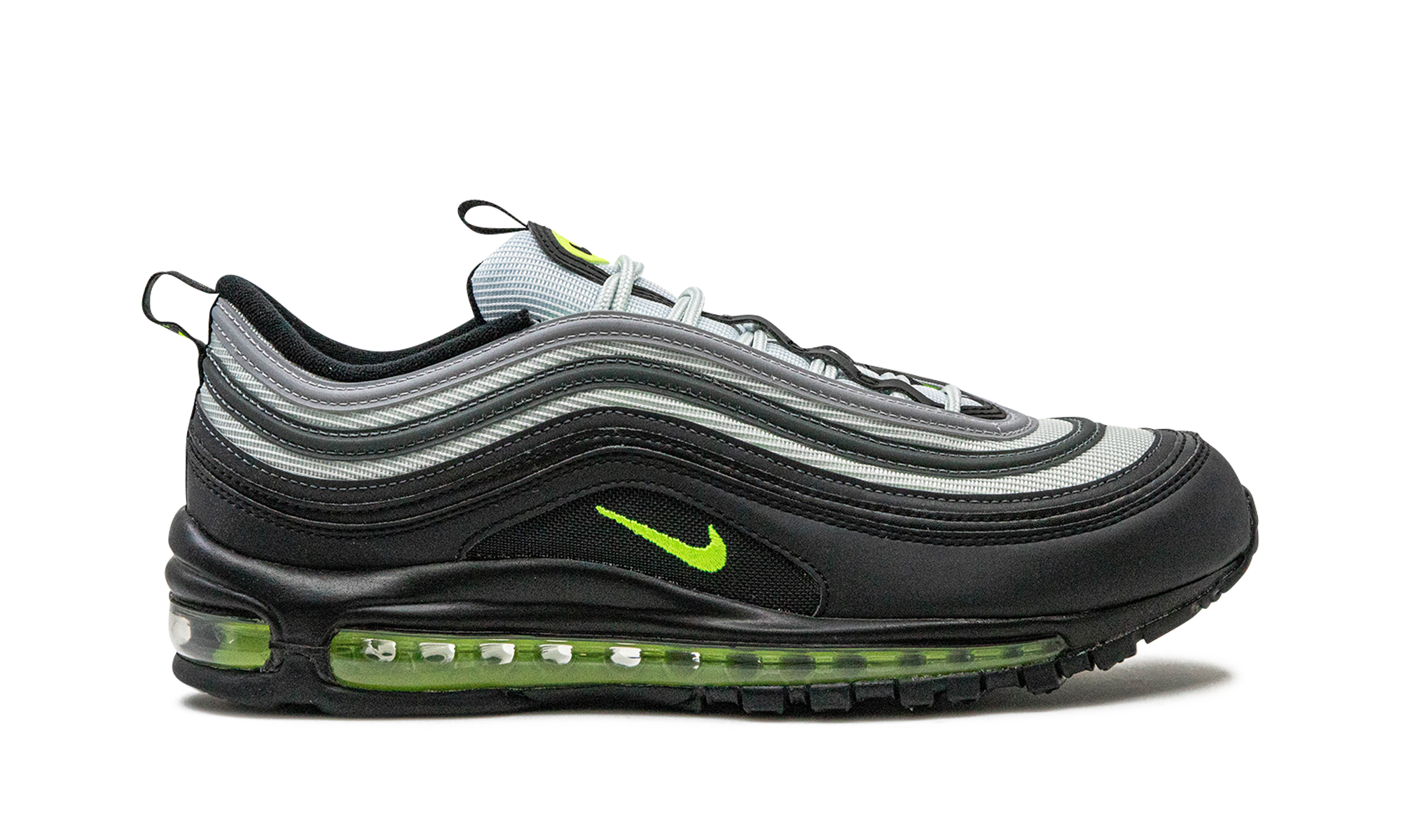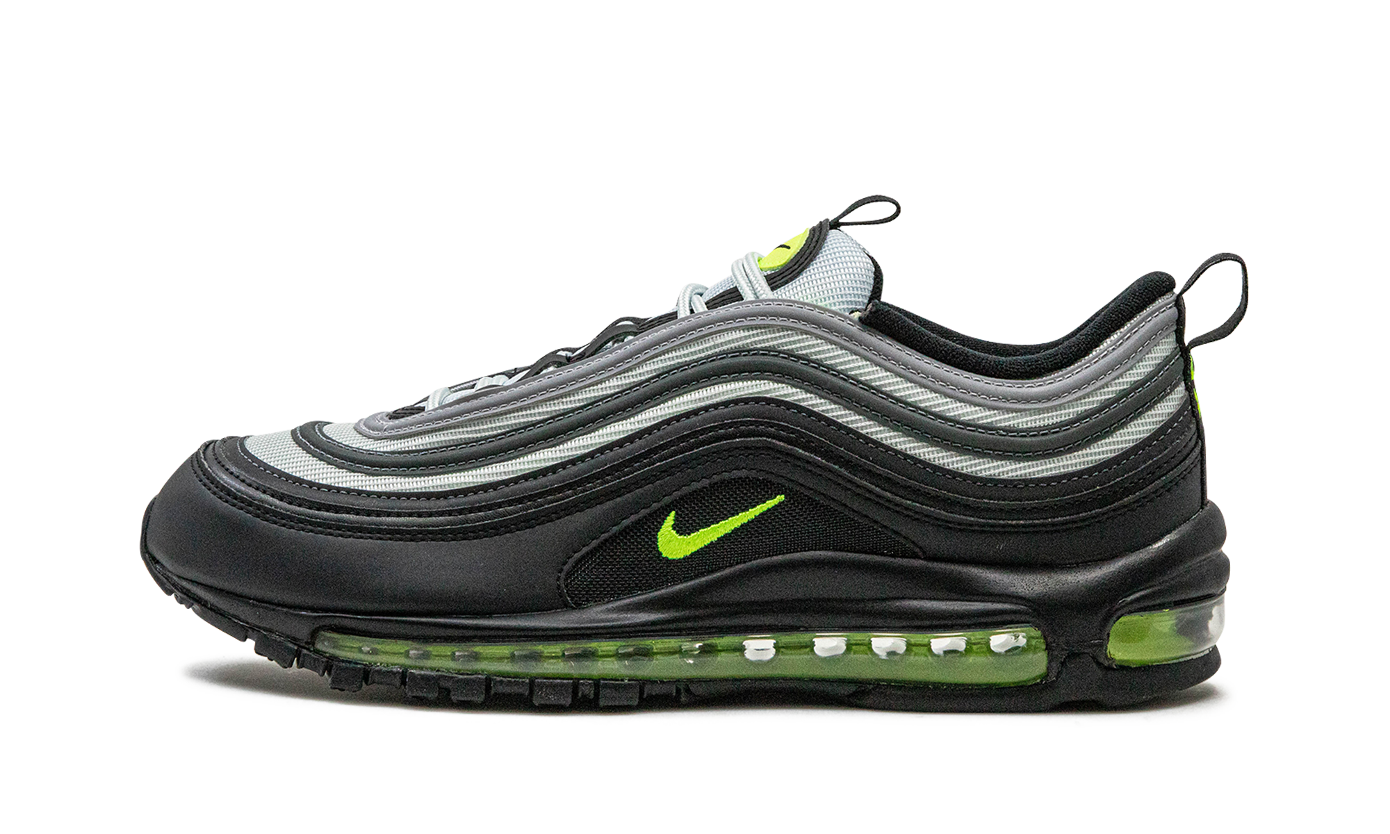The Nike Air Max 97 “Icons - Neon” is a colorway of the retro running shoe from a collection that features color palettes inspired by classic Air Max models. The “Icons - Neon” shows love to the Nike Air Max 95 “Neon” colorway by featuring the shoe’s black, grey, and neon green/yellow color block on its design. The shoe has a grey mesh base with grey-to-black gradient leather overlays. A Volt-colored Swoosh is embroidered within a window on the black leather mudguard. Additional Volt accenting comes into play on the Swoosh emblem on the tongue and “Air Max” branding on the pull tab on the heel. Underfoot, the Volt-tinted, full-length Max Air cushioning bubble in the shoe’s midsole completes the look. Icons - Neon