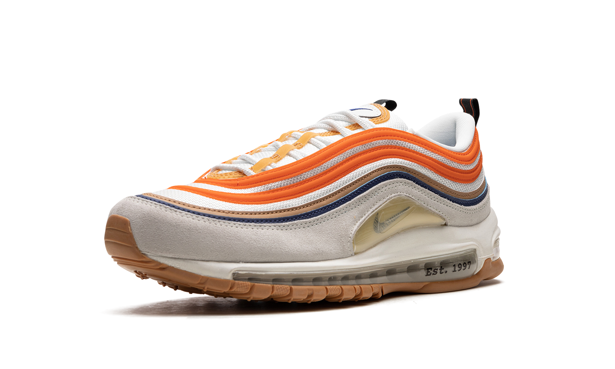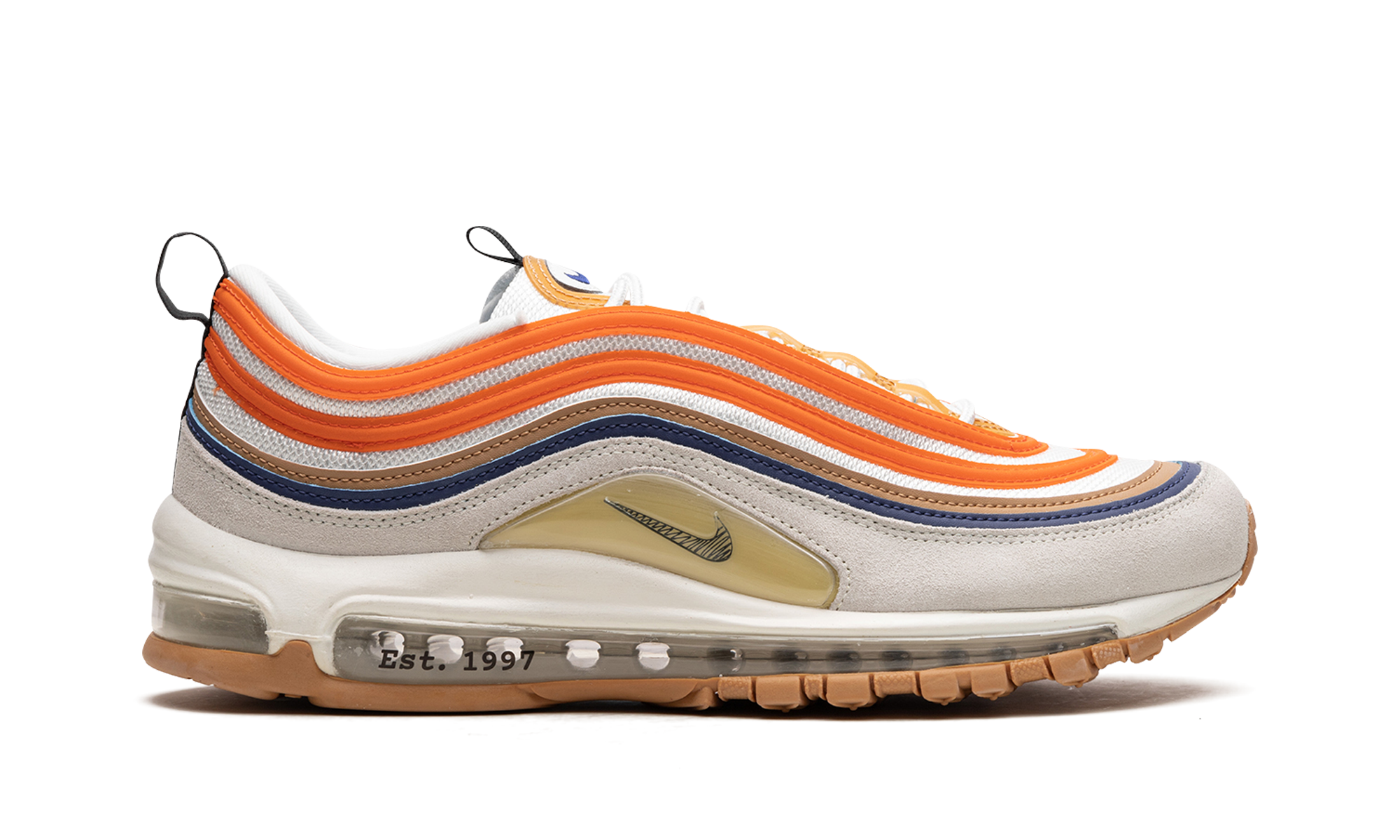 The Nike Air Max 97 “Frank Rudy” is a colorway of the retro running and lifestyle shoe that celebrates the life of the designer of Nike’s Air technology. Marion “Frank” Rudy is the innovator of Nike’s iconic Air cushioning technology and, on the Air Max 97, the brand celebrates Rudy’s accomplishments. The shoe features a white mesh upper with fiery orange leather overlays matched with tan and navy overlays. A grey suede mudguard and a tan overlay with a small black Swoosh on the sides adds to the look. An air pressure barometer hangtag nods to the former aerospace engineer’s achievements. Release date: February 23, 2023 Frank Rudy
