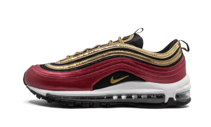 The Nike Women's Air Max 97 perfects the art of reinvention with a modernized version of the iconic Air Max 1 style. With the edgy silhouette, Nike combines a black mesh upper with a striking red mudguard and glistening gold detailing. This edition of the Air Max is topped off with a metallic Nike Swoosh and a black rubber outsole, and offers a lightweight feel with mesh, synthetic, and leather materials. The Air Max 97 also includes Air Max technology as well as Max Air cushioning. Icon Clash