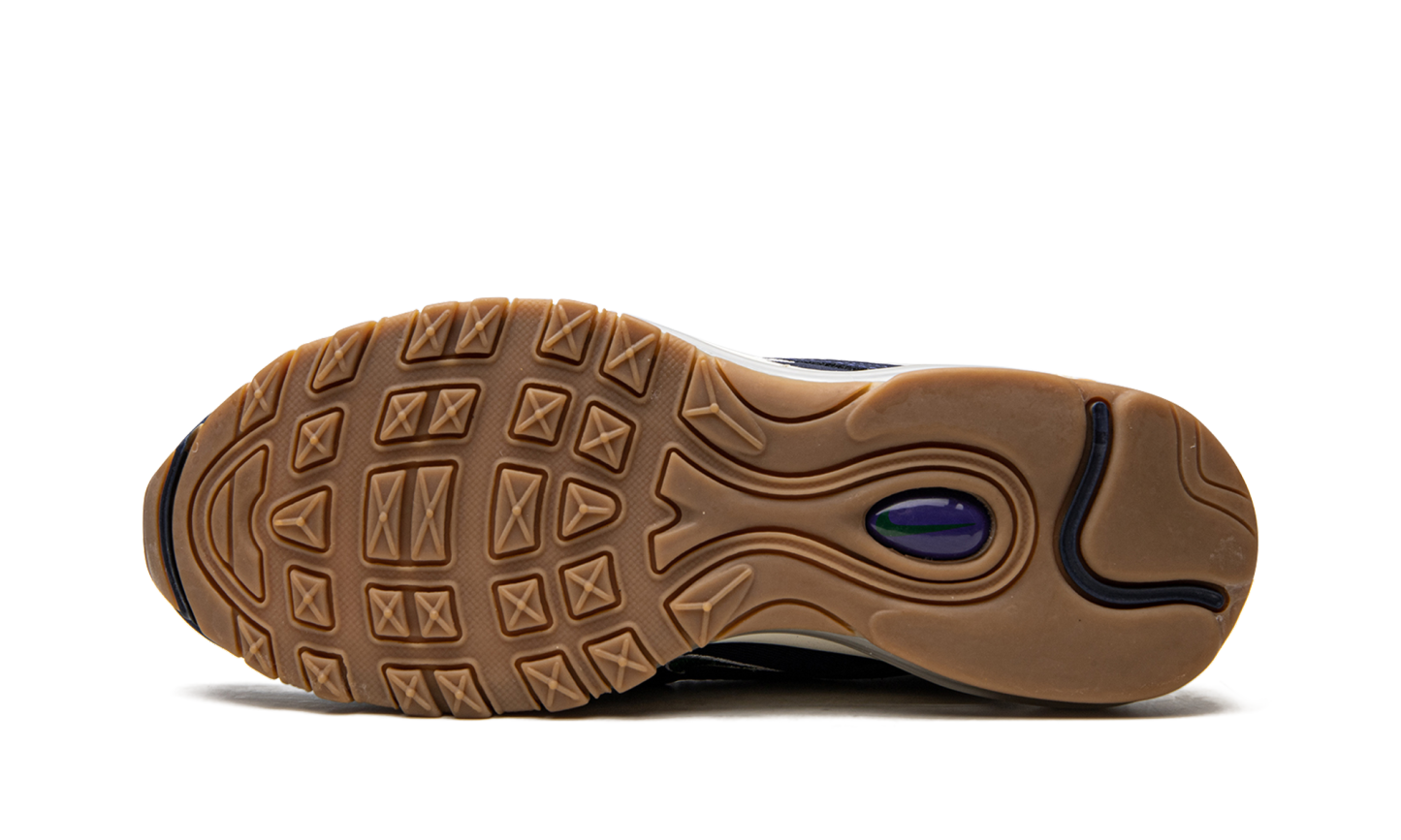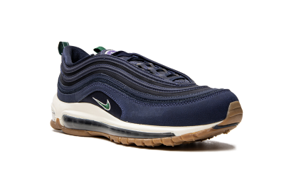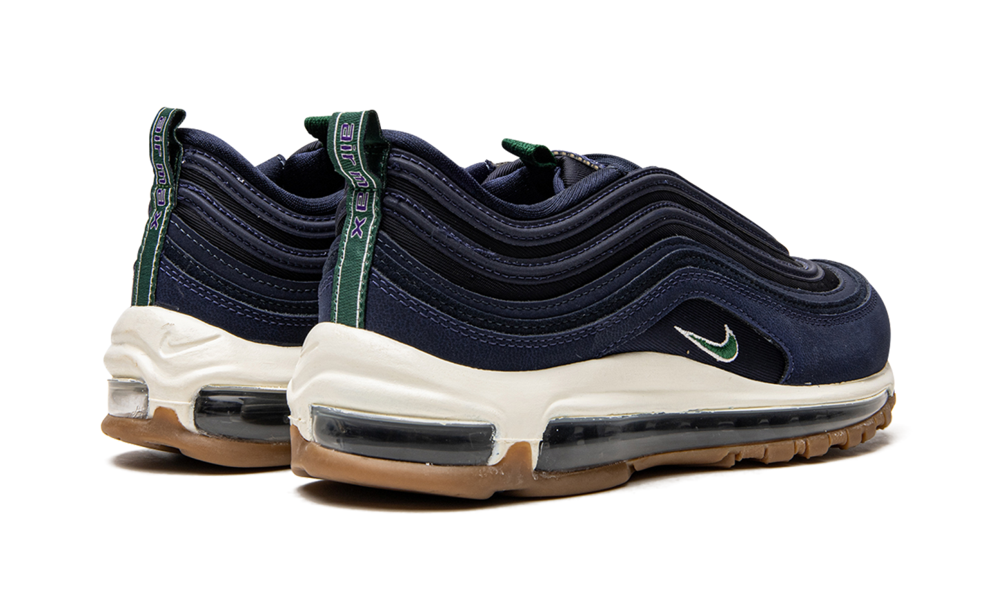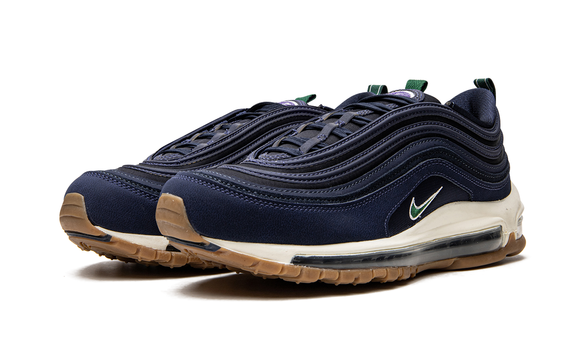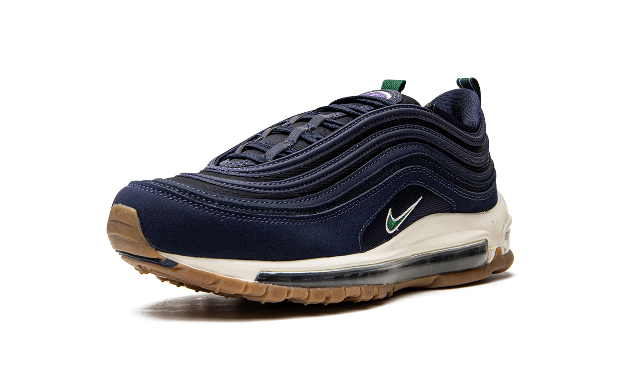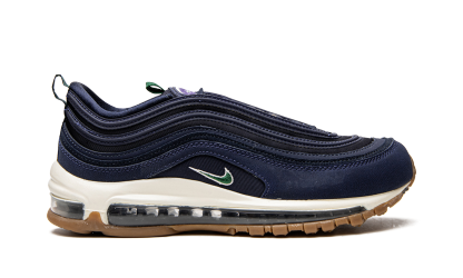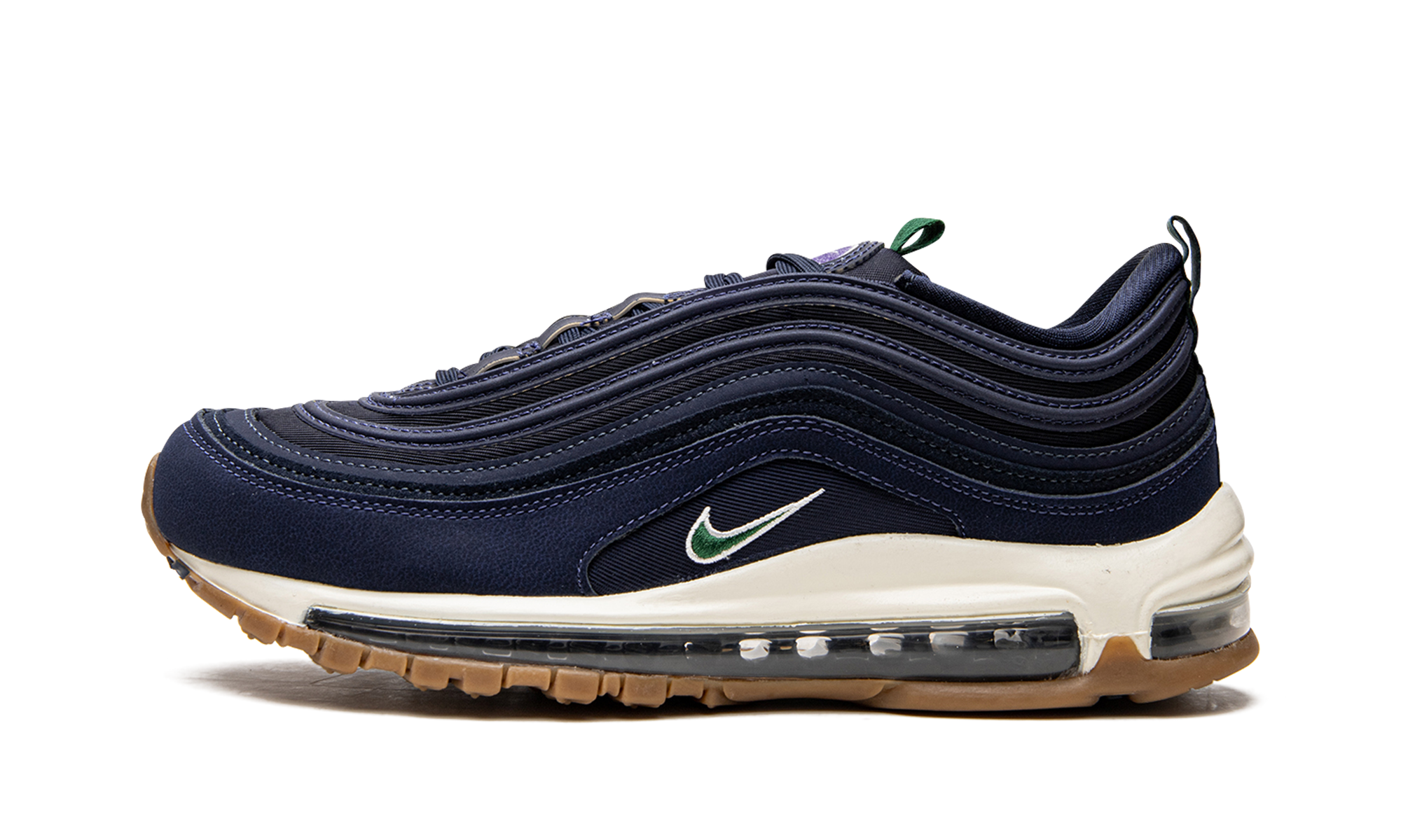 The Nike Air Max 97 “Letterman Pack” is a colorway of the vintage running shoe inspired by classic letterman varsity jackets. The Air Max 97 turns 25 years old in 2022, and part of Nike’s celebrations for the model included releasing this colorway, the “Letterman Pack.” Design wise, the shoe features wavy navy blue leather overlays against a tonal mesh base. A small green Swoosh is embroidered on either side of the shoe above the white foam midsole. Additional “Nike” and Swoosh detailing comes into play on the tongue patch and on the nylon heel overlay. Full-length visible Max Air cushioning technology in the midsole provides a responsive ride. Letterman Pack
