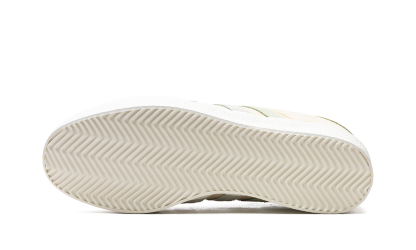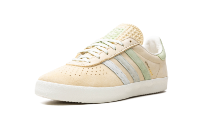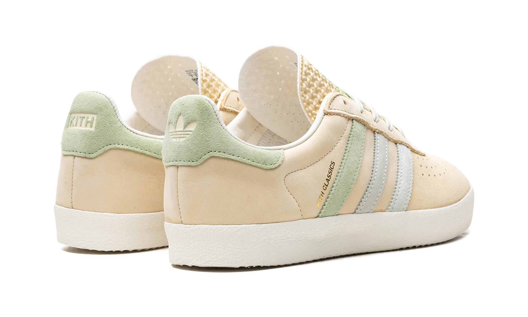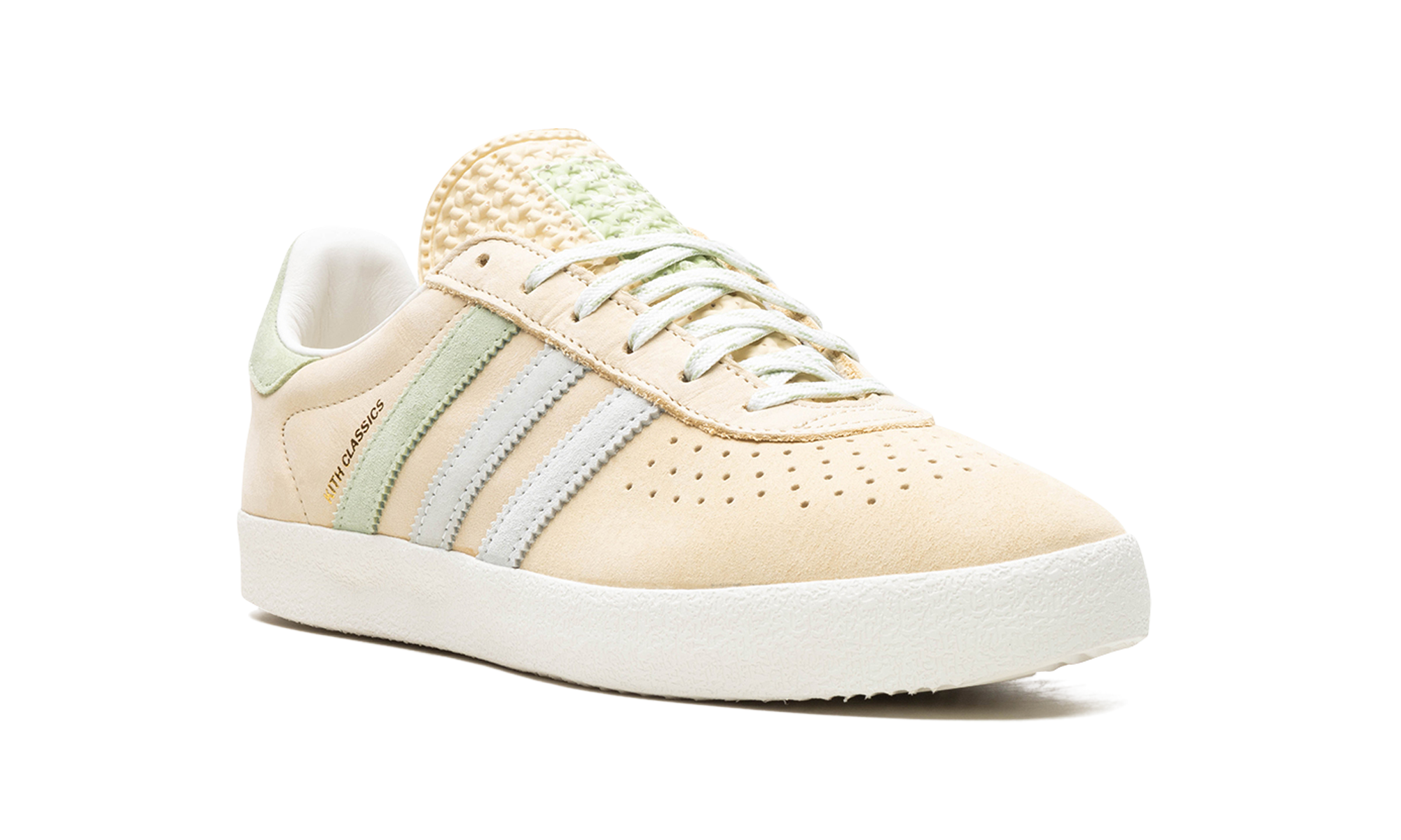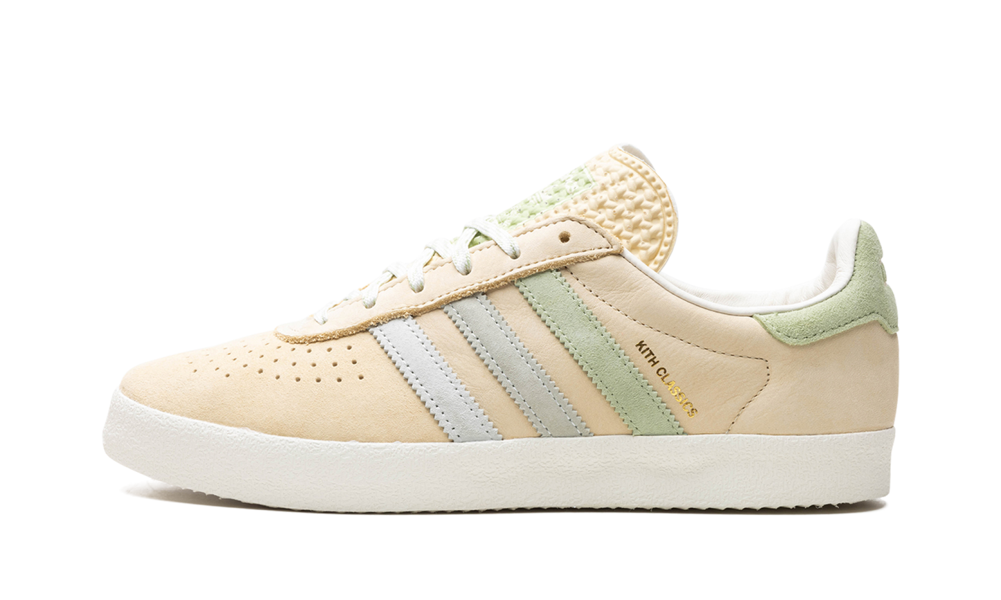 The Kith x adidas AS350 “Classics Program - Arctic Fusion” is a collaboration between Ronnie Fieg’s sneaker boutique and adidas on the classic shoe. The adidas AS350 is a retro that was originally made strictly for the Japanese market in the late 1970s and early 1980s. The model returned via collaborations with Kith in 2024. The “Arctic Fusion” colorway has a Pale Yellow leather construction with gradient blue and green suede Three Stripes on the sides. A gold “Kith Classics” logo is stamped on the lateral side of the shoe, and “Kith” and “adidas” logos appear on the left and right heel tab, respectively. A white vulcanized rubber sole completes the look.