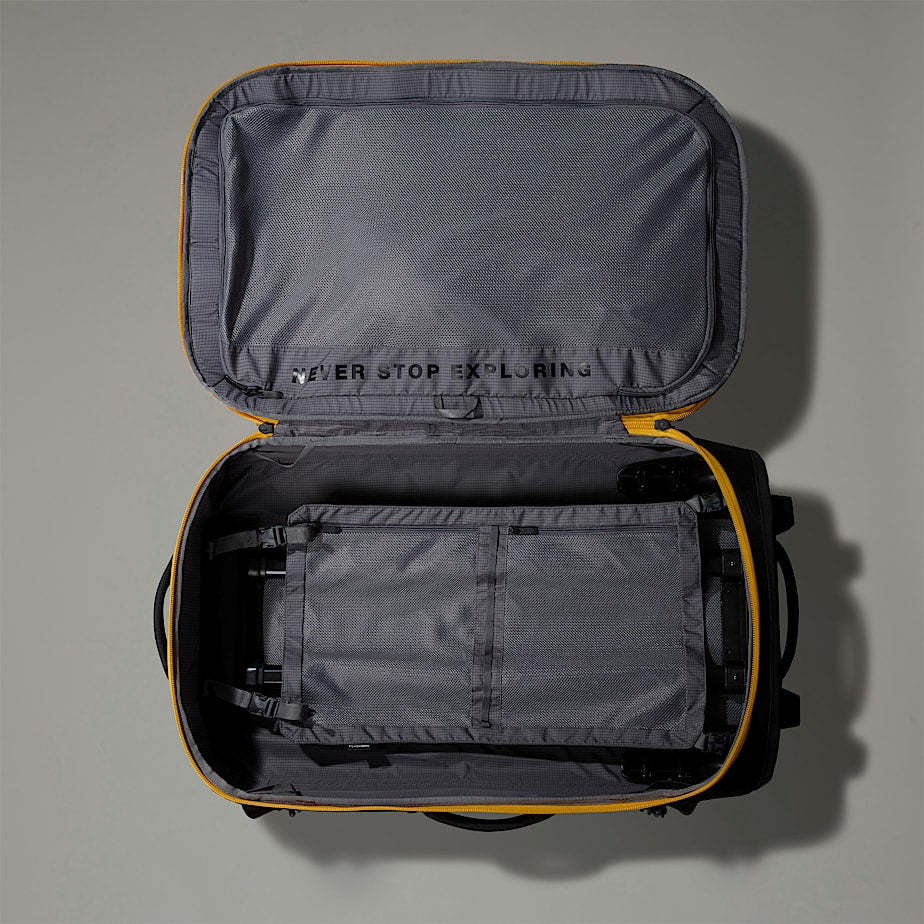 - Super-tough and versatile, the Base Camp Rolling Thunder 28" blends both mountain durability and high-level organisation for frequent flying or weekend adventures. Its 95-litre volume is roomy enough for the average two-week holiday or a gear-loaded weekend adventure. And being made from ultra-durable recycled Base Camp fabric with an improved hard-shell chassis designed to handle travelling around the world over and over again, it stands up to long-term, rugged use – just like its predecessor. The custom-moulded wheels make light work of rolling, even on gravelly terrain. Webbing compression straps let you secure belongings or compress the bag when it's not full. And padded side and top handles are super-comfortable and allow for multiple carrying positions. There are tonnes of pockets for travel essentials and dirty clothes, as well as webbing points that allow you to clip on additional items. If you need to save space, you can push down clothing using the internal compression panel. Plus, to keep valuables safe, the zip is lockable, giving you peace of mind when your main focus is the end destination.