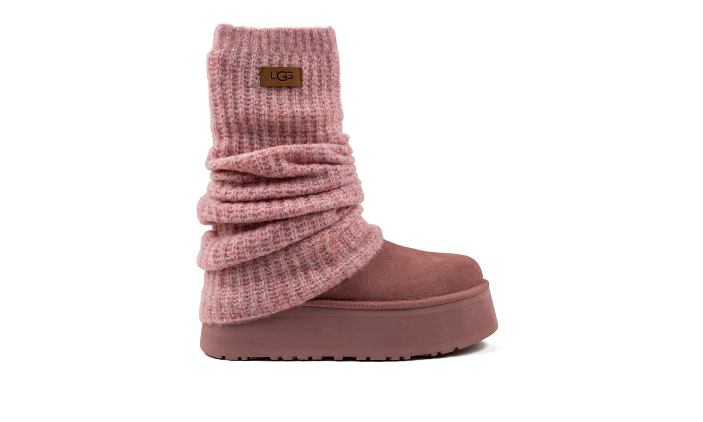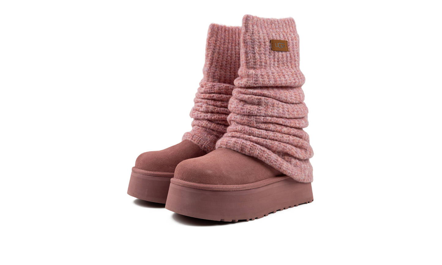 Step into cozy texture and style with the UGG Classic Mini Dipper Legwarmer Boot Wmns "Pink Dawn". This women's boot features a soft suede upper and a flexible knit legwarmer cuff. The bold, dipped platform sole and plush UGGpure lining ensure supreme warmth and comfort, making it a perfect choice for stylishly navigating cold weather.