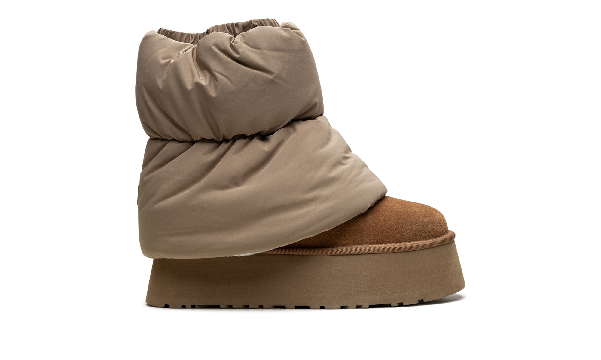 Step into luxurious height with the UGG Classic Mini Dipper Puffer Boot Wmns "Amphora / Chestnut". This women's boot features a quilted puffer upper and a bold, dipped platform sole for a modern lift. The plush UGGpure lining ensures supreme warmth and comfort, making it a perfect choice for stylishly navigating cold weather.