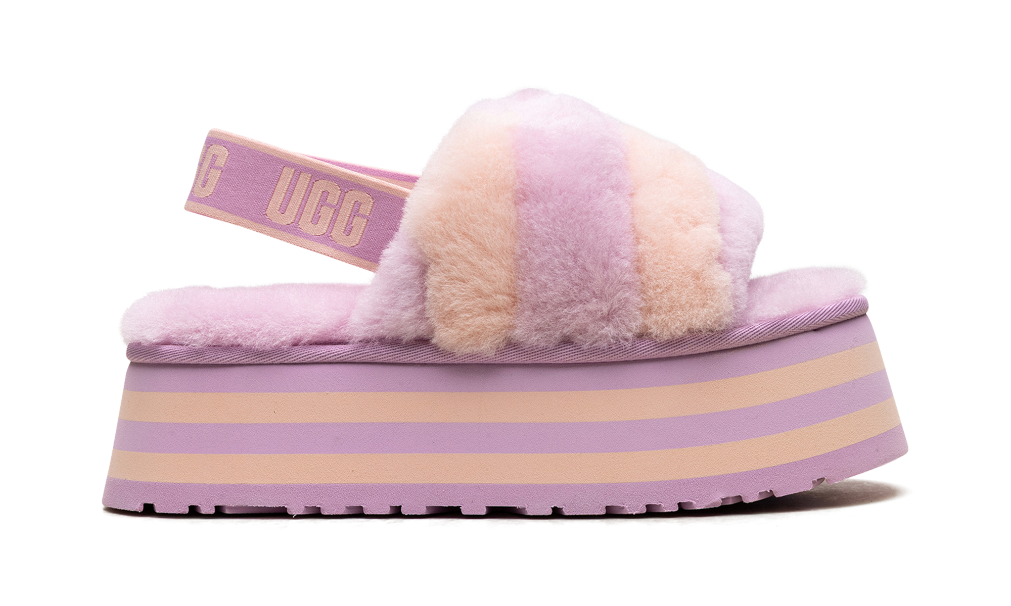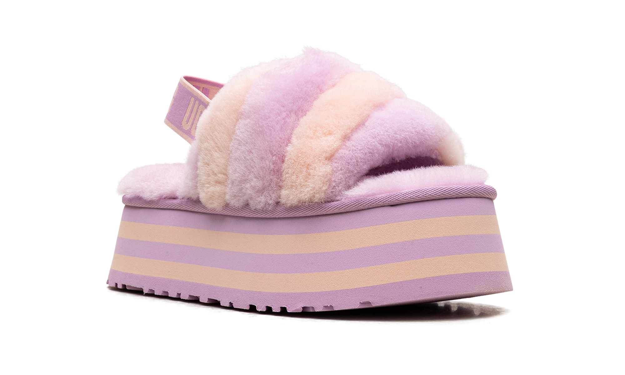 Step into maximum fun with the UGG Disco Stripe Slide Wmns "Purple / Pink". This women's slide features an exaggerated platform sole and a thick, plush sheepskin upper with bold stripes. The vibrant purple and pink colors deliver ultimate comfort and a playful aesthetic, perfect for making a stylish statement indoors or out.