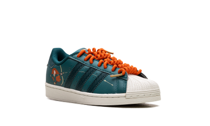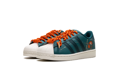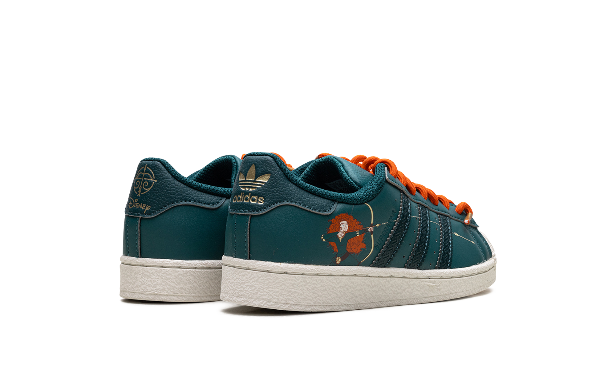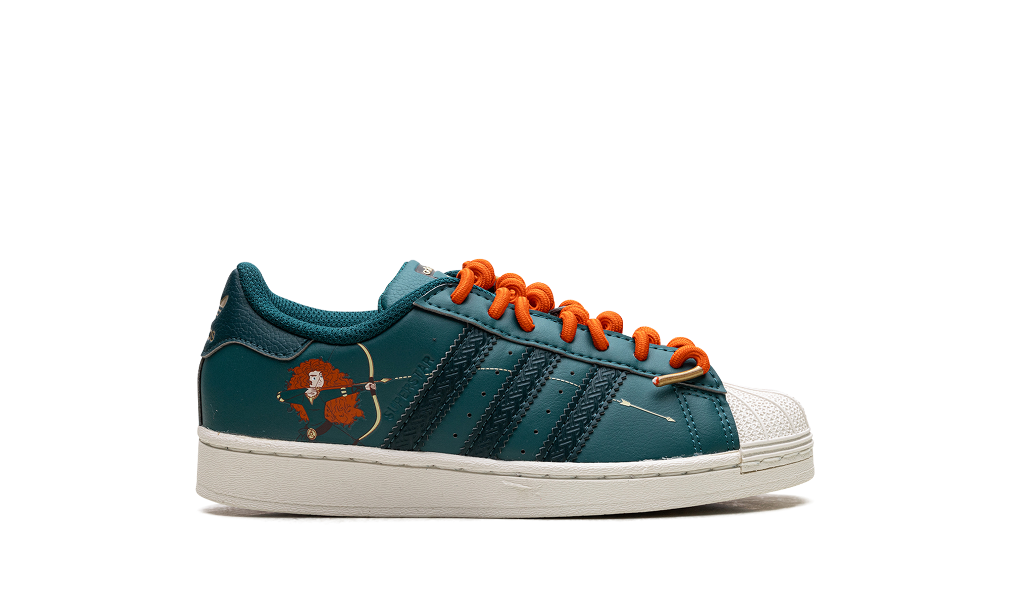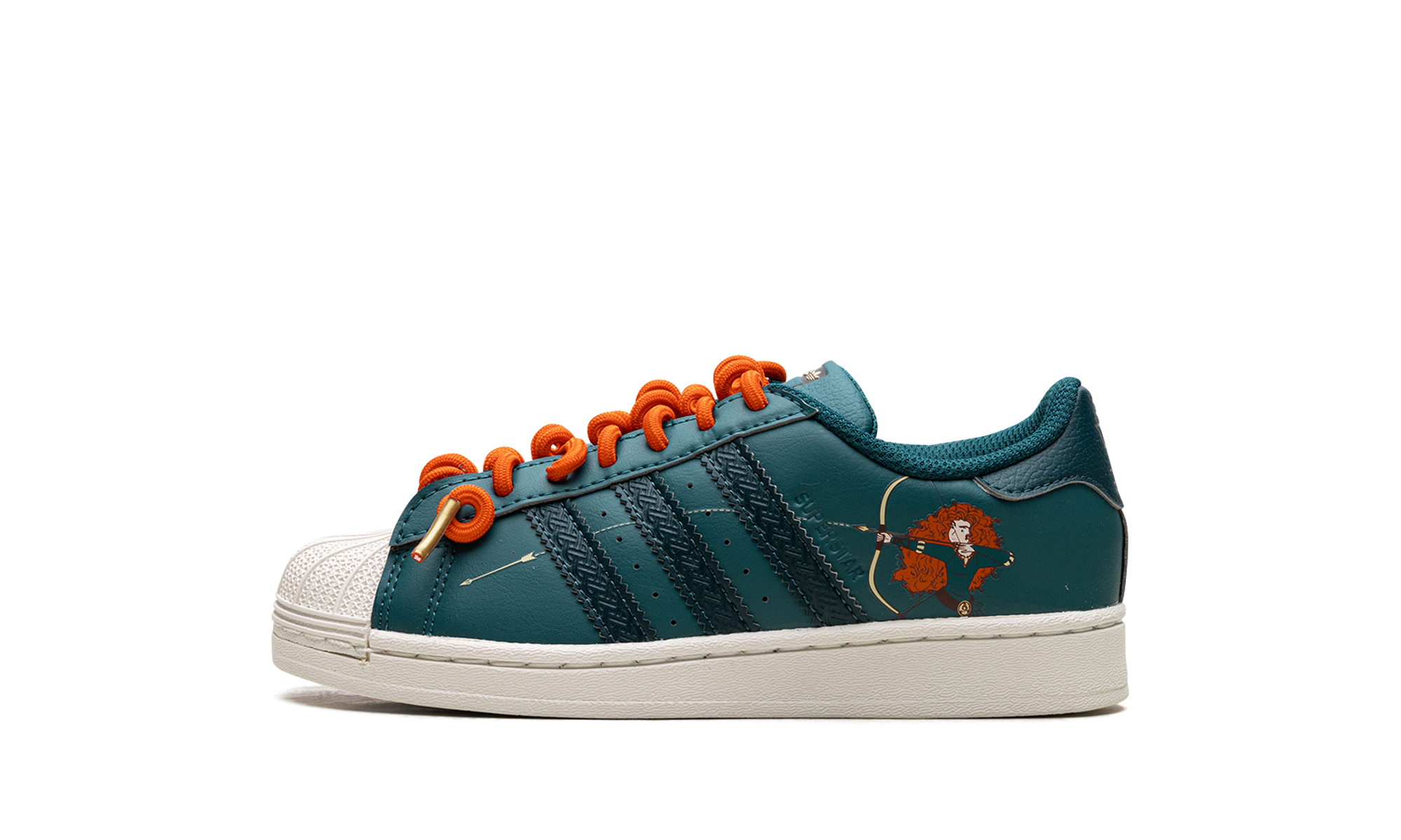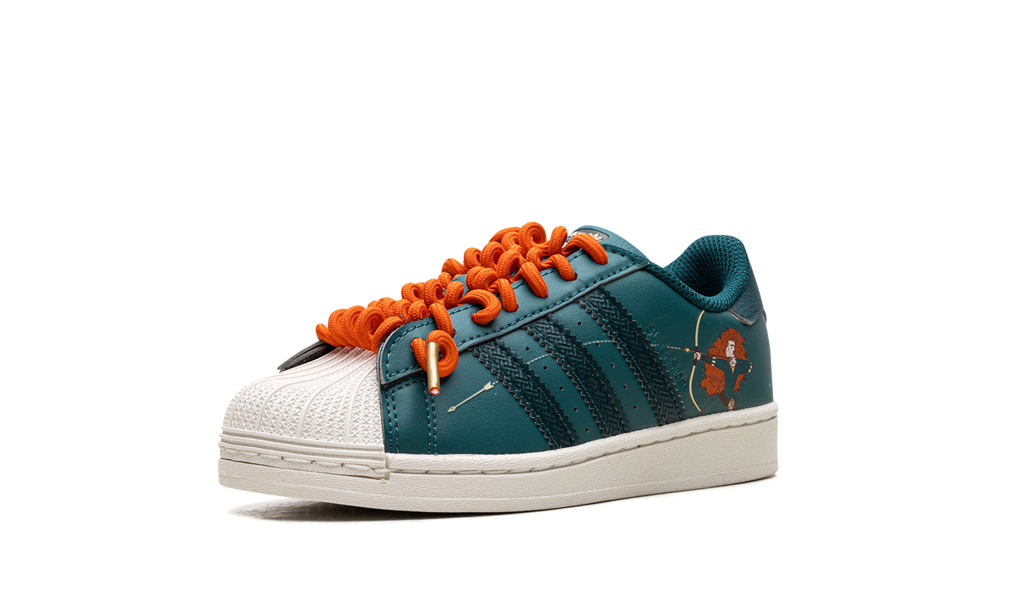 The Disney X Superstar C 'Brave / Princess Merida' shoe features a design inspired by Disney's Princess Merida, blending classic Adidas Superstar style with unique details from the movie "Brave."