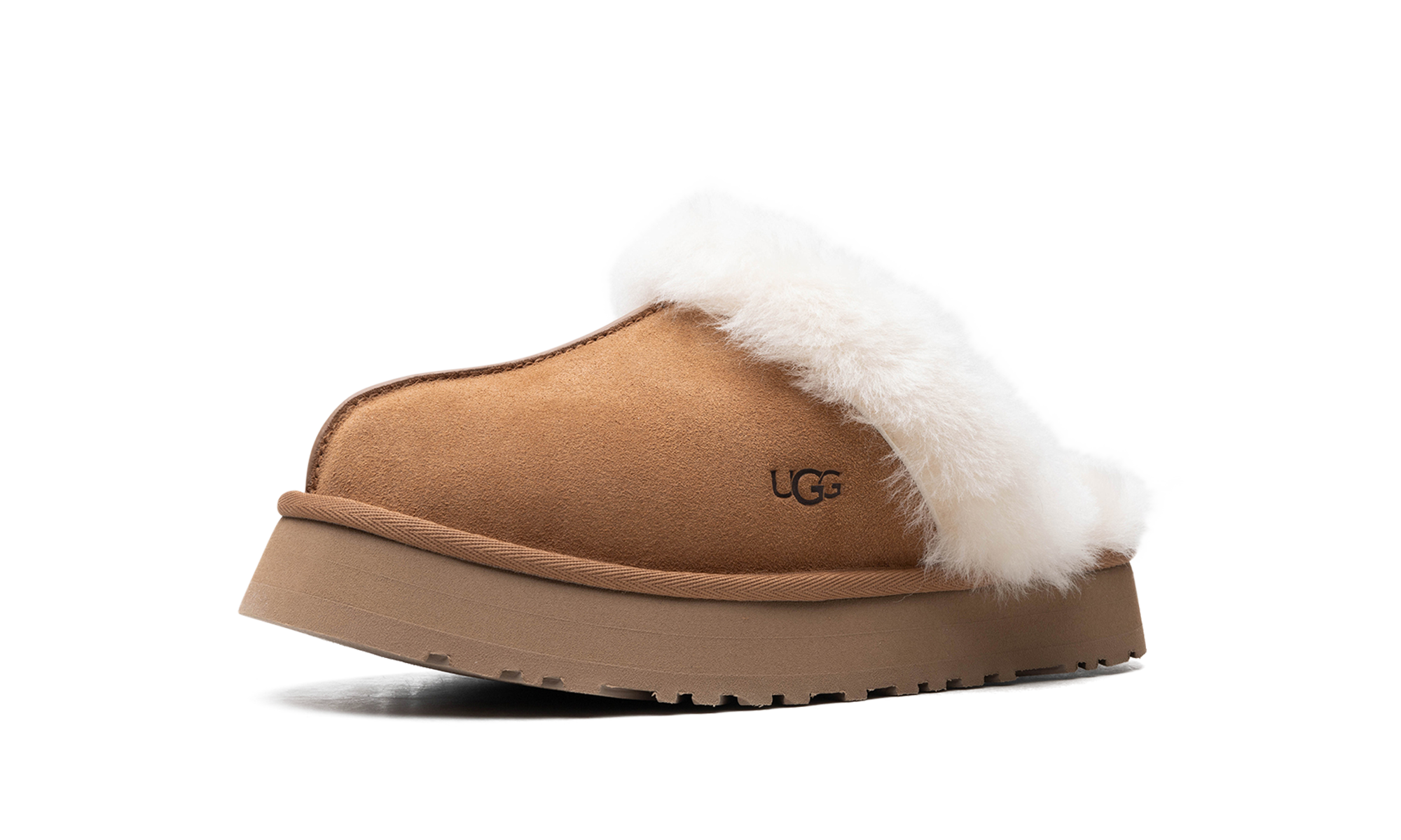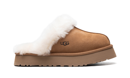 The Women’s UGG Disquette “Chestnut” is the women’s sizing of the slip-on moccasin with a platform sole and fluffy sheepskin lining. The UGG Disquette can be worn indoor or outdoors and has a slipper-style construction with a warm inner lining of plush sheepskin. The upper features a Chestnut-colored suede design. Ugg branding appears on the lateral side. The Chestnut EVA foam sole has an exaggerated, platform-style height and a traction pattern outsole for grip on a variety of surfaces.