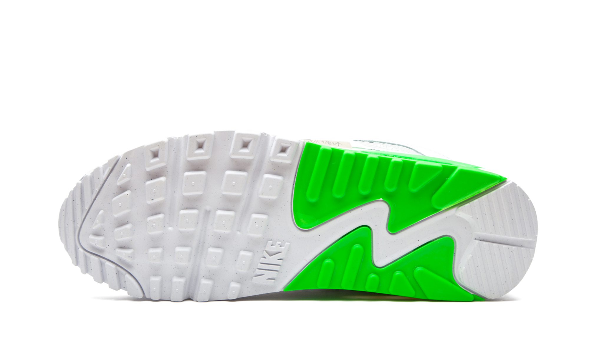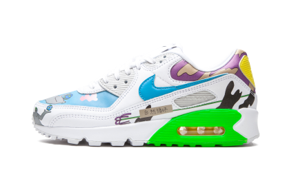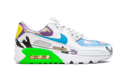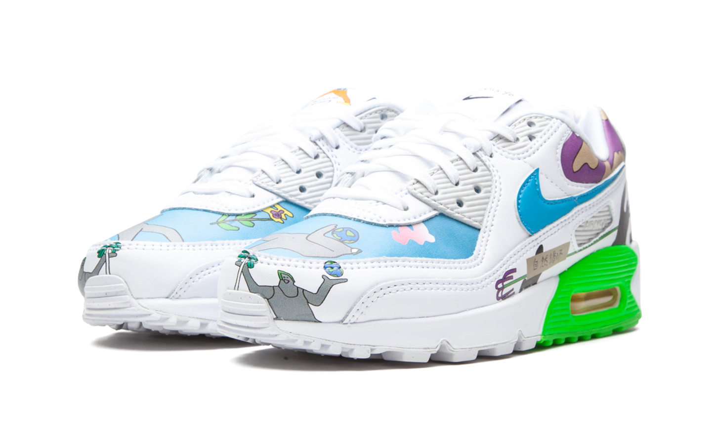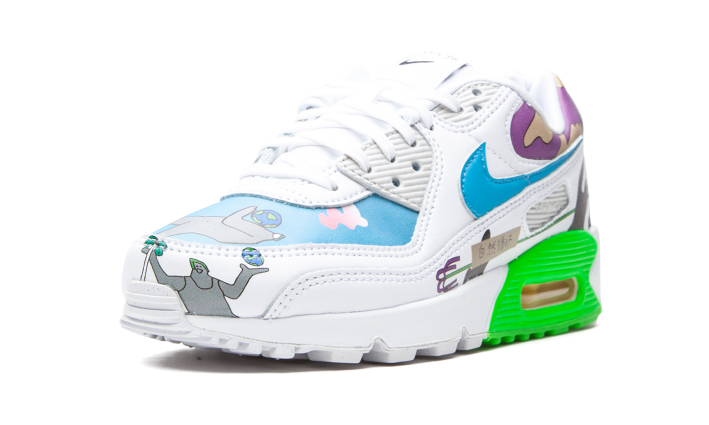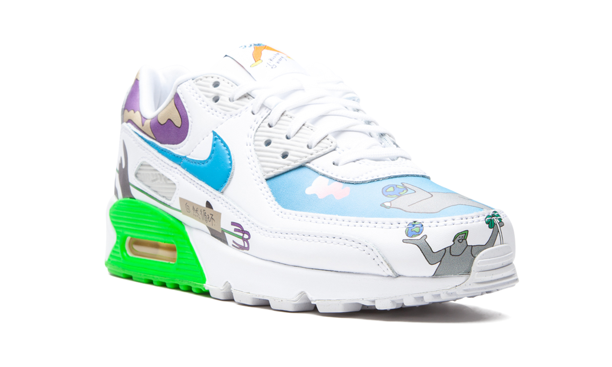 The Ruohan Wang x Nike Air Max 90 Flyleather is part of an abstract collaboration between the Berlin artist and Nike on one of the brand’s most timeless models. A September 2020 release, the Air Max 90 Flyleather is composed of at least 50% recycled materials. It features Wang’s “Earth” inspired artwork on the toe, collar, mudguard, and heel. A contrasting light blue leather Swoosh can be found on either side of the shoe. Additional pops of color on the yellow heel tab and neon green detailing that surrounds the visible Air unit in the heel breaks up the white base of the upper and midsole, respectively. Along with this vibrant rendition of the Air Max 90, Wang and Nike also produced two equally imaginative colorways of the Blazer Mid Flyleather and Air Force 1 Flyleather. Release date: September 24, 2020. Ruohan Wang