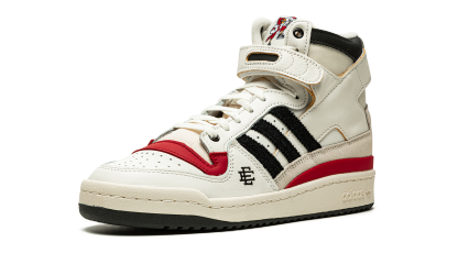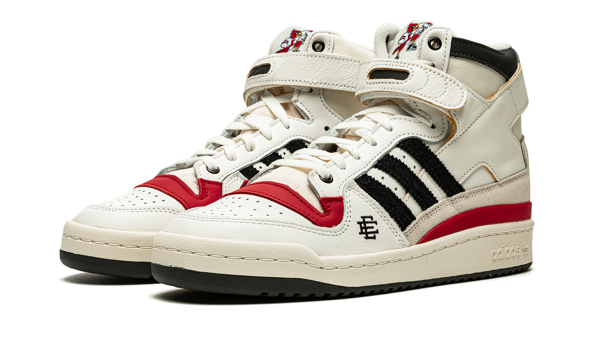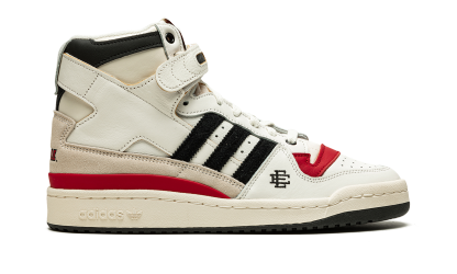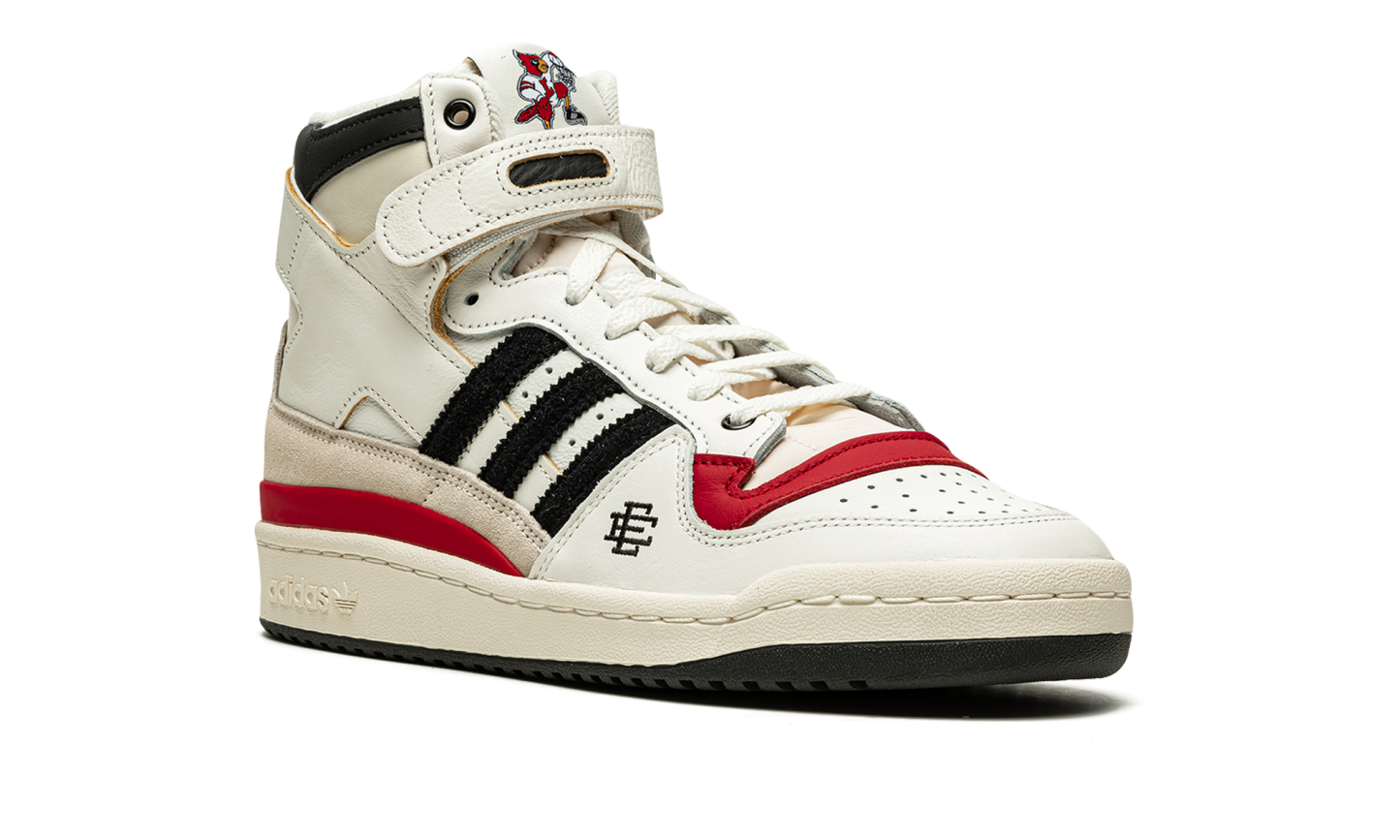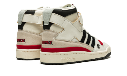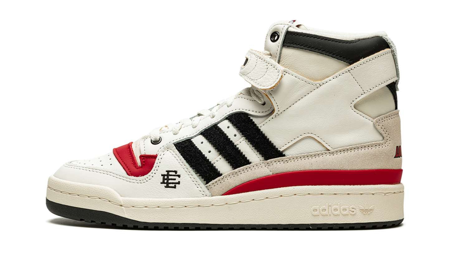 The Eric Emanuel x adidas Forum 84 Hi “Louisville” is a December 2021 collaboration by the fashion designer on the vintage basketball shoe in a colorway dedicated to the Louisville Cardinals. Emanuel’s collaboration on the Forum 84 Hi in the “Louisville” colorway is one of multiple college basketball makeups of the shoe released in 2021, which includes styles made up in the honor of the Kansas Jayhawks and Indiana Hoosiers. Here, though, the “Louisville” features mostly light cream-colored leather appearance with tonal overlays. A black felt Three Stripes branding hit appears on the sides. “Louisville” branding in red is found on the sand-colored suede heel overlay on the back of the shoe. Additional iconography exclusive to the Louisville Cardinals college basketball team appears in the form of the school’s mascot, Cardinal Bird, on the tongue tag. Navy “EE” detailing can be found on the lateral side of the forefoot. A black tumbled leather overlay appears on the collar above the adjustable white leather ankle strap. Finishing touches include a cream rubber midsole and contrasting black outsole. Release date: December 13, 2021